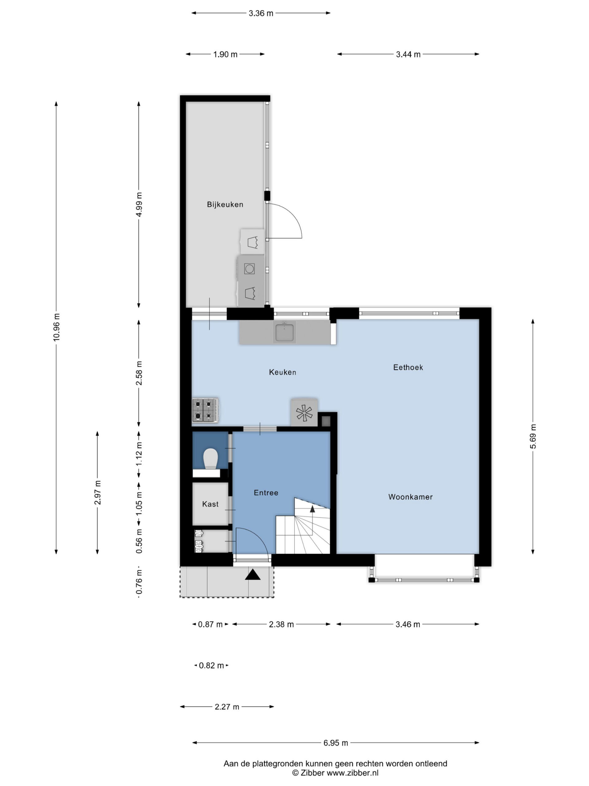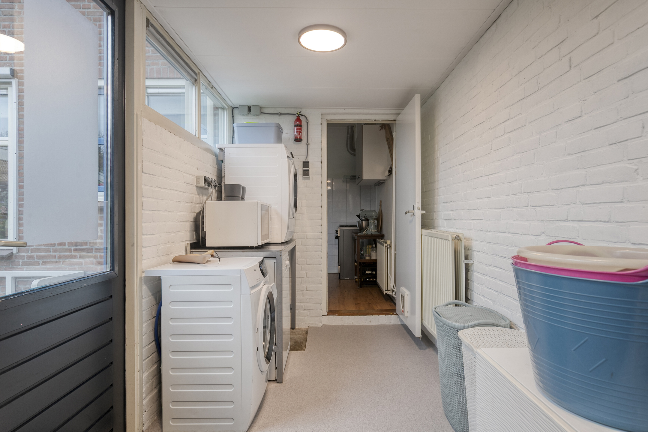 Binnenkomst in de ruime hal met de meterkast, een praktische voorraadkast, de trapopgang naar de 1e verdieping, de toegang tot de keuken en de toiletruimte, die is betegeld in een rustige kleurstelling en is voorzien van een zwevend toilet. De keuken is lekker ruim en ingericht met een keukenblok, een gasfornuis met oven en een afzuigschouw. De vaatwasser is in de bijkeuken gesitueerd. Doordat de keuken in open verbinding staat met de woonkamer heb je hier vele mogelijkheden om de keuken verder uit te breiden. Een gezellig bar of een mooi eiland? Dat kan hier gewoon! Aansluitend aan de keuken heb je de mogelijkheid een eettafel te plaatsen, of je nu voor rond, ovaal of rechthoekig kiest. De zithoek is aan de voorzijde van de woning gesitueerd en doet mede door de erker sfeervol aan. Zowel aan de voor- als achterzijde beschik je over grote ramen. De hal, keuken en woonkamer zijn voorzien van een nette laminaatvloer. Aansluitend aan de keuken bereik je de royale bijkeuken, waar je naast veel bergruimte de aansluitingen voor de was- en droogapparatuur en een deur naar de tuin treft.