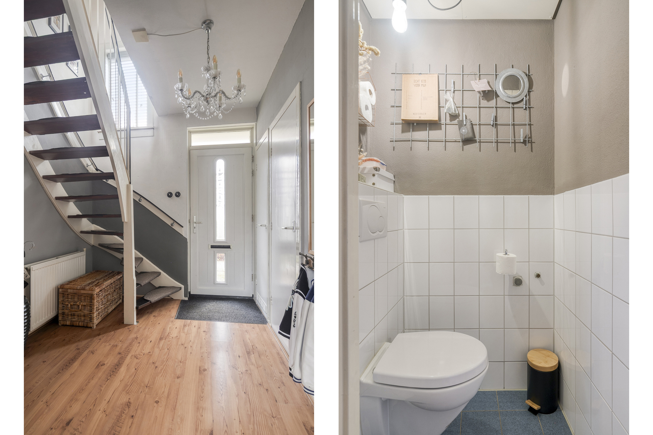Binnenkomst in de ruime hal met de meterkast, een praktische voorraadkast, de trapopgang naar de 1e verdieping, de toegang tot de keuken en de toiletruimte, die is betegeld in een rustige kleurstelling en is voorzien van een zwevend...