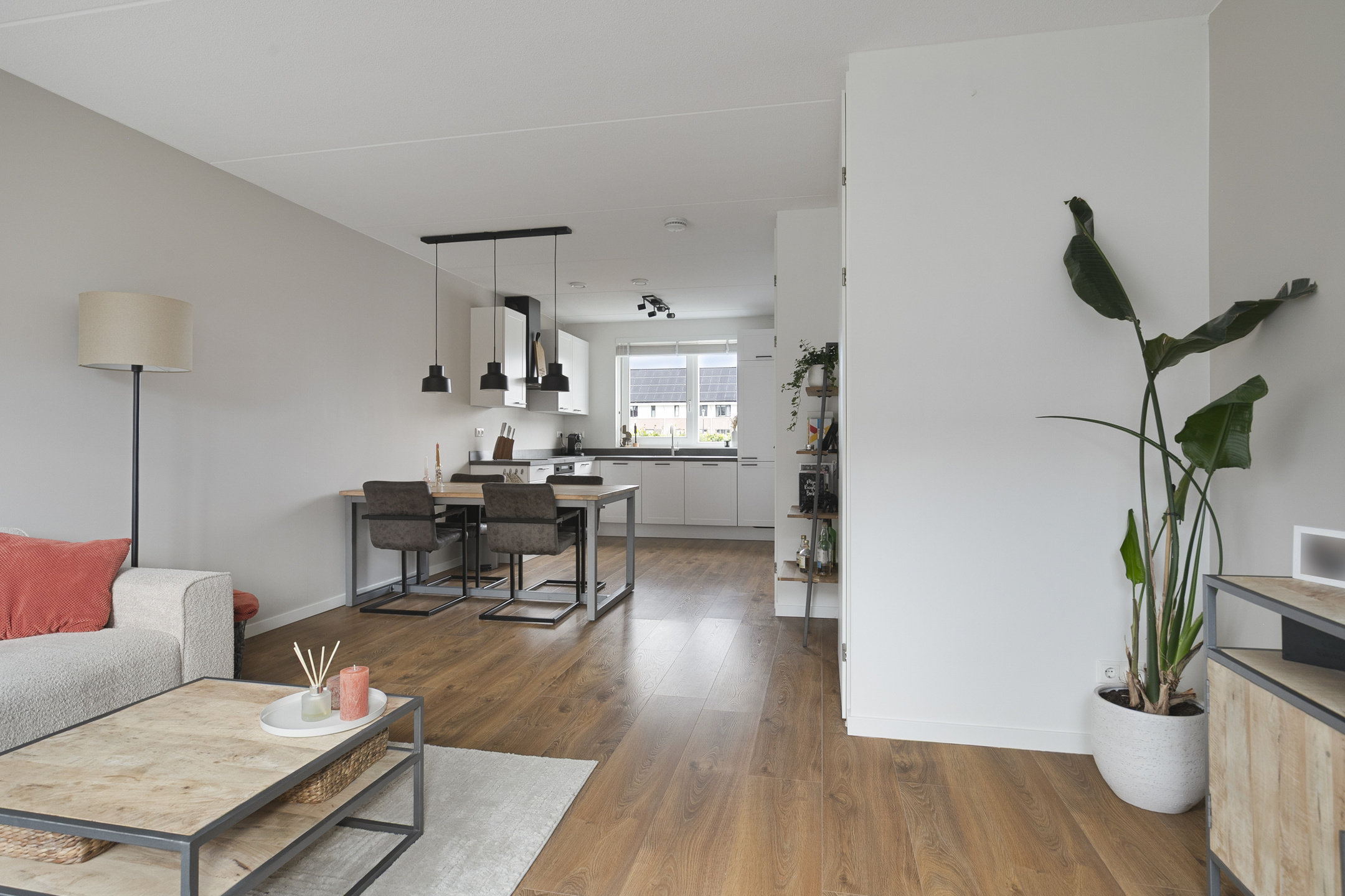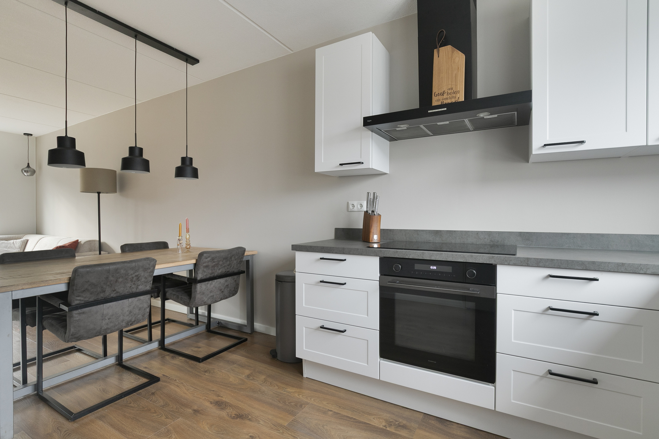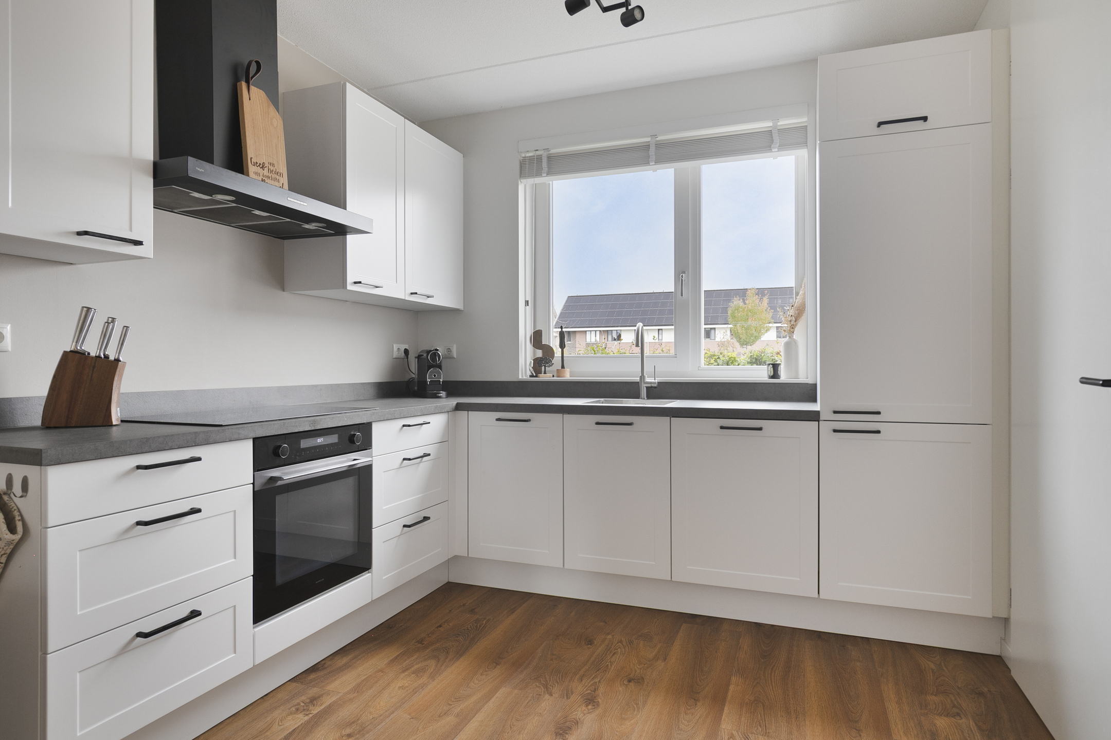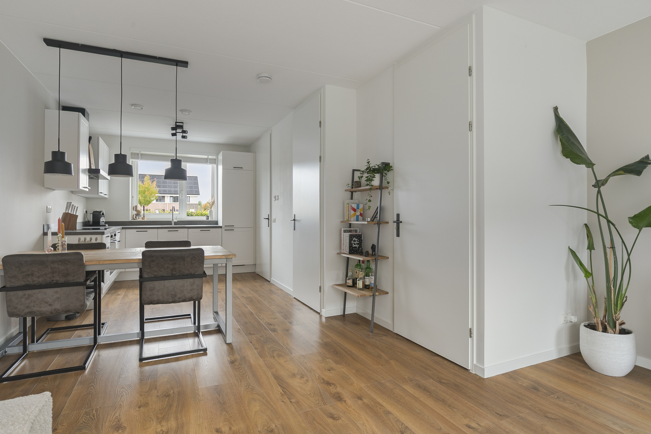 Binnenkomst in de hal met de meterkast, de garderobe, de toegang tot de keuken/woonkamer en de toiletruimte. De toiletruimte is betegeld in grijstinten en voorzien van een zwevend toilet en een fonteintje. De keuken is straatgericht en bevindt zich in een hoekopstelling. De witte fronten gecombineerd met het grijsgekleurde aanrechtblad maakt de uitstraling strak en modern. De aanwezige inbouwapparatuur betreft een koel-vriescombinatie, een vaatwasser, een combi-oven, een 4-pits inductiekookplaat en een zwarte RVS-afzuigschouw. Ter plaatse van de eethoek heb je voldoende ruimte voor het plaatsen van een eettafel, of je nu voor rechthoekig, rond of ovaal kiest. Je treft hier verder een praktische trapkast en de afgesloten trapopgang naar de 1e verdieping. De woonkamer biedt mogelijkheid voor het plaatsen van een royale bank of meerdere losse meubels en hier komt door de grote raampartijen een fijne portie daglicht binnen. De gehele begane grond is voorzien van een mooie laminaatvloer met vloerverwarming.