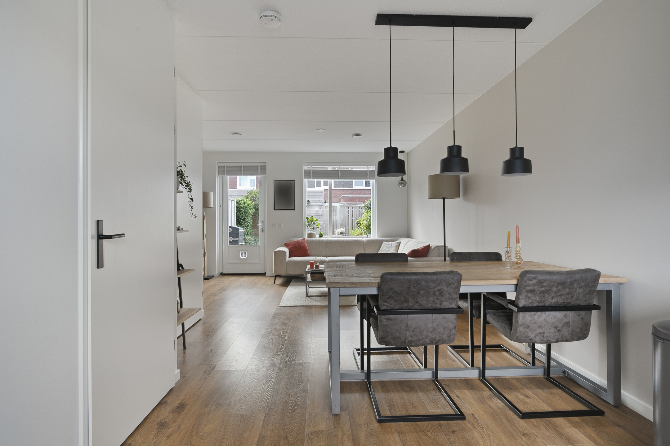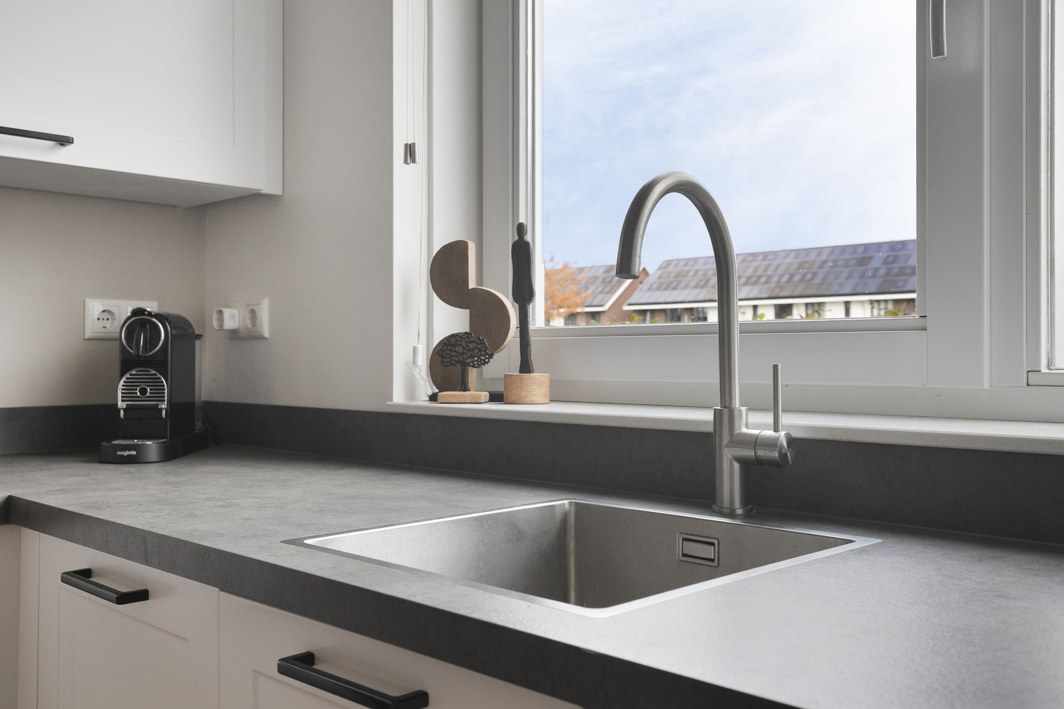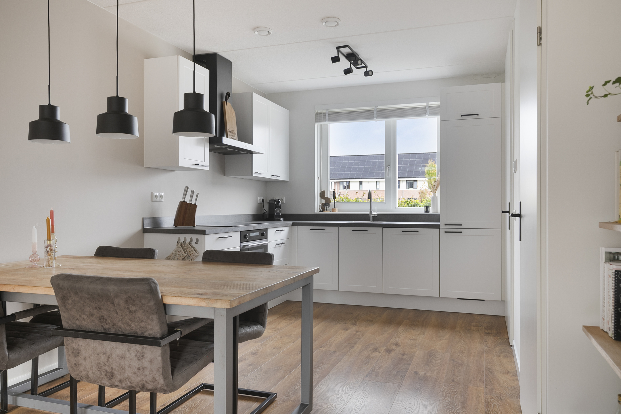 Binnenkomst in de hal met de meterkast, de garderobe, de toegang tot de keuken/woonkamer en de toiletruimte. De toiletruimte is betegeld in grijstinten en voorzien van een zwevend toilet en een fonteintje. De keuken is straatgericht en bevindt zich in een hoekopstelling. De witte fronten gecombineerd met het grijsgekleurde aanrechtblad maakt de uitstraling strak en modern. De aanwezige inbouwapparatuur betreft een koel-vriescombinatie, een vaatwasser, een combi-oven, een 4-pits inductiekookplaat en een zwarte RVS-afzuigschouw. Ter plaatse van de eethoek heb je voldoende ruimte voor het plaatsen van een eettafel, of je nu voor rechthoekig, rond of ovaal kiest. Je treft hier verder een praktische trapkast en de afgesloten trapopgang naar de 1e verdieping. De woonkamer biedt mogelijkheid voor het plaatsen van een royale bank of meerdere losse meubels en hier komt door de grote raampartijen een fijne portie daglicht binnen. De gehele begane grond is voorzien van een mooie laminaatvloer met vloerverwarming.