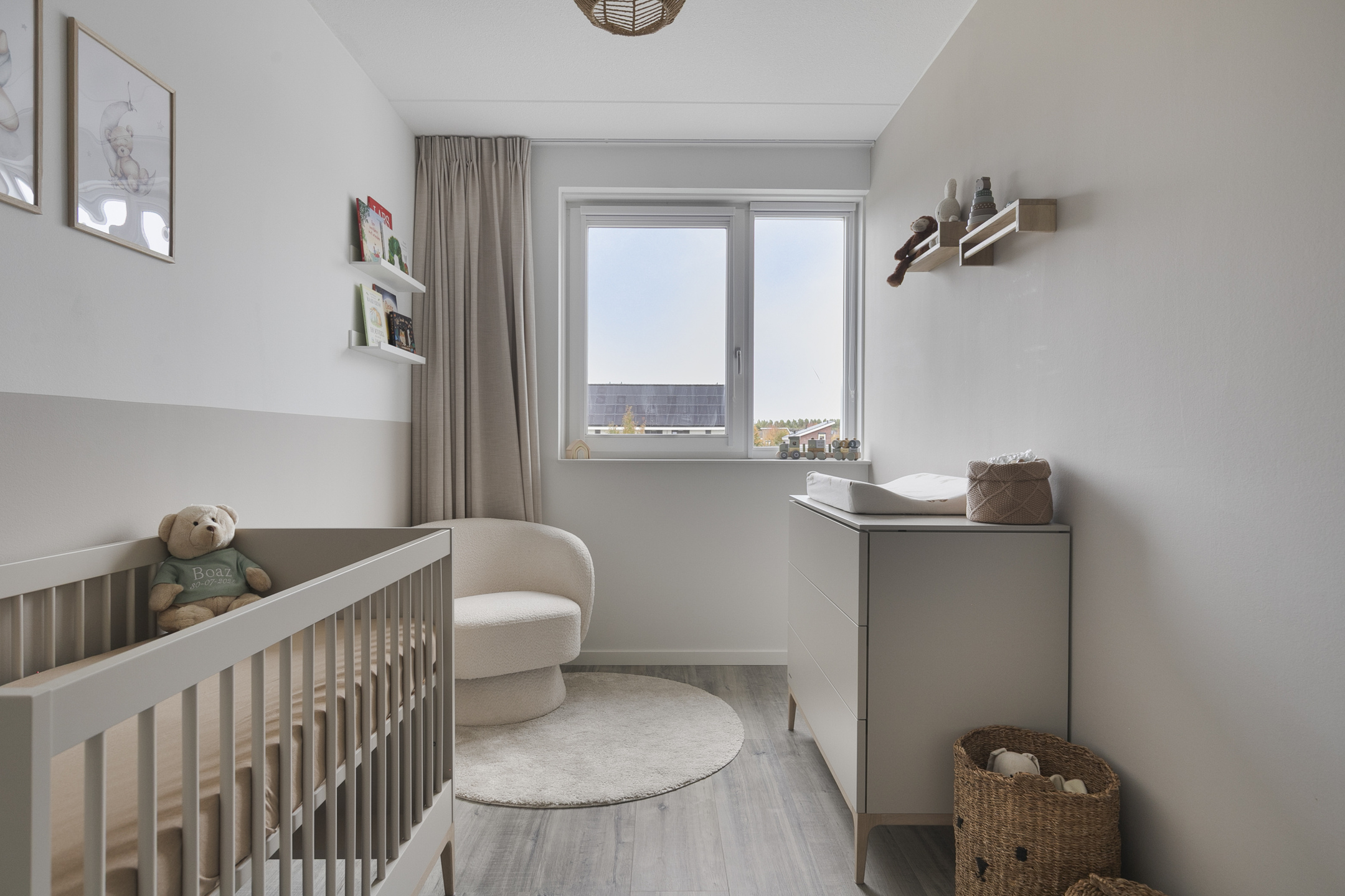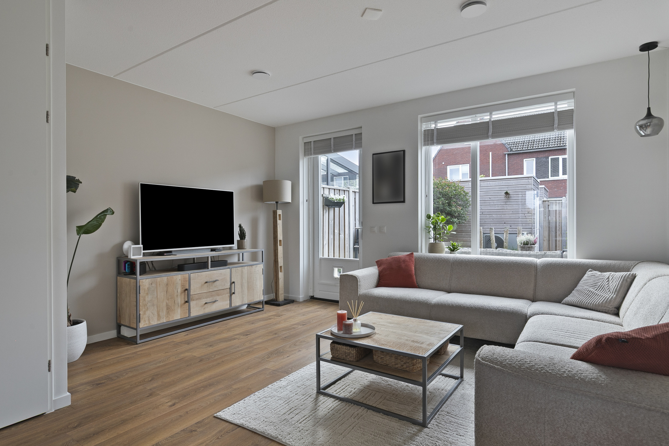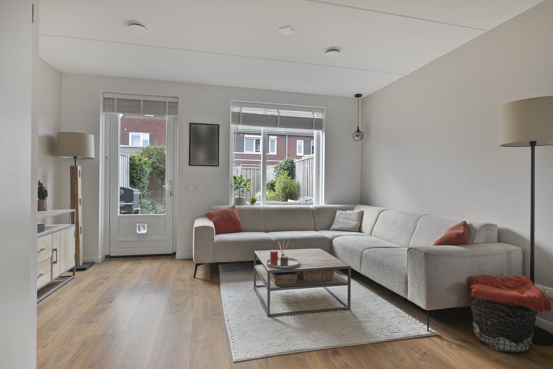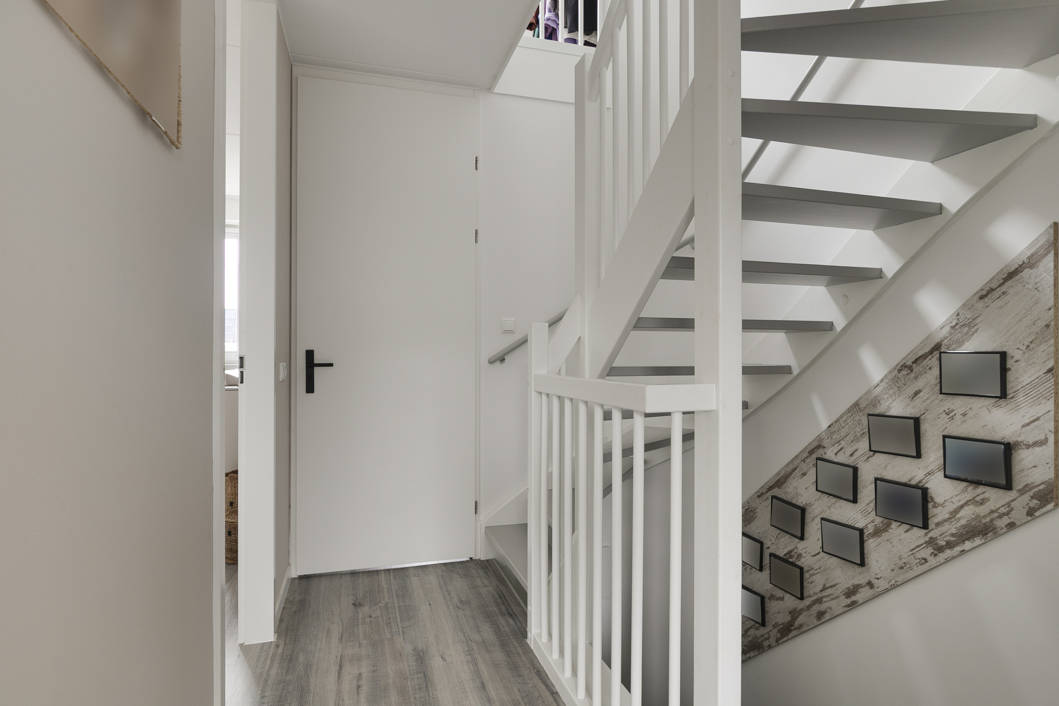 Binnenkomst in de hal met de meterkast, de garderobe, de toegang tot de keuken/woonkamer en de toiletruimte. De toiletruimte is betegeld in grijstinten en voorzien van een zwevend toilet en een fonteintje. De keuken is straatgericht en bevindt zich in een hoekopstelling. De witte fronten gecombineerd met het grijsgekleurde aanrechtblad maakt de uitstraling strak en modern. De aanwezige inbouwapparatuur betreft een koel-vriescombinatie, een vaatwasser, een combi-oven, een 4-pits inductiekookplaat en een zwarte RVS-afzuigschouw. Ter plaatse van de eethoek heb je voldoende ruimte voor het plaatsen van een eettafel, of je nu voor rechthoekig, rond of ovaal kiest. Je treft hier verder een praktische trapkast en de afgesloten trapopgang naar de 1e verdieping. De woonkamer biedt mogelijkheid voor het plaatsen van een royale bank of meerdere losse meubels en hier komt door de grote raampartijen een fijne portie daglicht binnen. De gehele begane grond is voorzien van een mooie laminaatvloer met vloerverwarming.