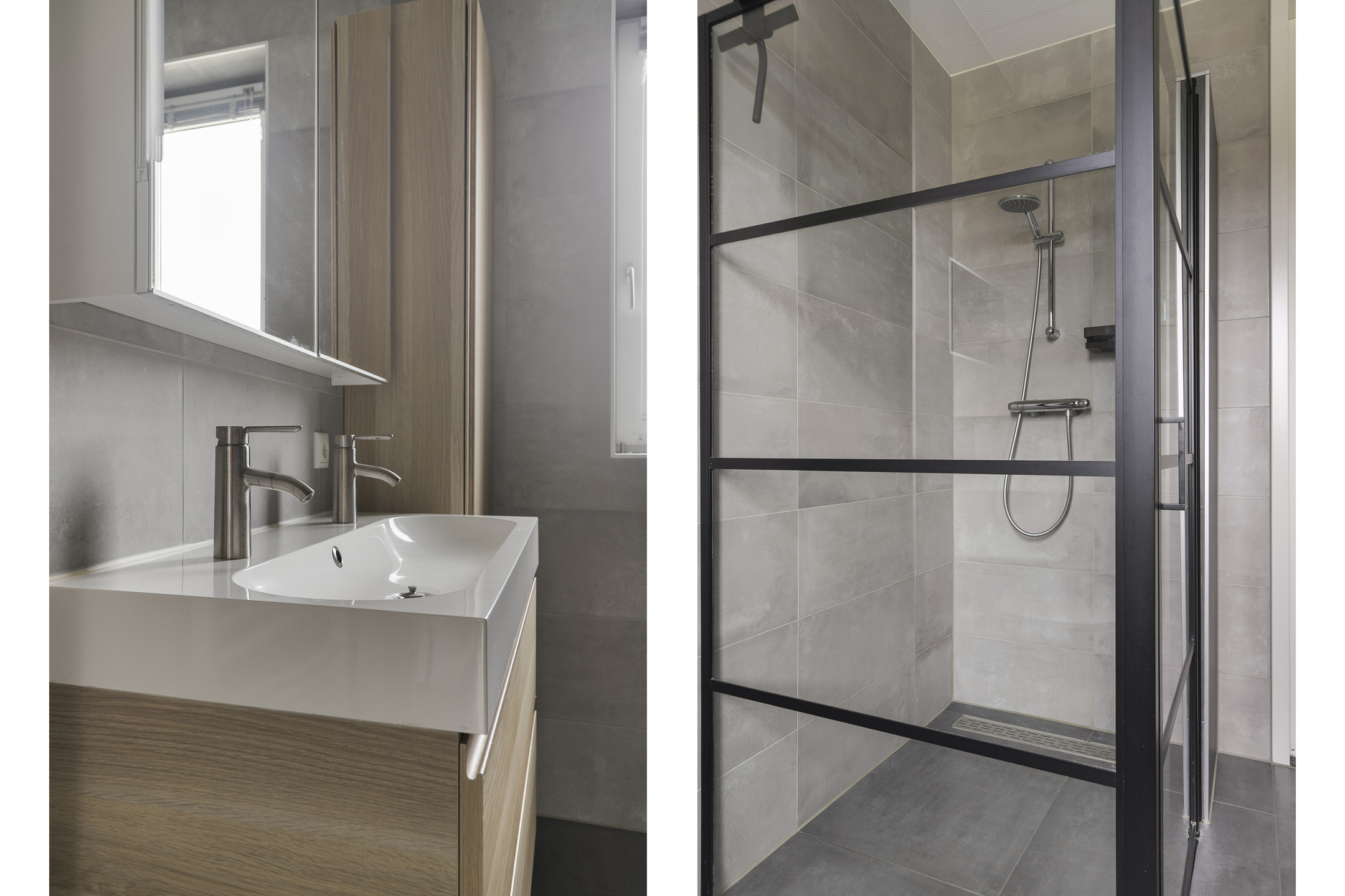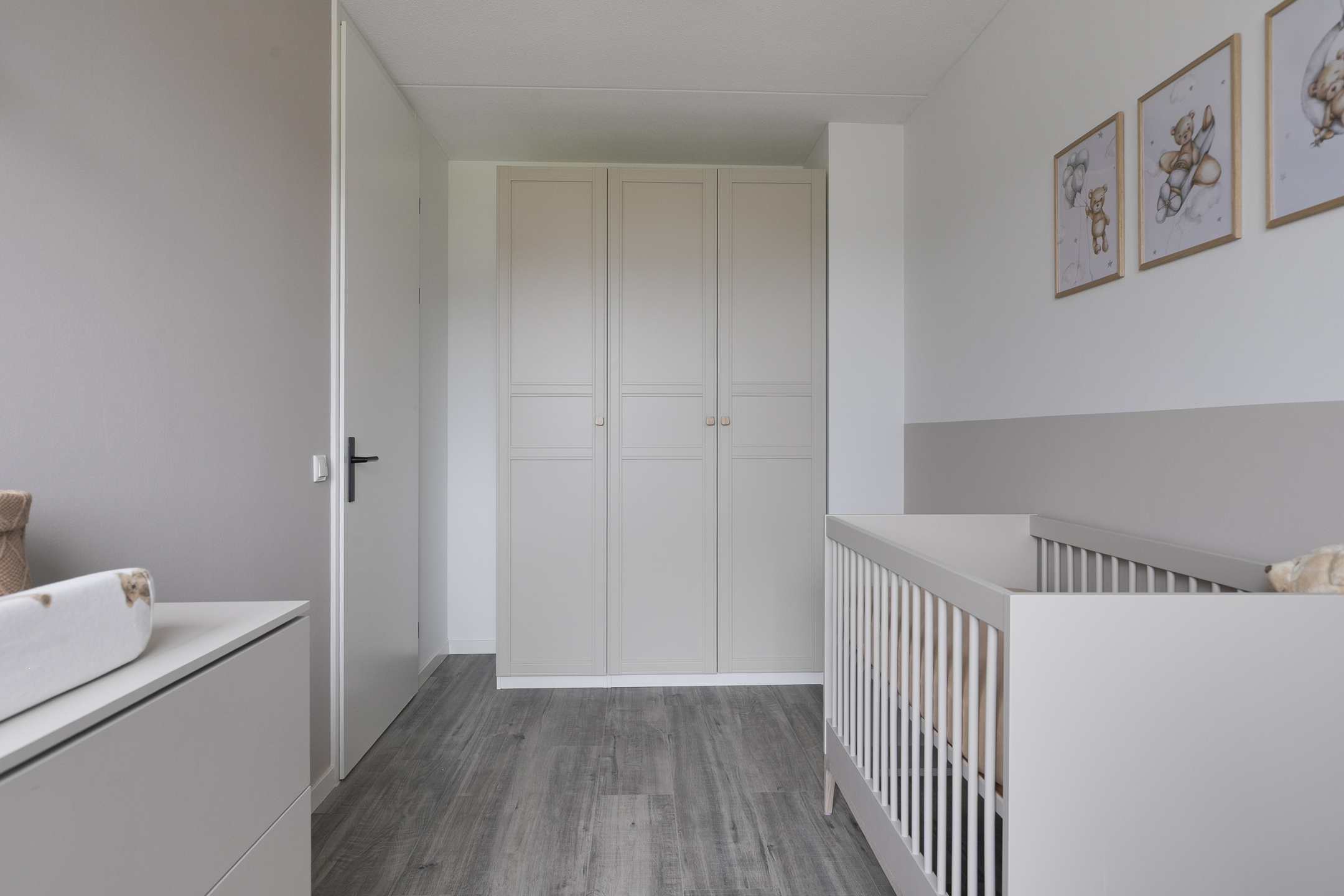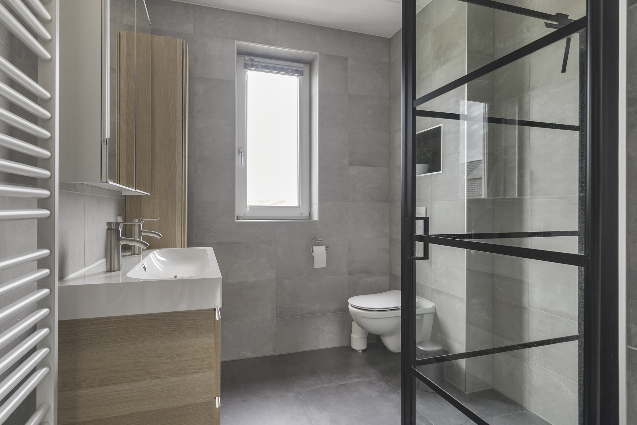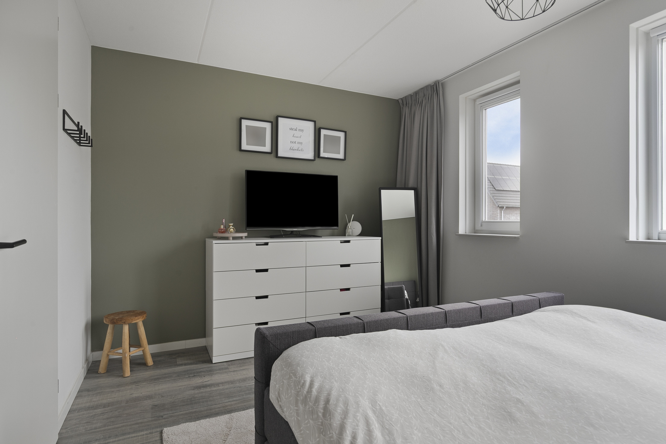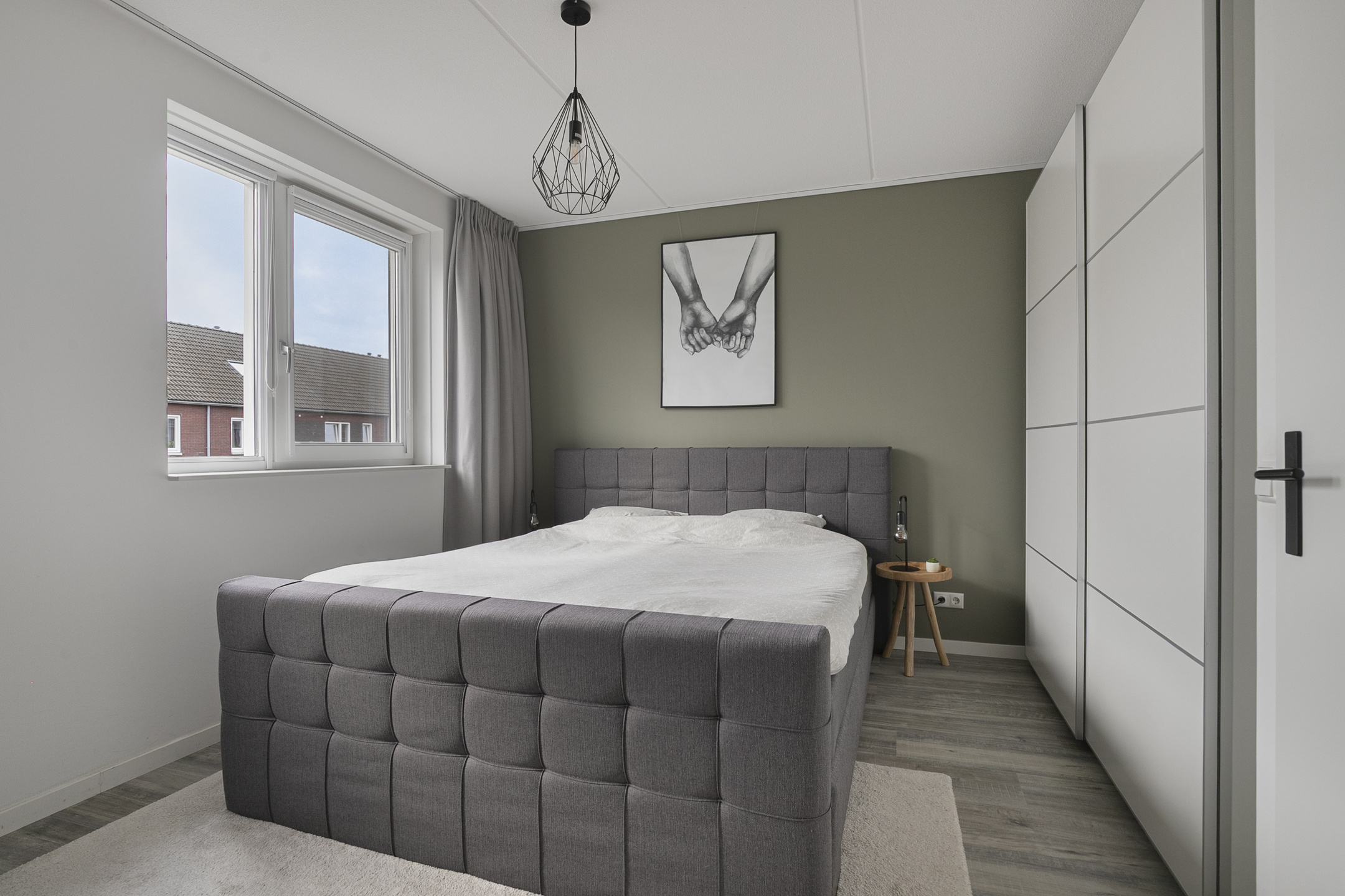 Vanaf de overloop zijn de 2 slaapkamers, de vaste trap naar de 2e verdieping en de badkamer bereikbaar. Beide slaapkamers zijn lekker ruim en bieden ruimte voor het plaatsen van een (tweepersoons)bed en een kledingkast. De grootste slaapkamer, die aan de achterzijde is gelegen, beschikt over elektrisch bedienbare rolluiken. De overloop en de slaapkamers zijn, net als de begane grond, voorzien van een laminaatvloer met vloerverwarming. De badkamer is van vloer tot plafond betegeld met grijsgekleurde tegels en is ingericht met een inloopdouche met draingoot, een dubbele wastafel met meubel, een wandkast, een designradiator, een zwevend toilet en vloerverwarming.