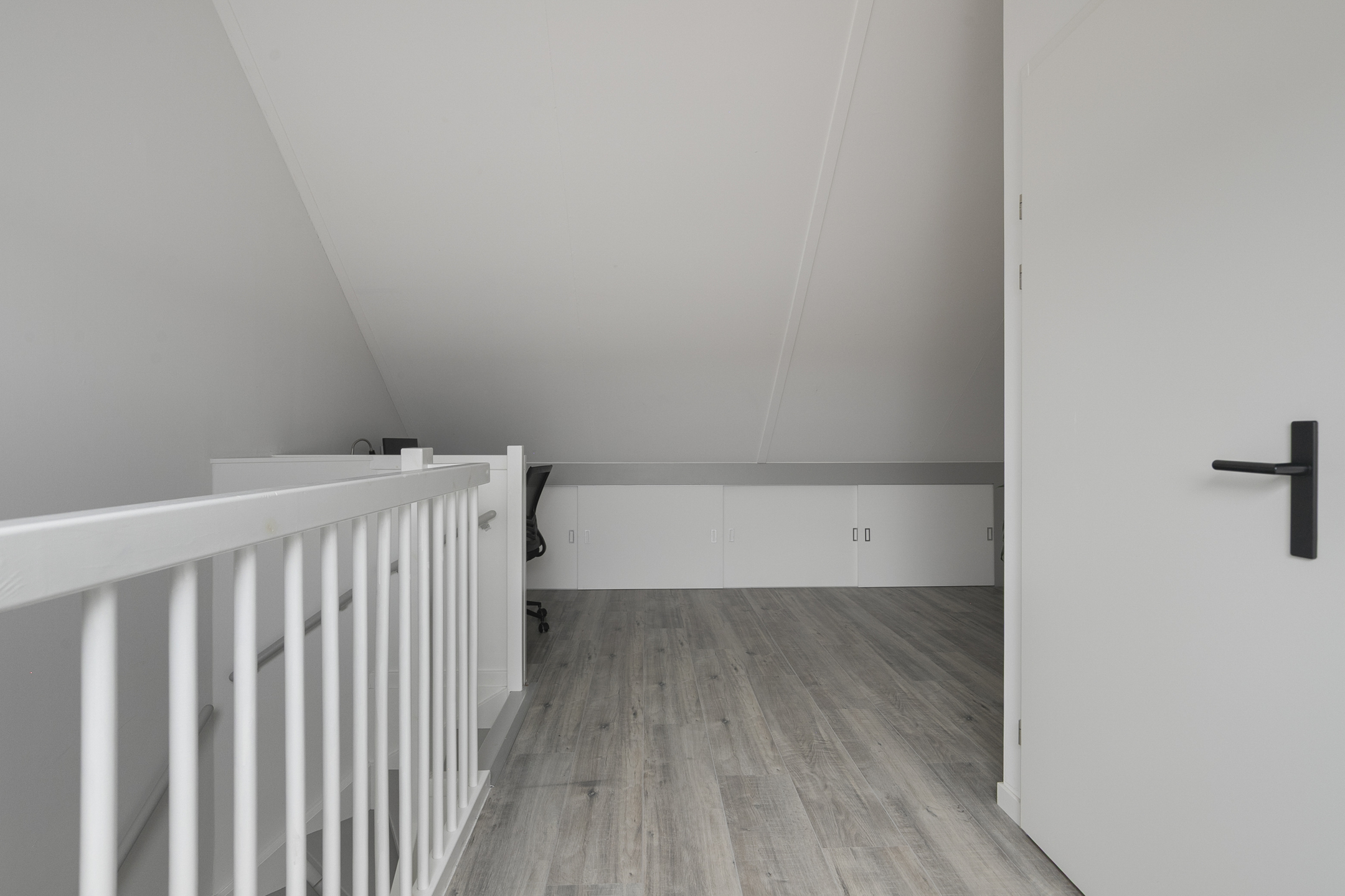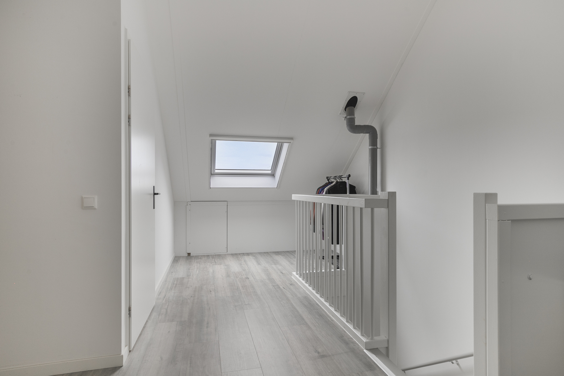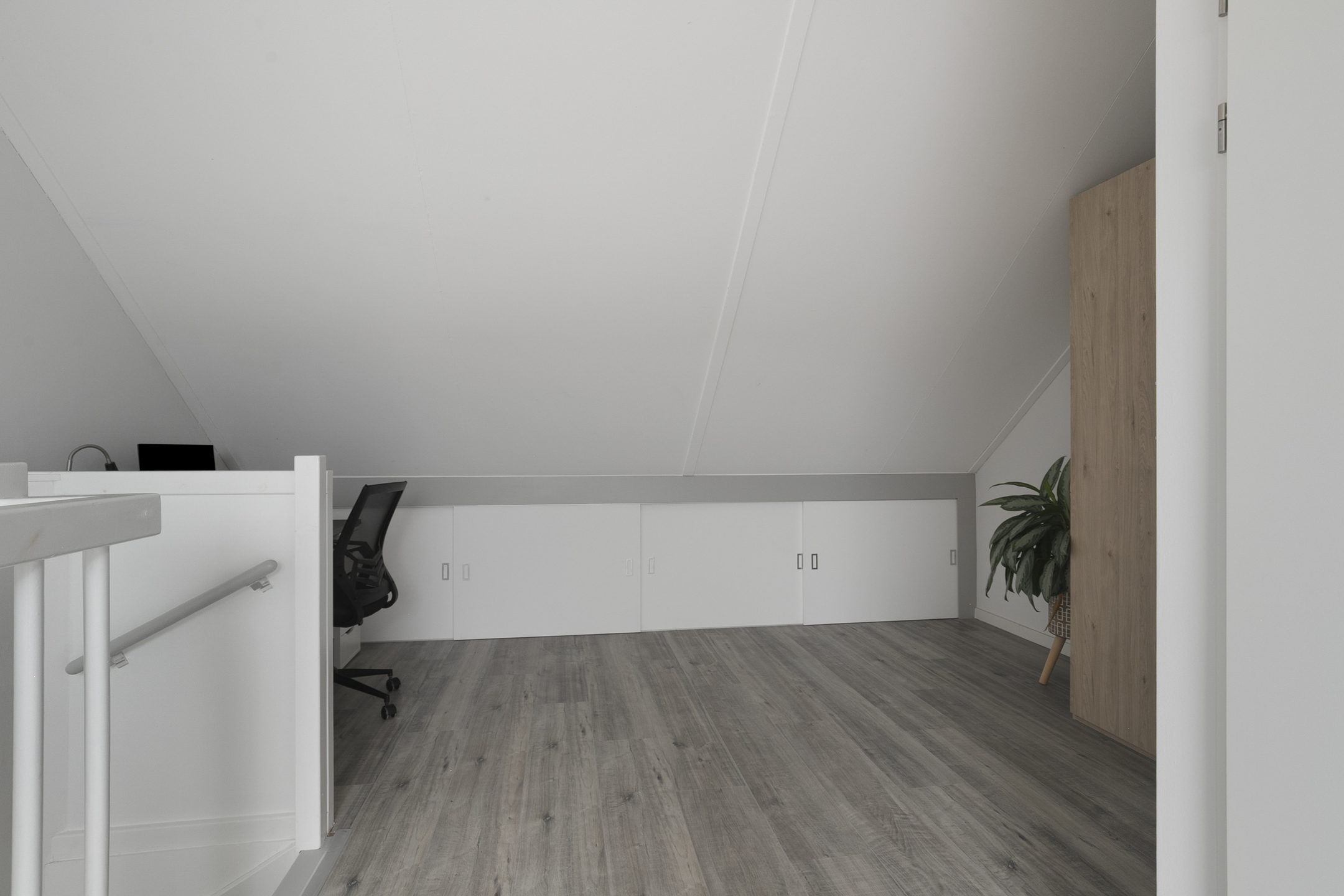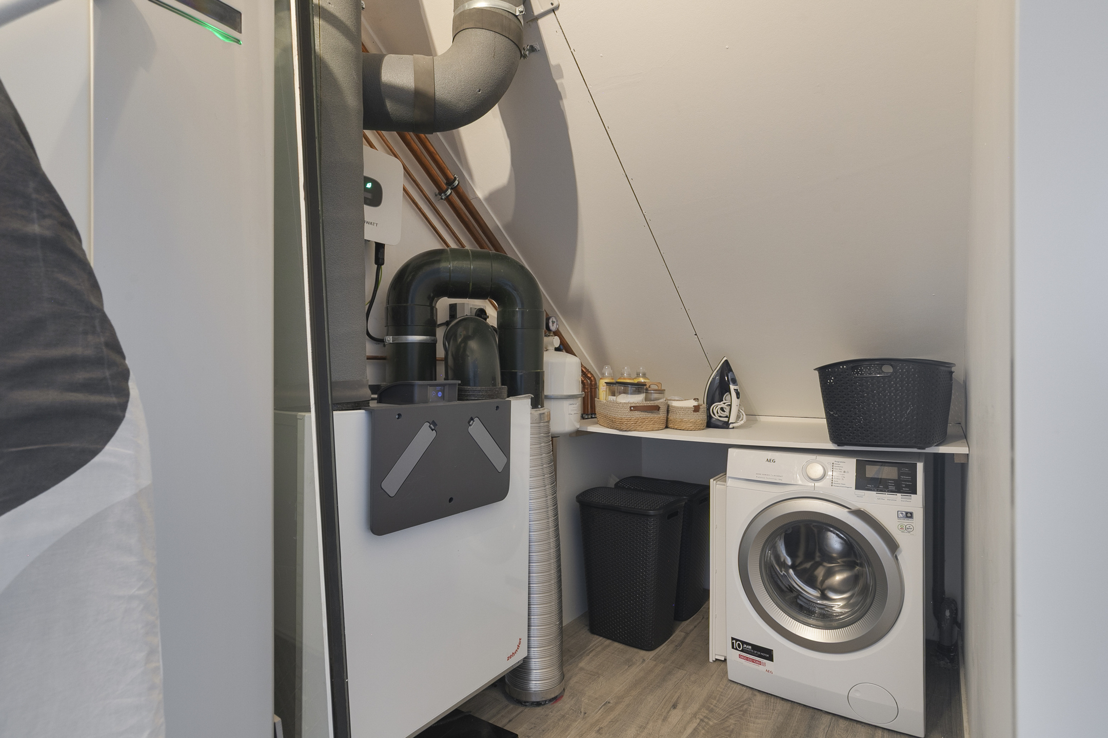 Maak gebruik van de vaste trap op de 1e verdieping en je bereikt de zolderverdieping. Met deze ruimte kun je alle kanten nog op! De ruimte is in ieder geval al netjes afgewerkt met een groot dakraam, veel bergruimte achter de knieschotten en een laminaatvloer. De warmtepomp, WTW-unit, de omvormer voor de zonnepanelen en de wasmachine zijn netjes weggewerkt in een separate berging.