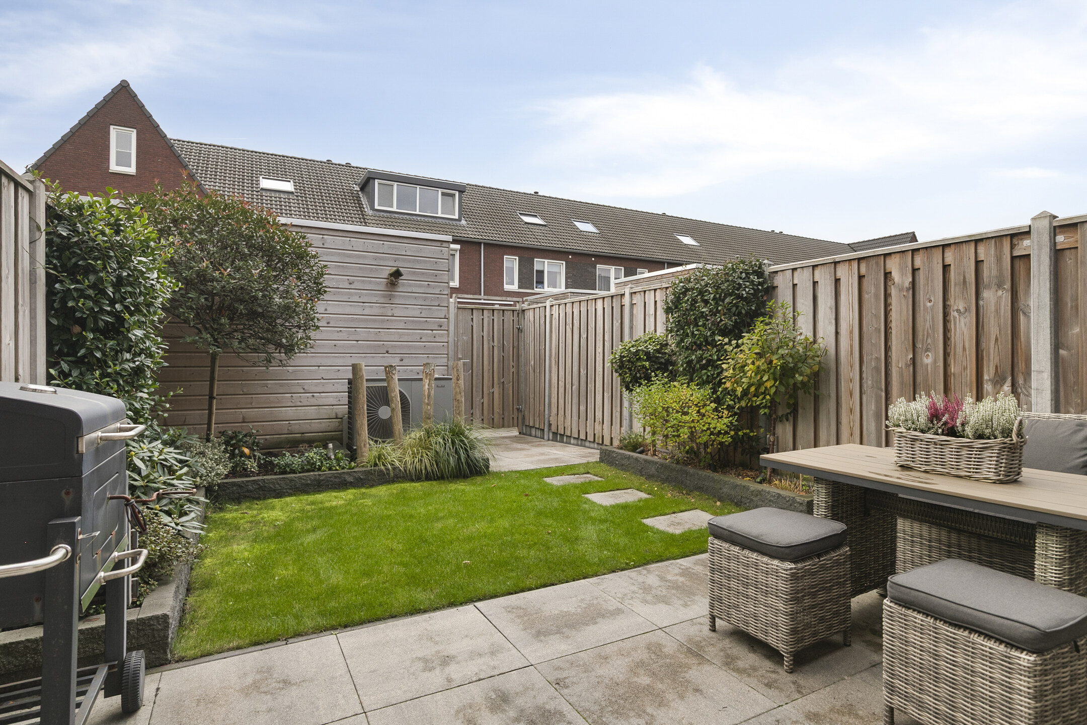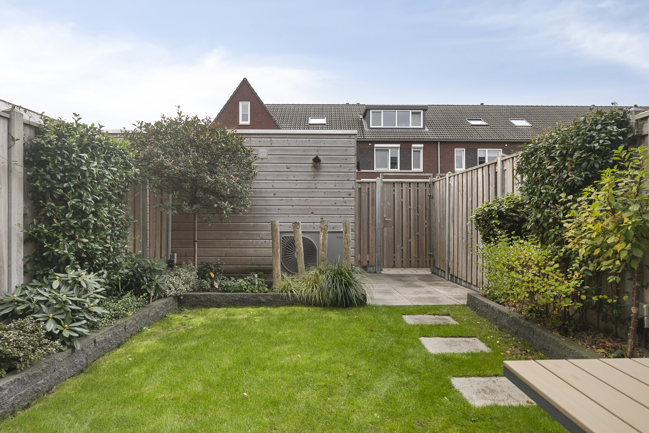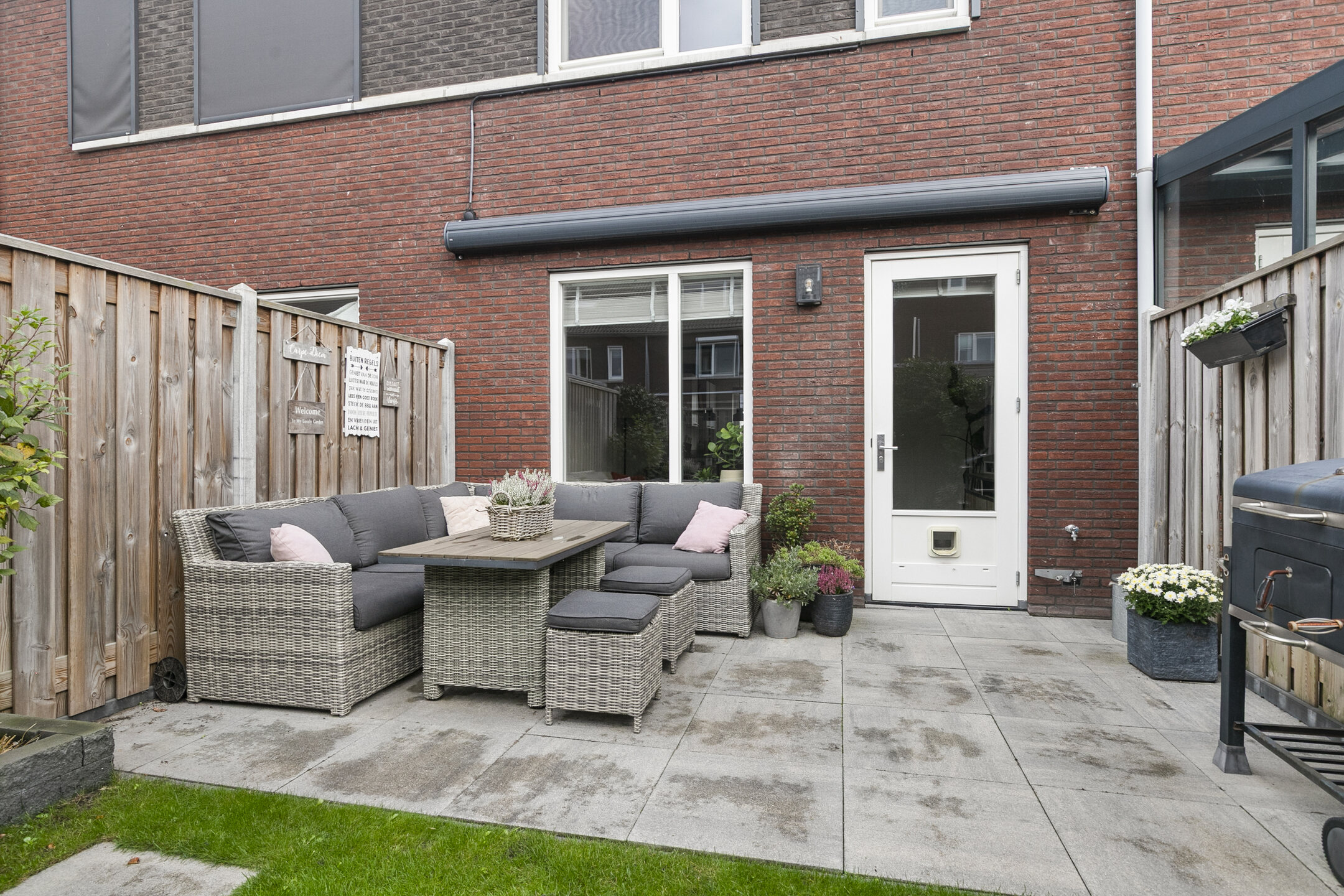 Vanuit de woonkamer stap je zo de achtertuin in. En hier is het volop genieten! Met de zuidelijke ligging geniet je hier volop van de zon en op de warmere dagen van het jaar maak je gemakkelijk gebruik van het elektrisch bedienbare zonnescherm. Bij de woning bevindt zich een terras waar je de mogelijkheid hebt een eettafel of loungeset te plaatsen. De tuin is verder mooi in balans met staptegels, gras en beplanting. Achter in de tuin tref je de berging (voorzien van elektra) en de afsluitbare achterom.
