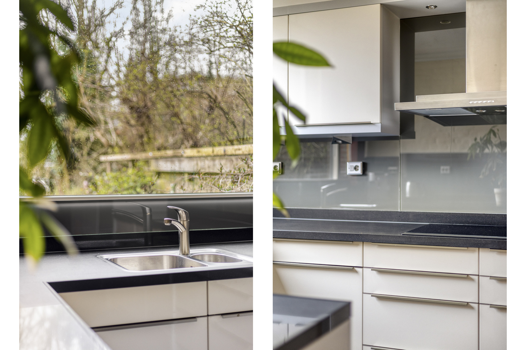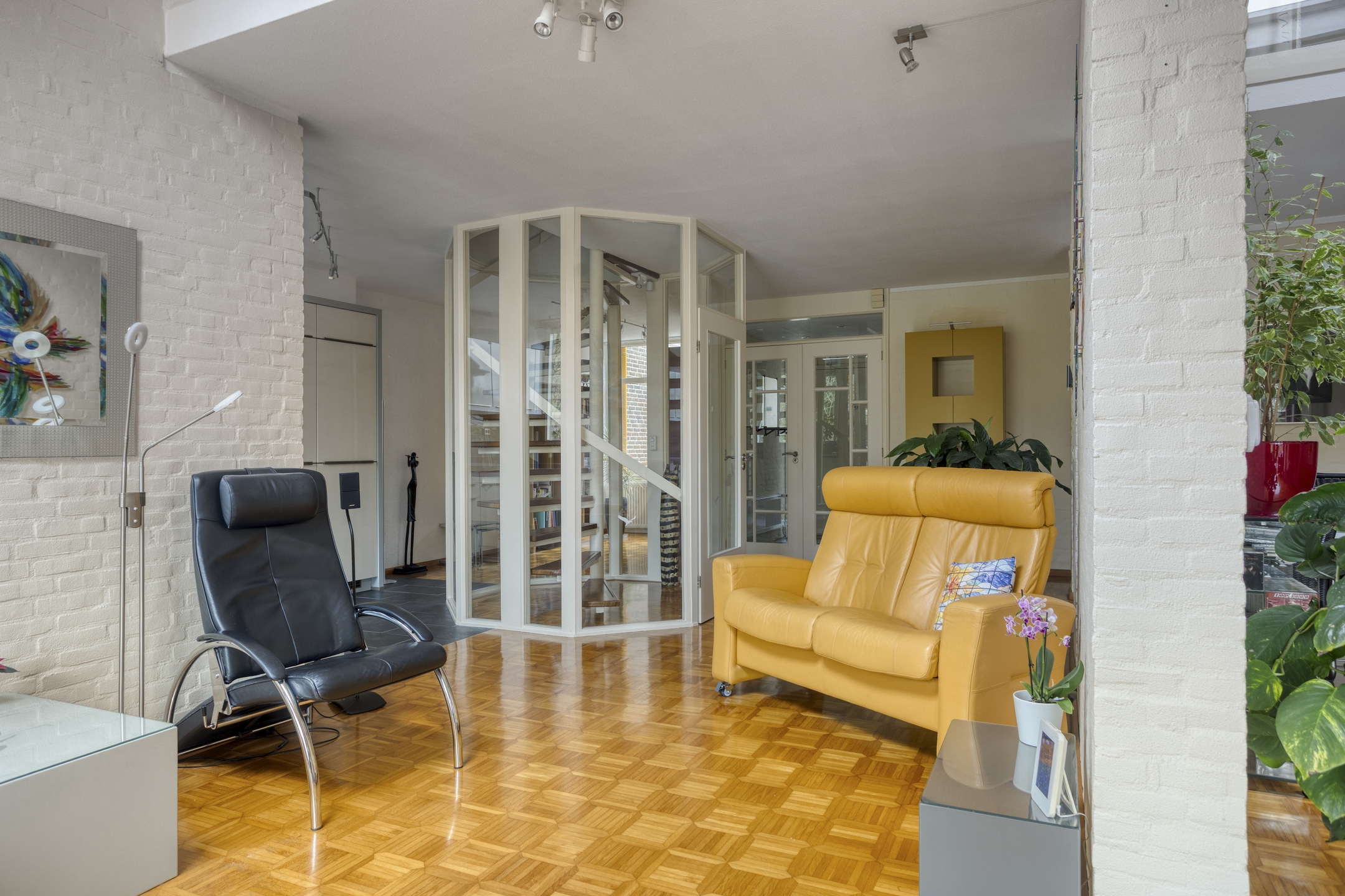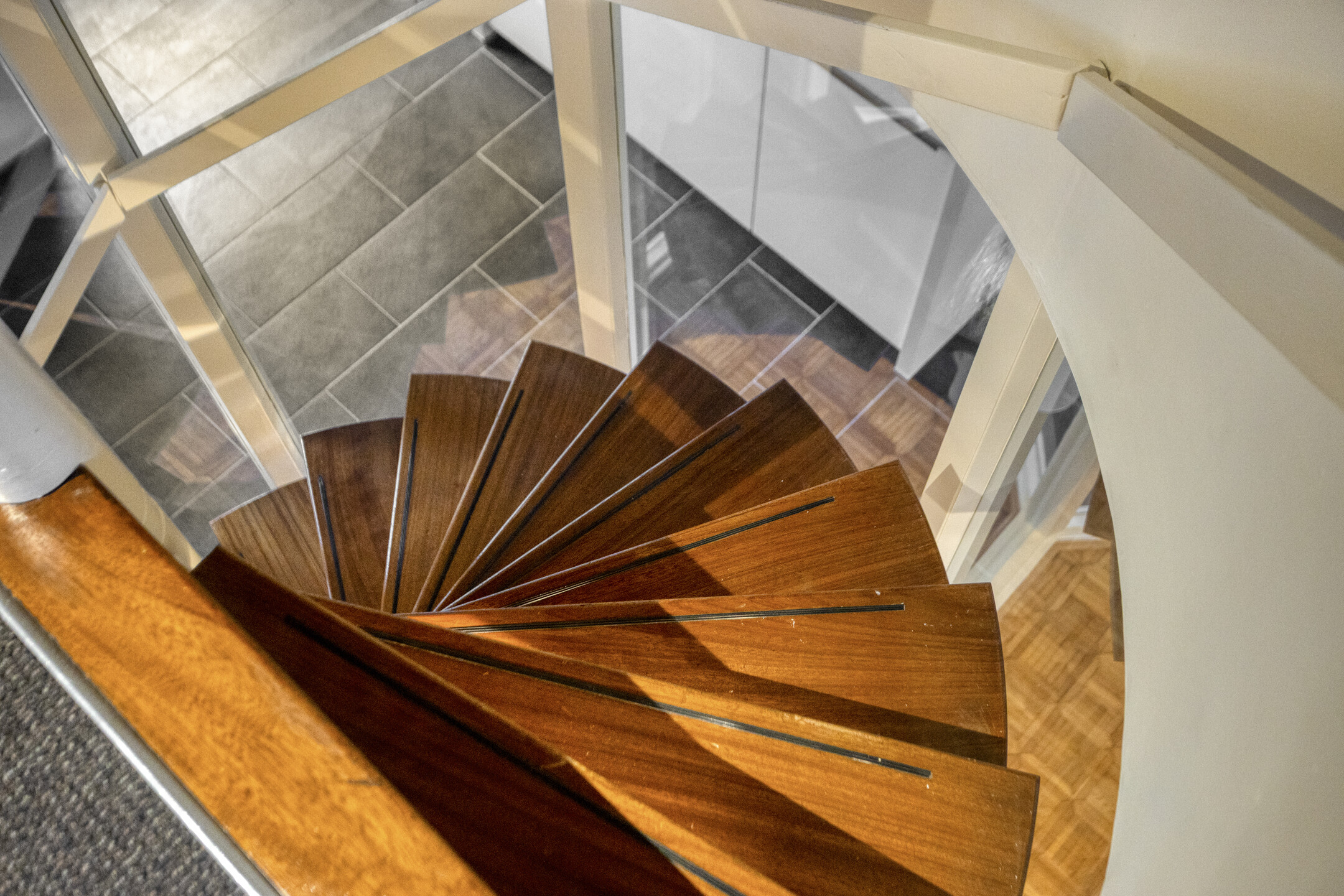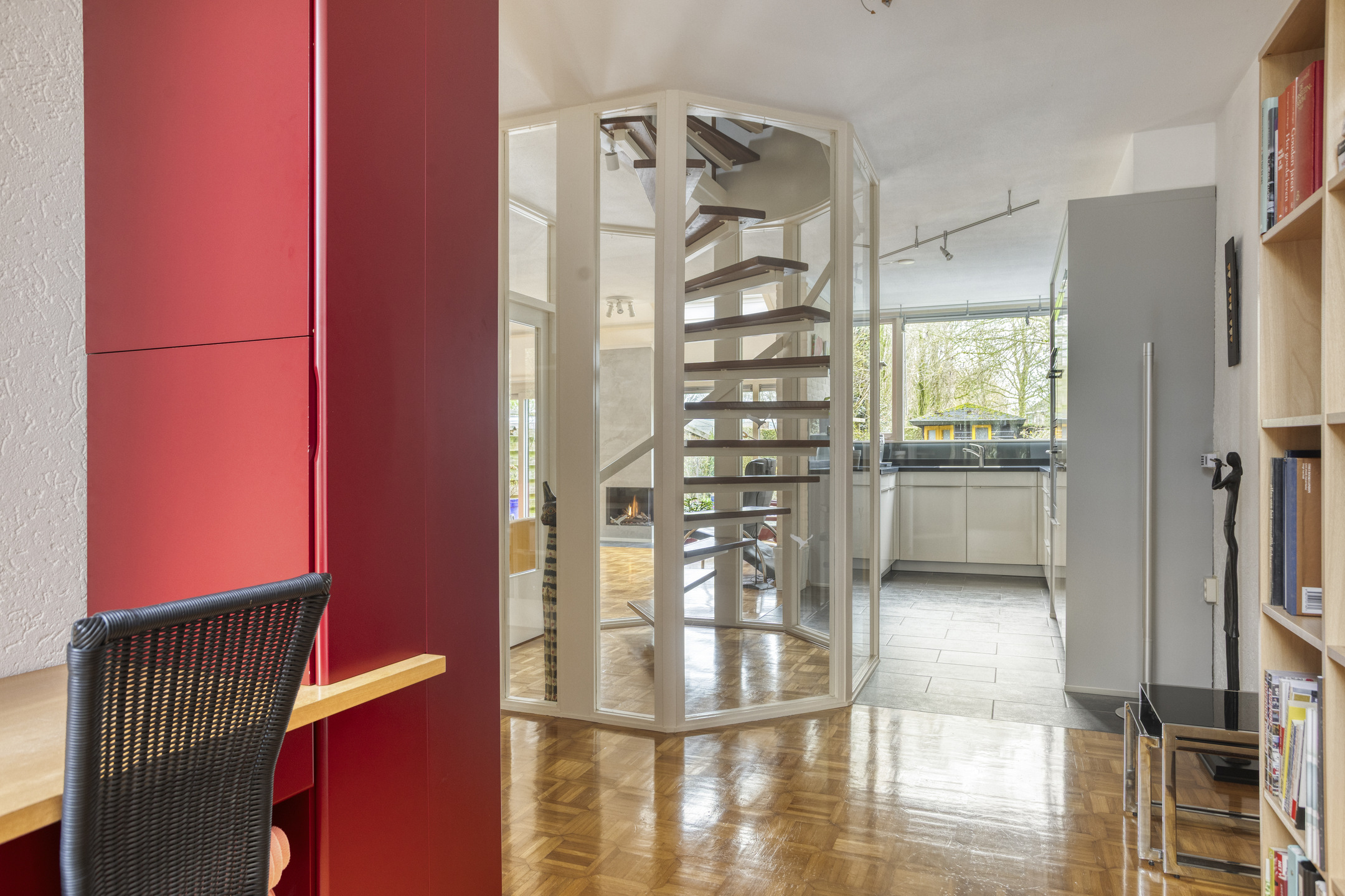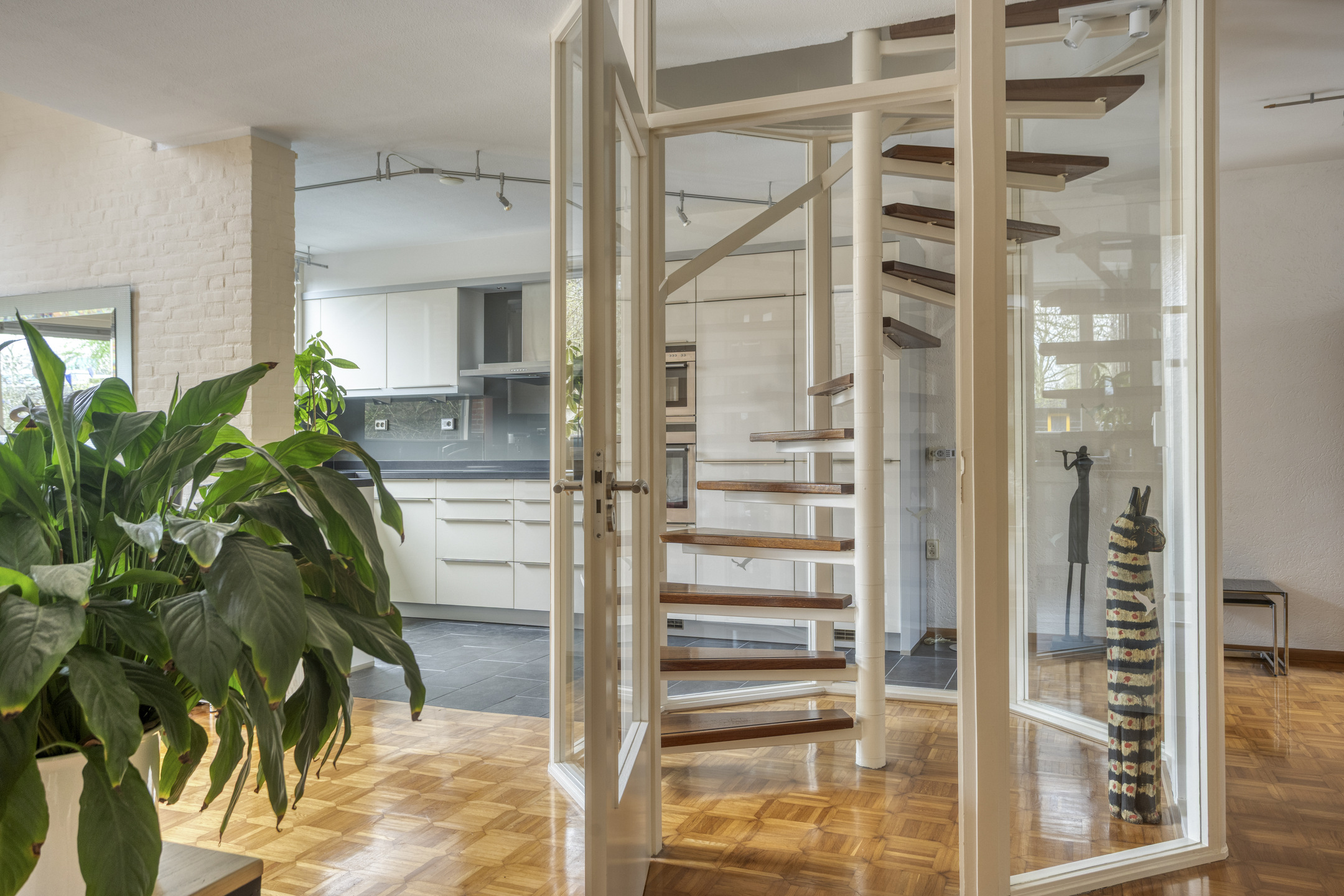 * De glazen ombouw rond de trapopgang is voorzien van gelaagd glas, wat voor extra veiligheid zorgt