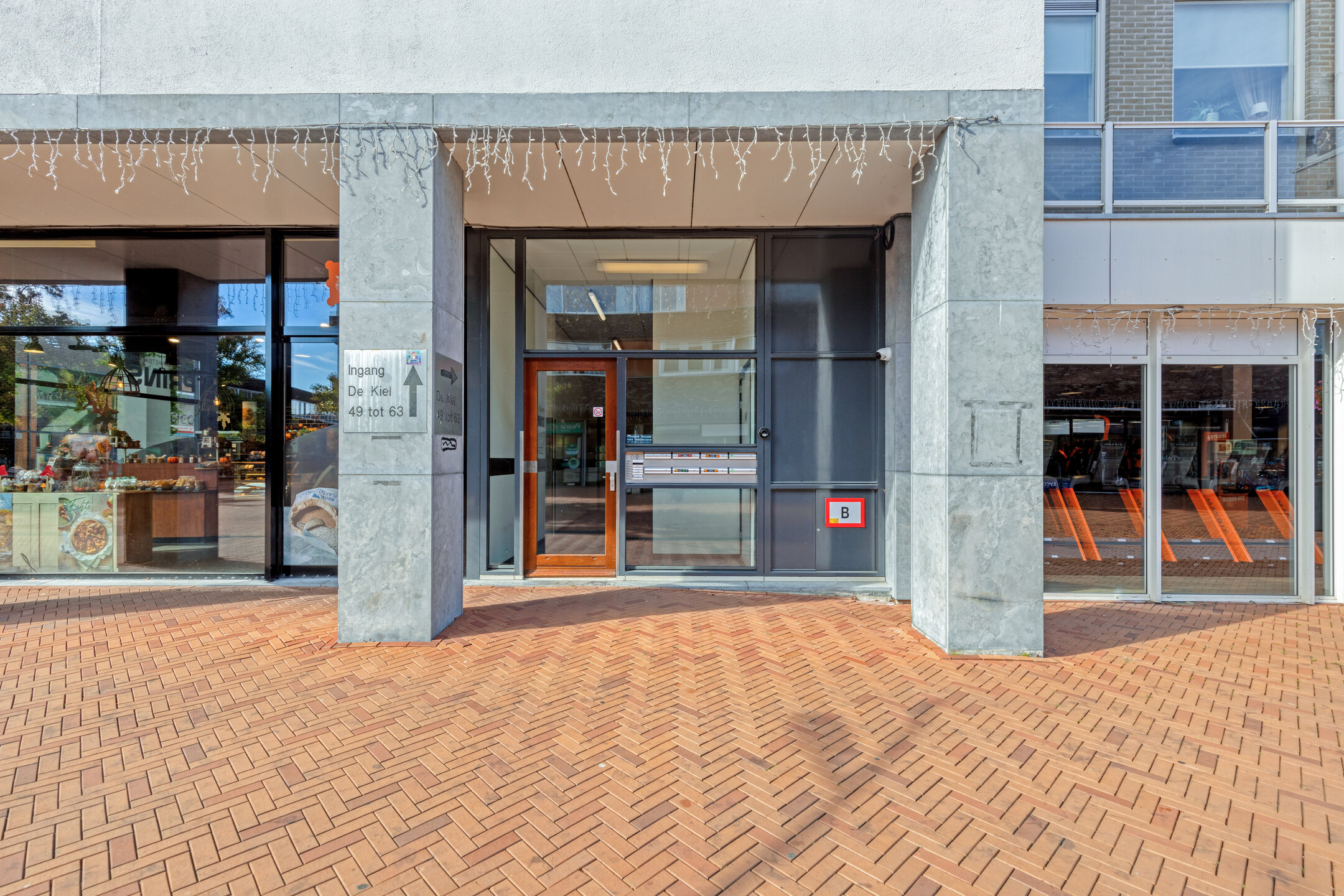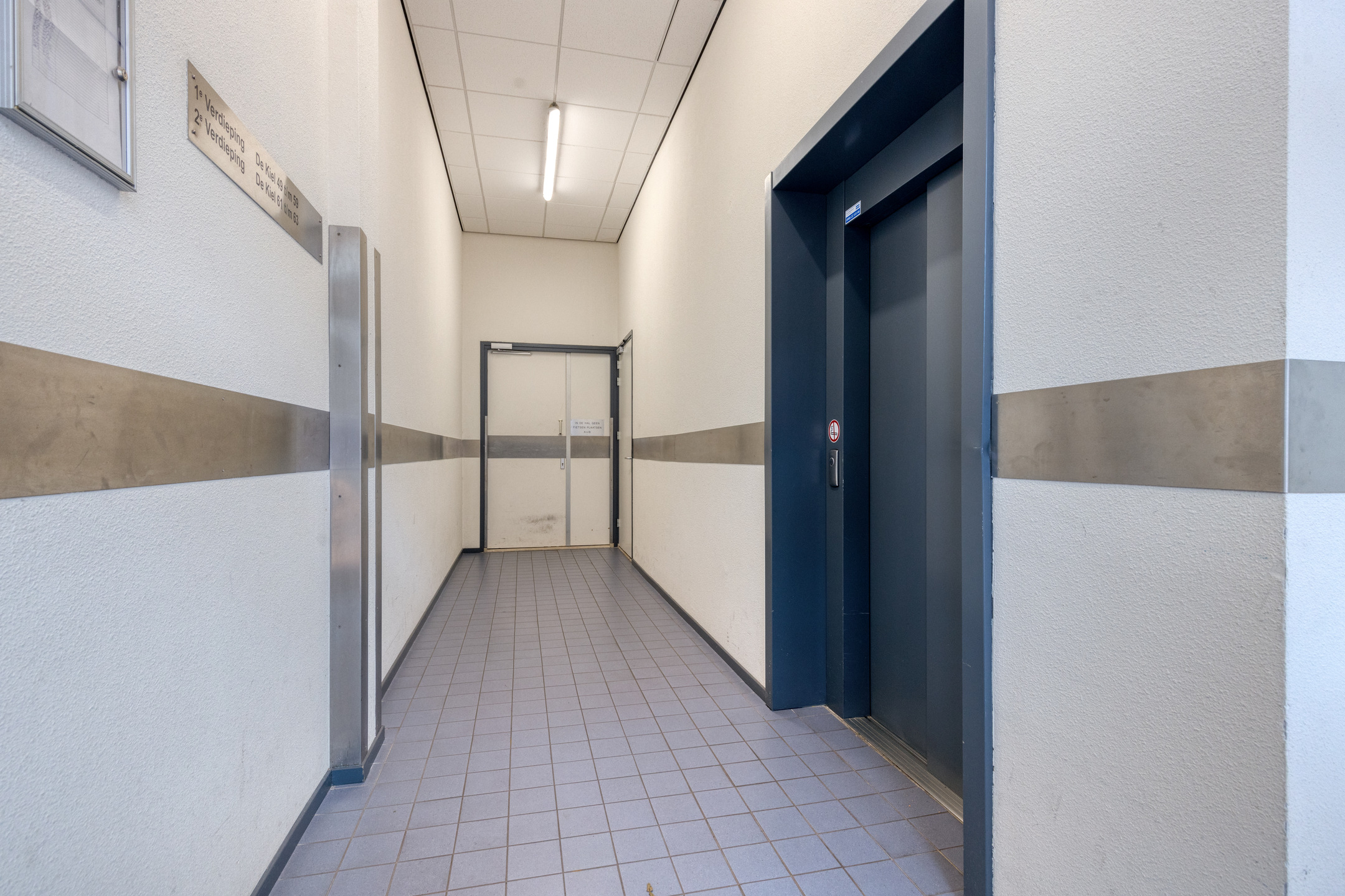 Centrale entree met de postvakken, het trappenhuis, de lift en het bellentableau.