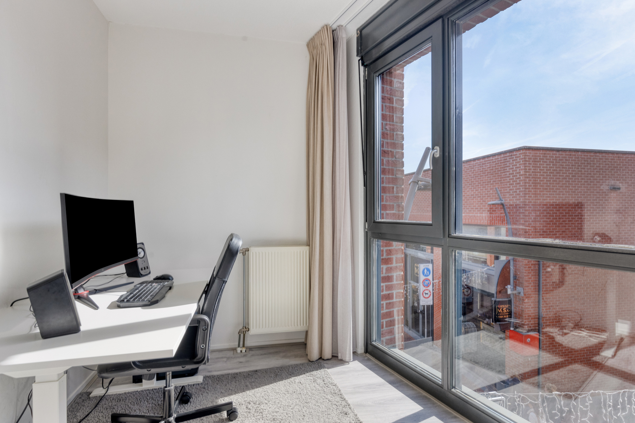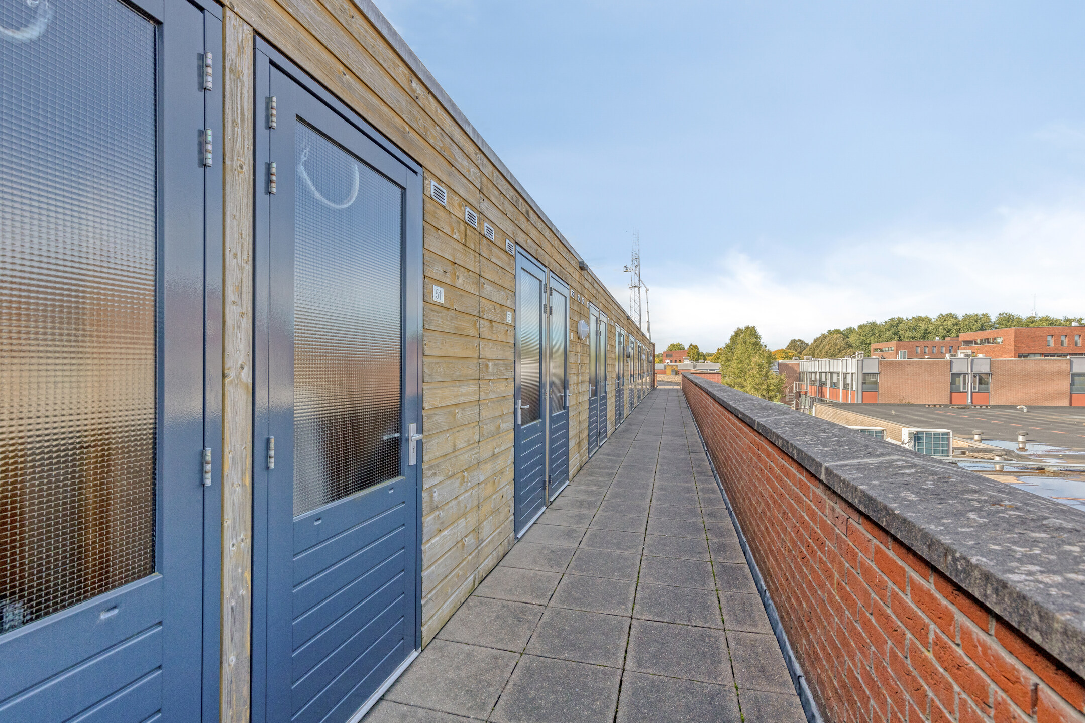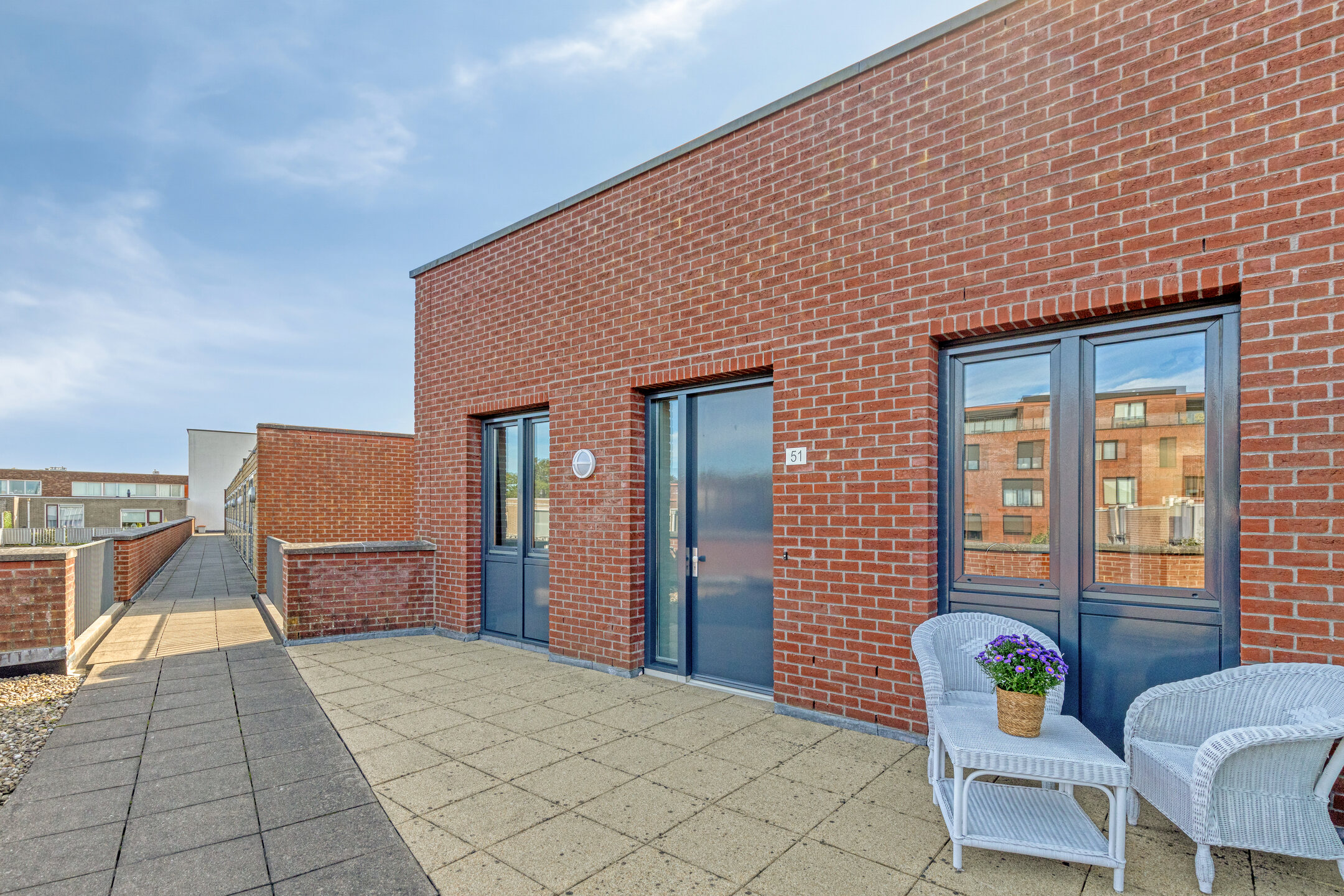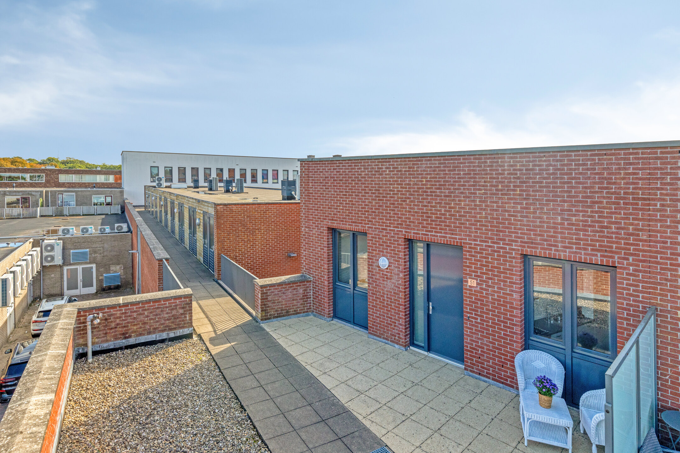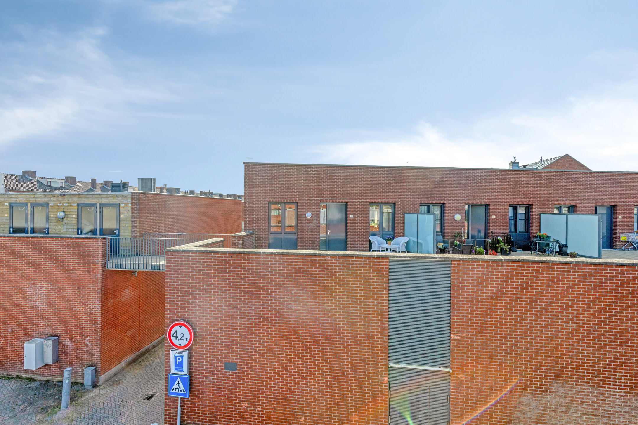 Aan de voorzijde van het appartement is een ruim dakterras gelegen, waar je de mogelijkheid hebt een comfortabel zitje te plaatsen. Om de nodige privacy te creëren is er een privacy scherm aanwezig. Genieten maar!