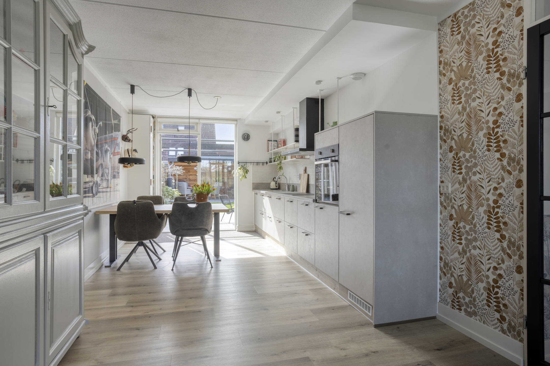 De keuken en eethoek staan in open verbinding. De keuken is uitgevoerd in een rechte opstelling en de fronten inclusief het werkblad zijn zeer recent vernieuwd. De inbouwapparatuur bestaat uit een koelkast, oven, vaatwasser, 4-pits inductiekookplaat en een zwarte afzuigschouw. Vanuit de keuken is er toegang tot de tuin.