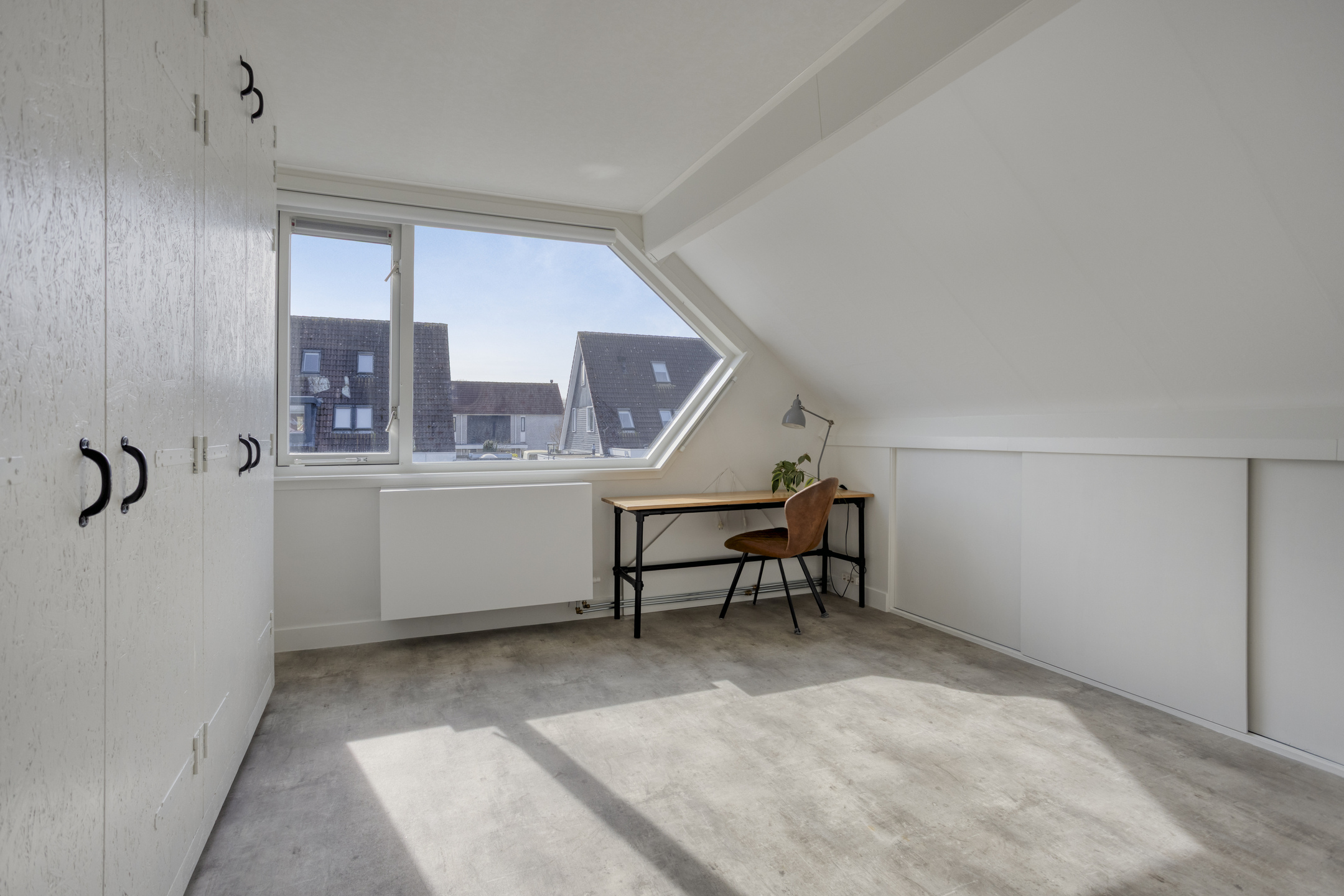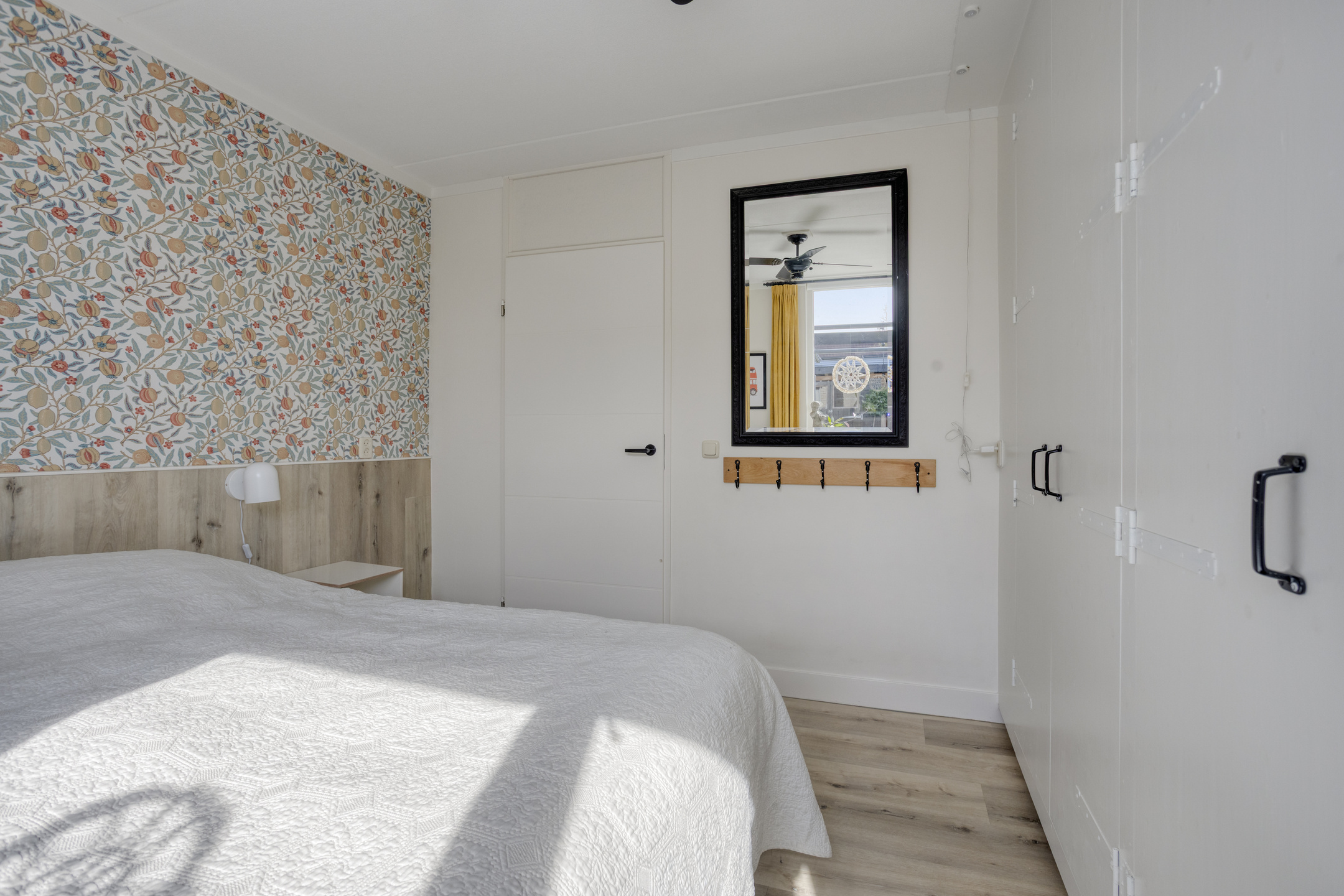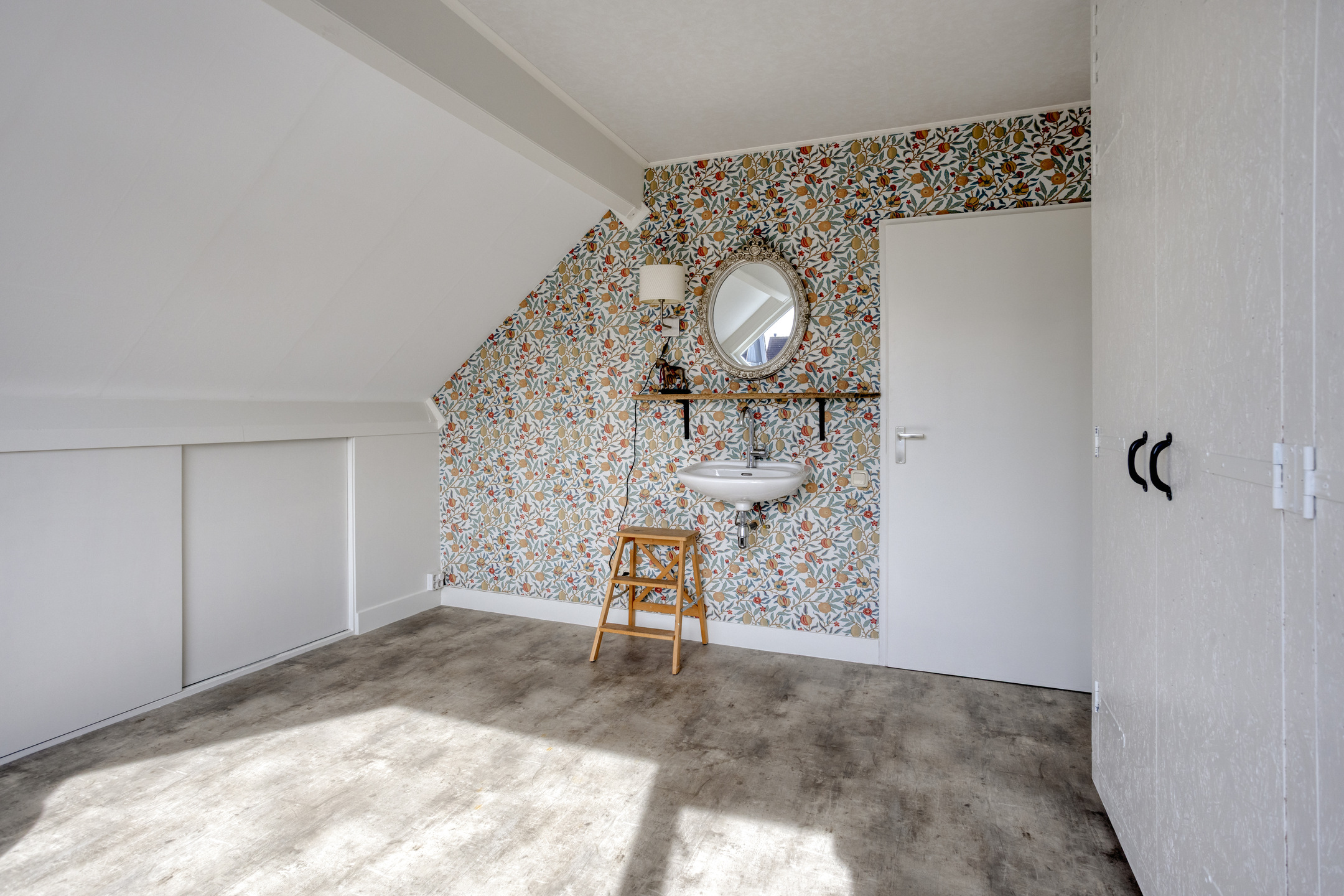 De trap is afgewerkt met dezelfde pvc-vloer als de begane grond. Vanaf de overloop zijn de 2 slaapkamers, de berging en de vliering bereikbaar middels een luik met vlizotrap. Beide slaapkamers zijn ruim en liggen over de gehele breedte van de woning. Daarnaast bieden ze dankzij de vaste kasten en knieschotten veel bergruimte. De slaapkamer aan de achterzijde beschikt over een wastafel. De plafonds zijn voorzien van een spanplafond, wat zorgt voor een rustige en strakke uitstraling. De kamers worden verwarmd via lage temperatuurradiatoren.