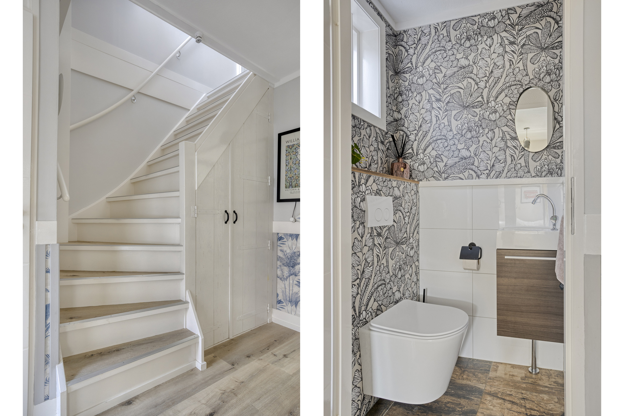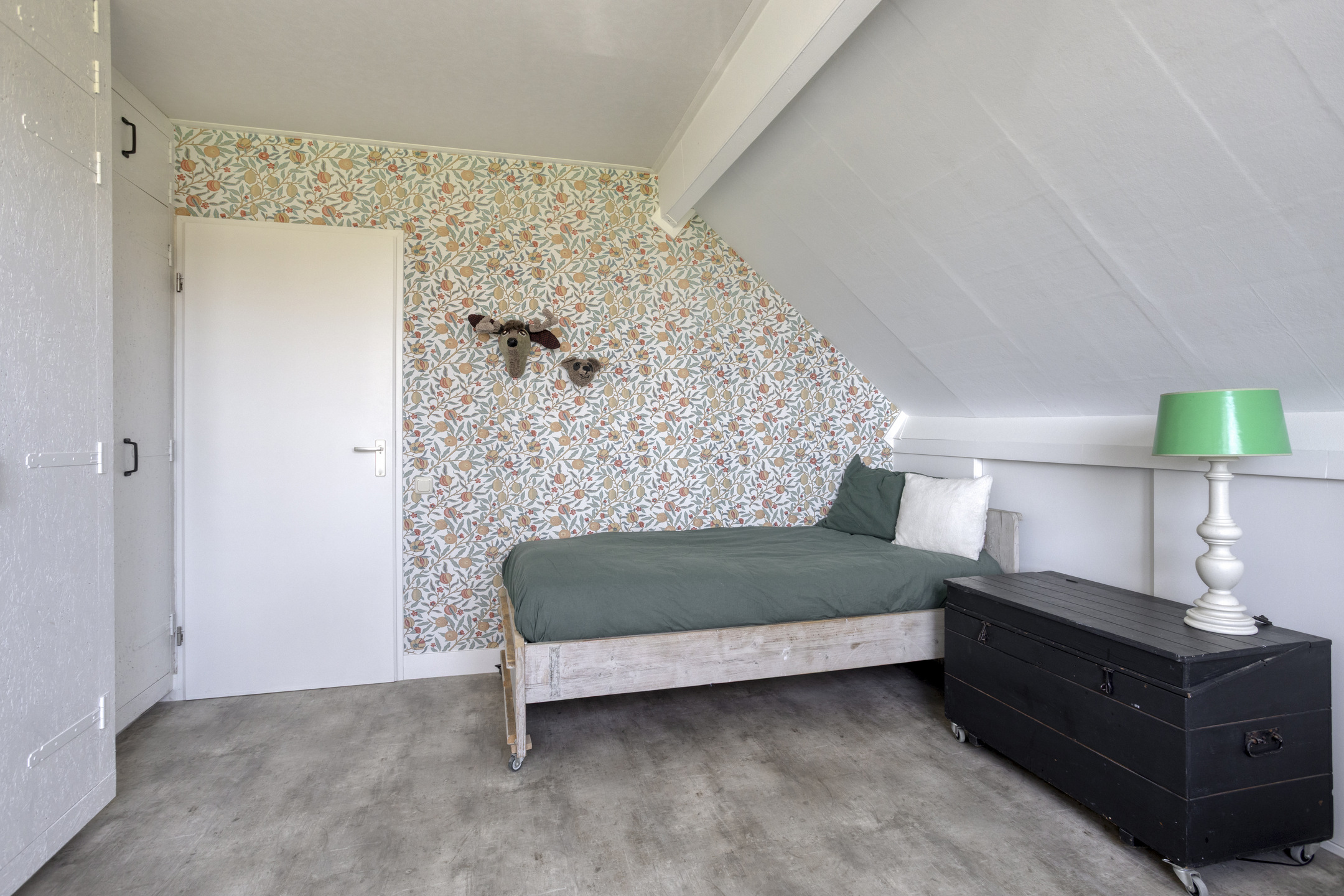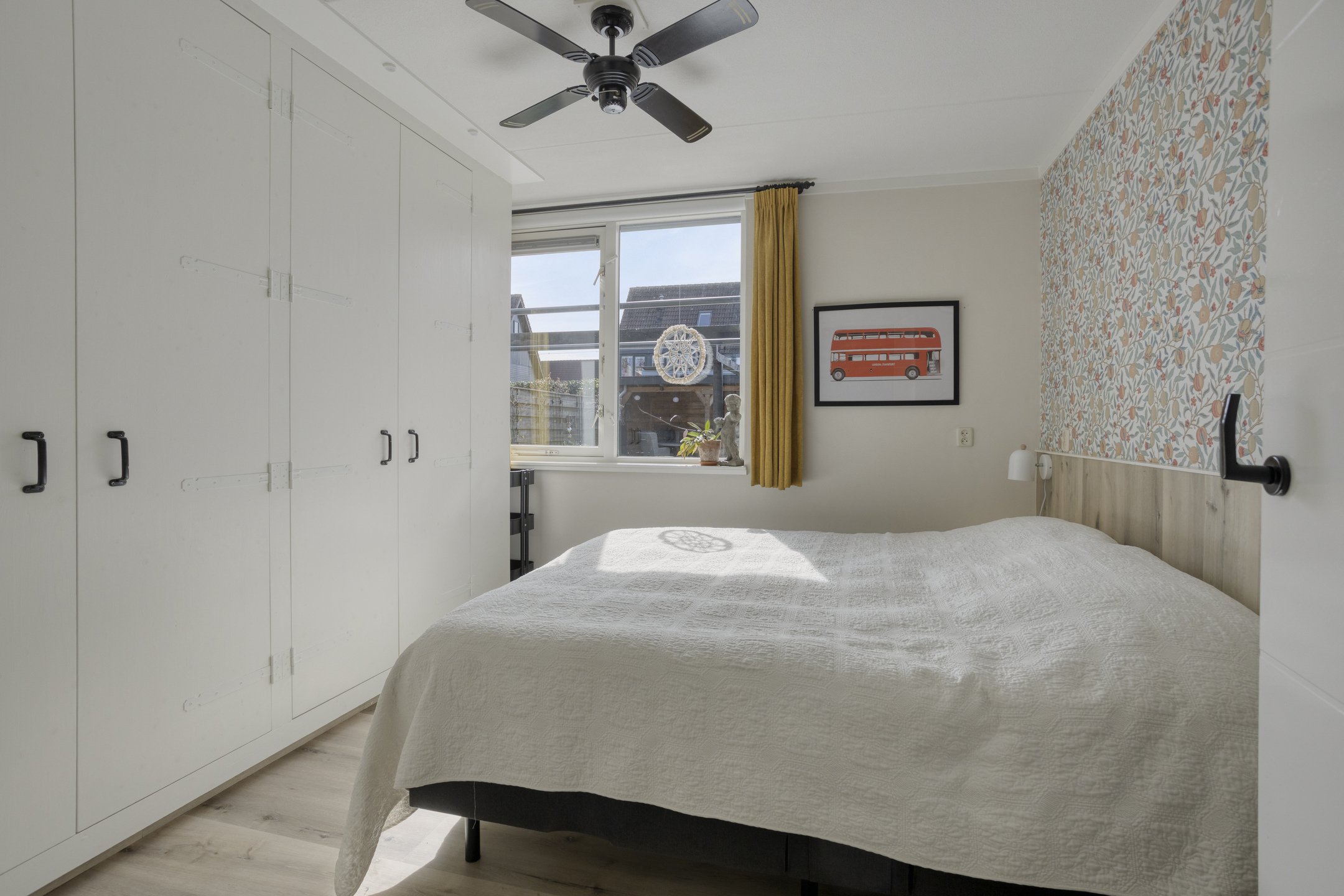 De trap is afgewerkt met dezelfde pvc-vloer als de begane grond. Vanaf de overloop zijn de 2 slaapkamers, de berging en de vliering bereikbaar middels een luik met vlizotrap. Beide slaapkamers zijn ruim en liggen over de gehele breedte van de woning. Daarnaast bieden ze dankzij de vaste kasten en knieschotten veel bergruimte. De slaapkamer aan de achterzijde beschikt over een wastafel. De plafonds zijn voorzien van een spanplafond, wat zorgt voor een rustige en strakke uitstraling. De kamers worden verwarmd via lage temperatuurradiatoren.