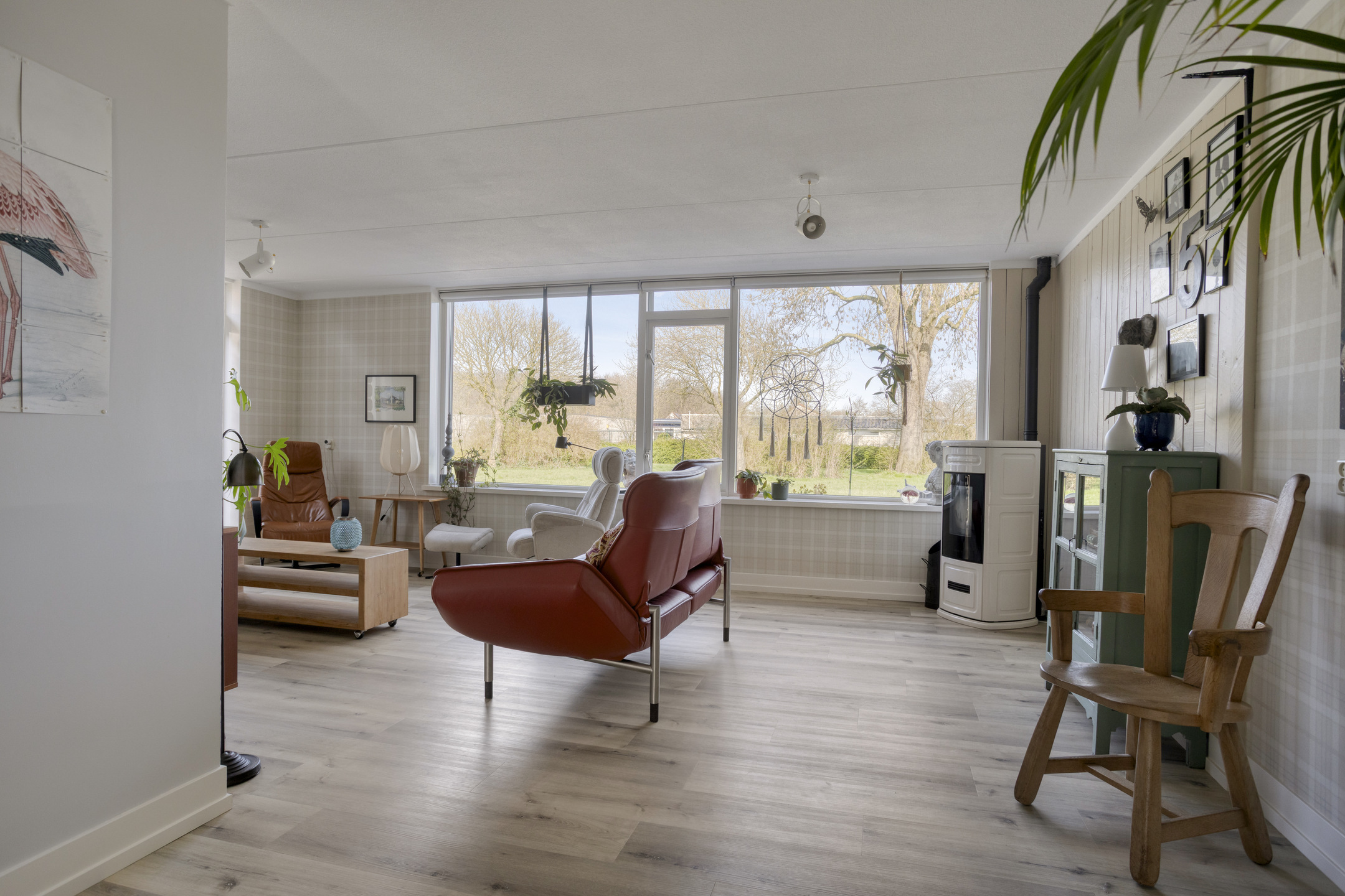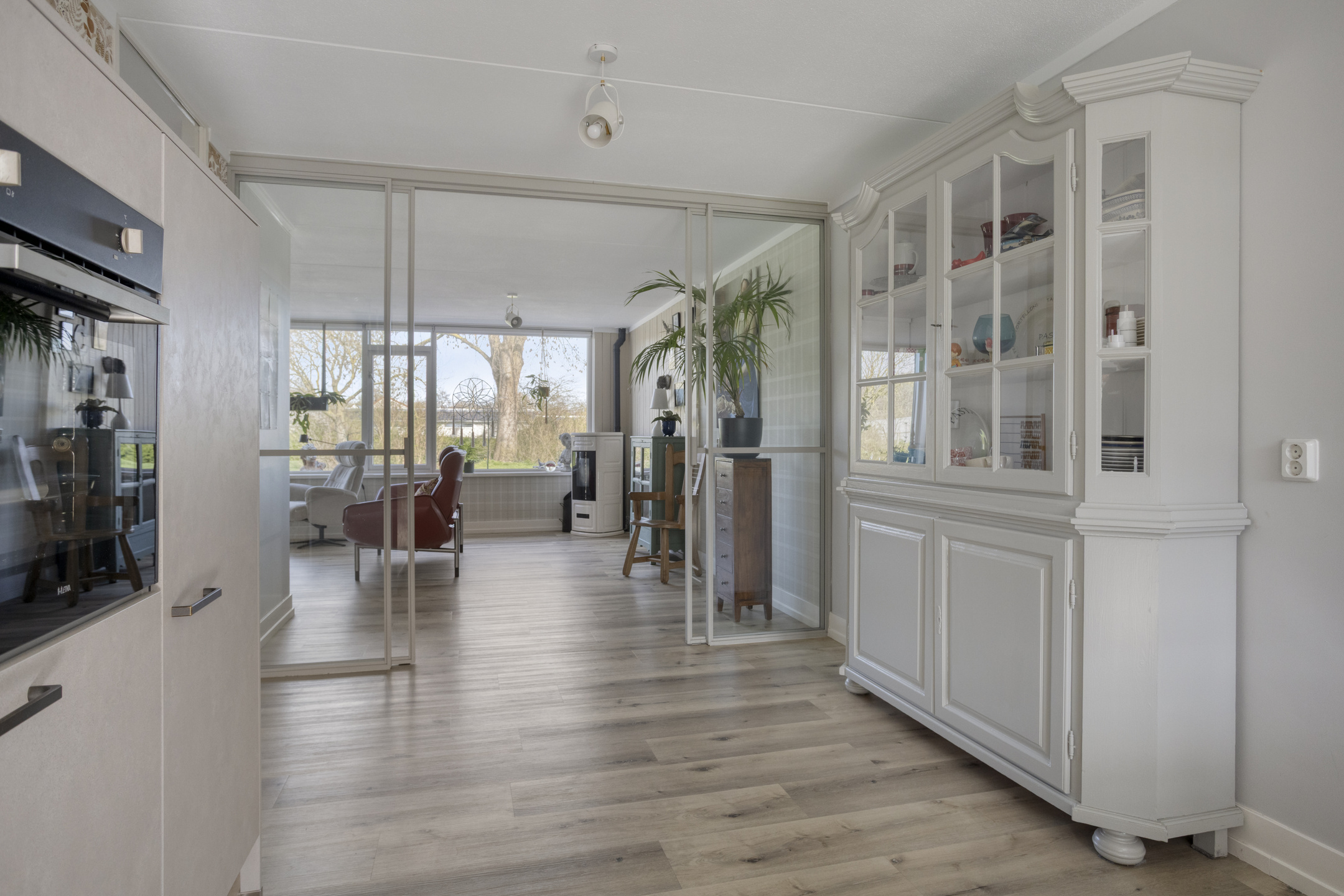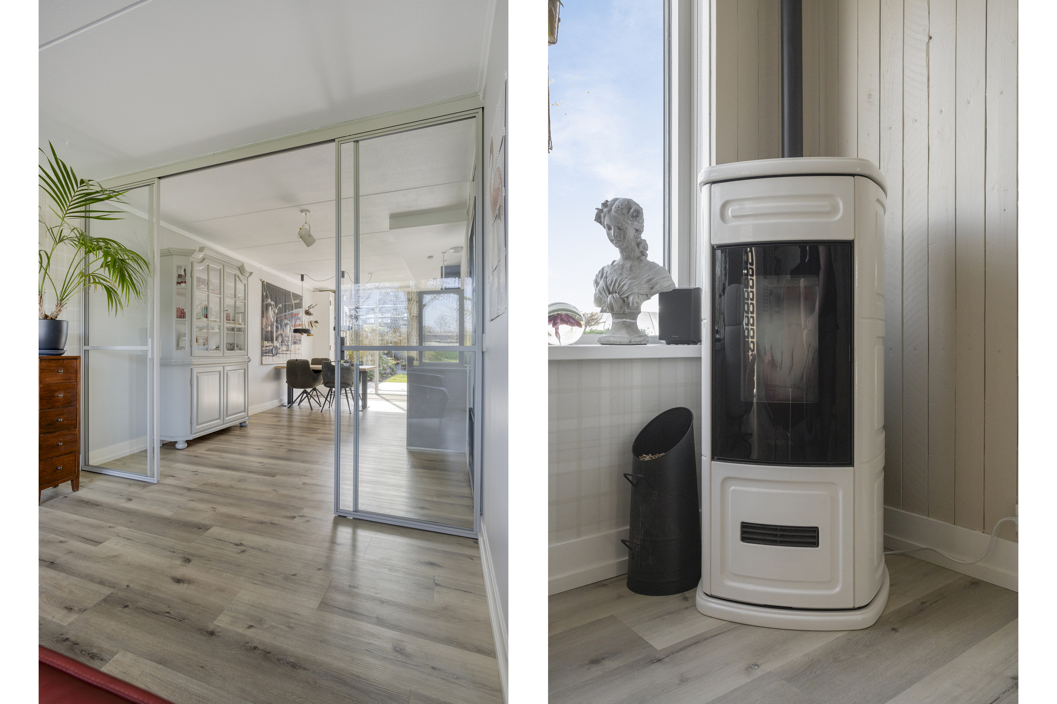 In de hal ervaar je direct de sfeer van de gehele woning: sfeervol en perfect afgewerkt! Bij binnenkomst in de living vallen direct de maatvoering en het vele daglicht op. De woonkamer biedt alle ruimte voor het plaatsen van diverse meubels en is voorzien van een pvc-vloer met vloerverwarming en een pelletkachel. Vanuit de zithoek geniet je van het vrije, groene uitzicht aan de voorzijde, wat zorgt voor een ruimtelijk gevoel. De woonkamer is af te sluiten met en-suite deuren in grijs staal en glas.