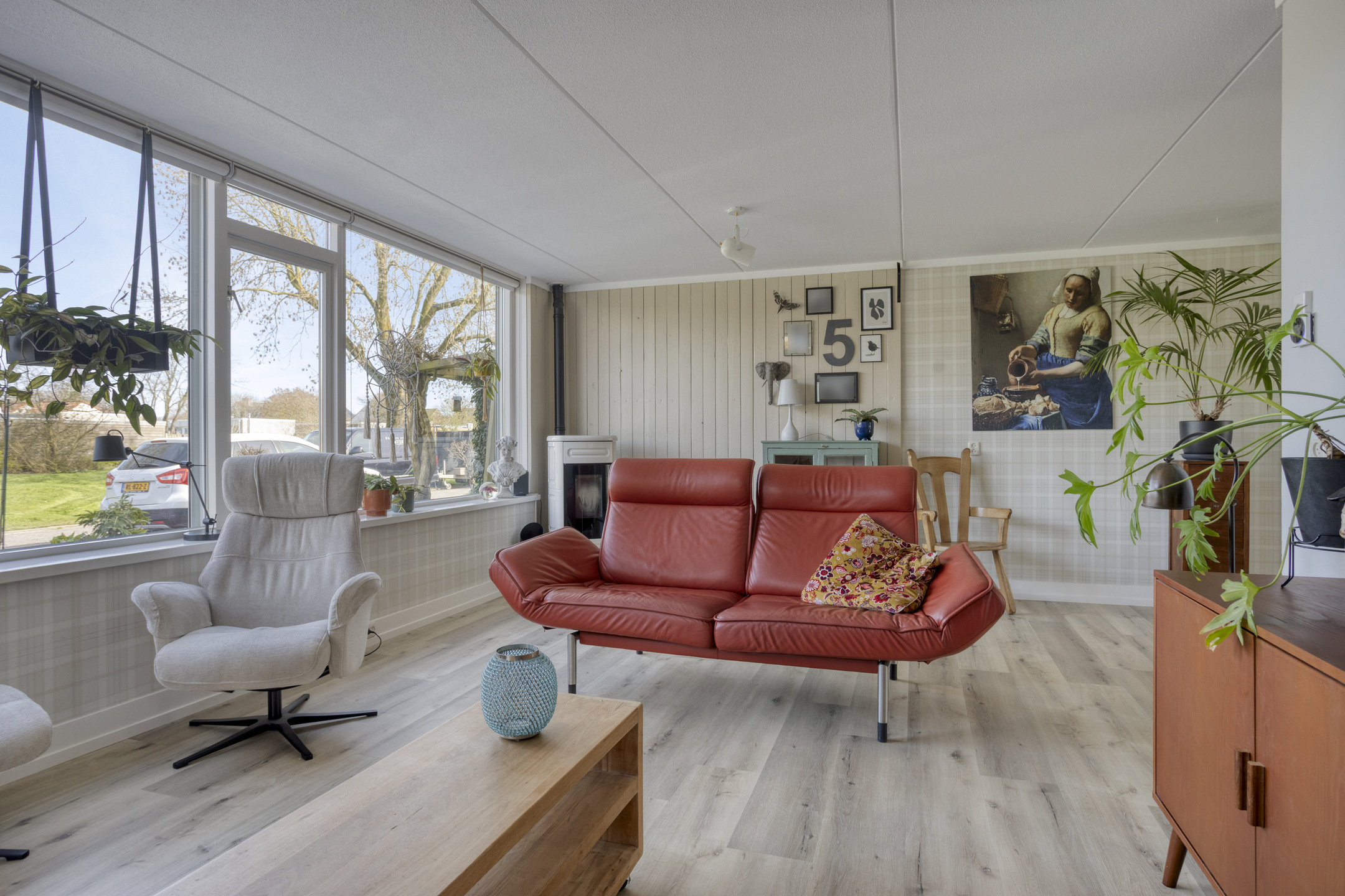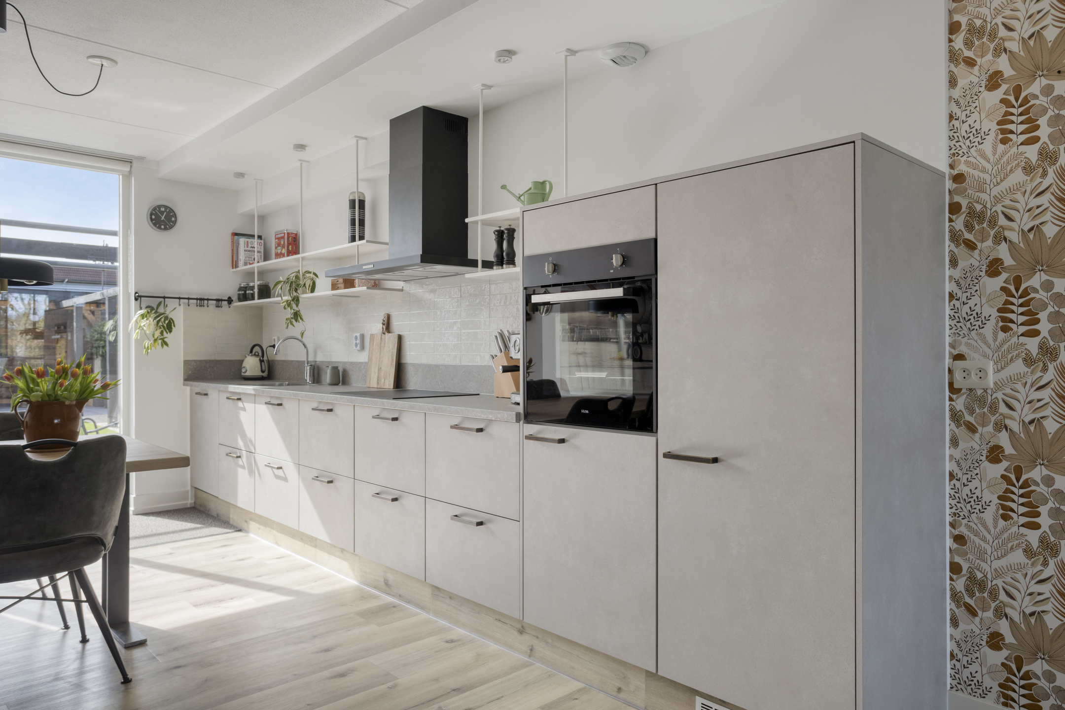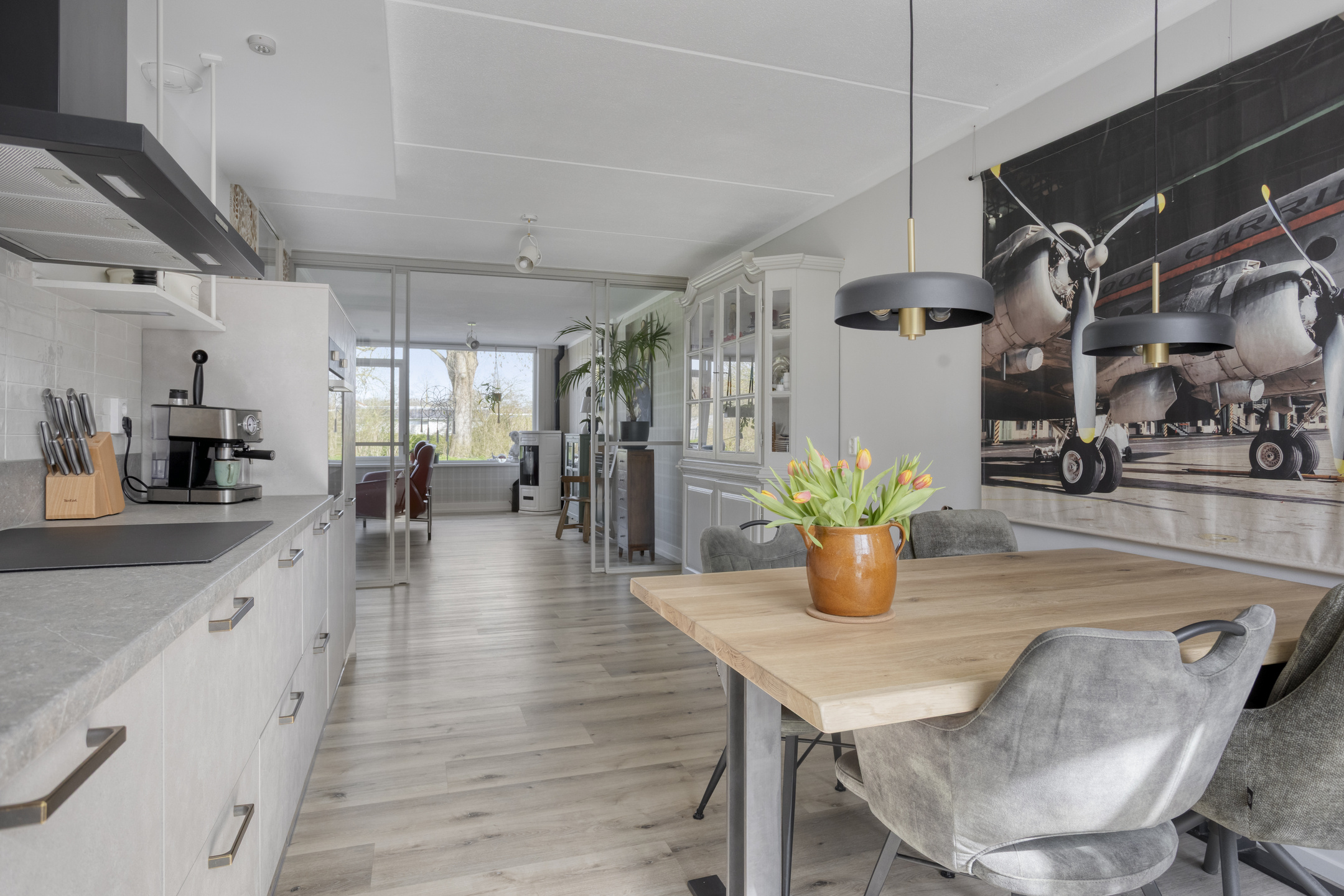 In de hal ervaar je direct de sfeer van de gehele woning: sfeervol en perfect afgewerkt! Bij binnenkomst in de living vallen direct de maatvoering en het vele daglicht op. De woonkamer biedt alle ruimte voor het plaatsen van diverse meubels en is voorzien van een pvc-vloer met vloerverwarming en een pelletkachel. Vanuit de zithoek geniet je van het vrije, groene uitzicht aan de voorzijde, wat zorgt voor een ruimtelijk gevoel. De woonkamer is af te sluiten met en-suite deuren in grijs staal en glas.