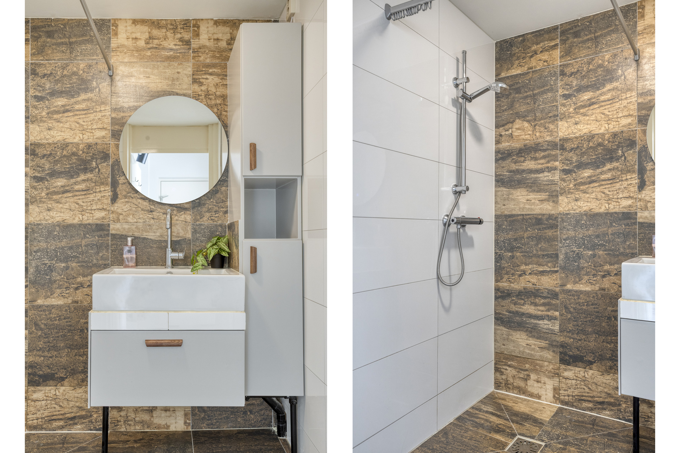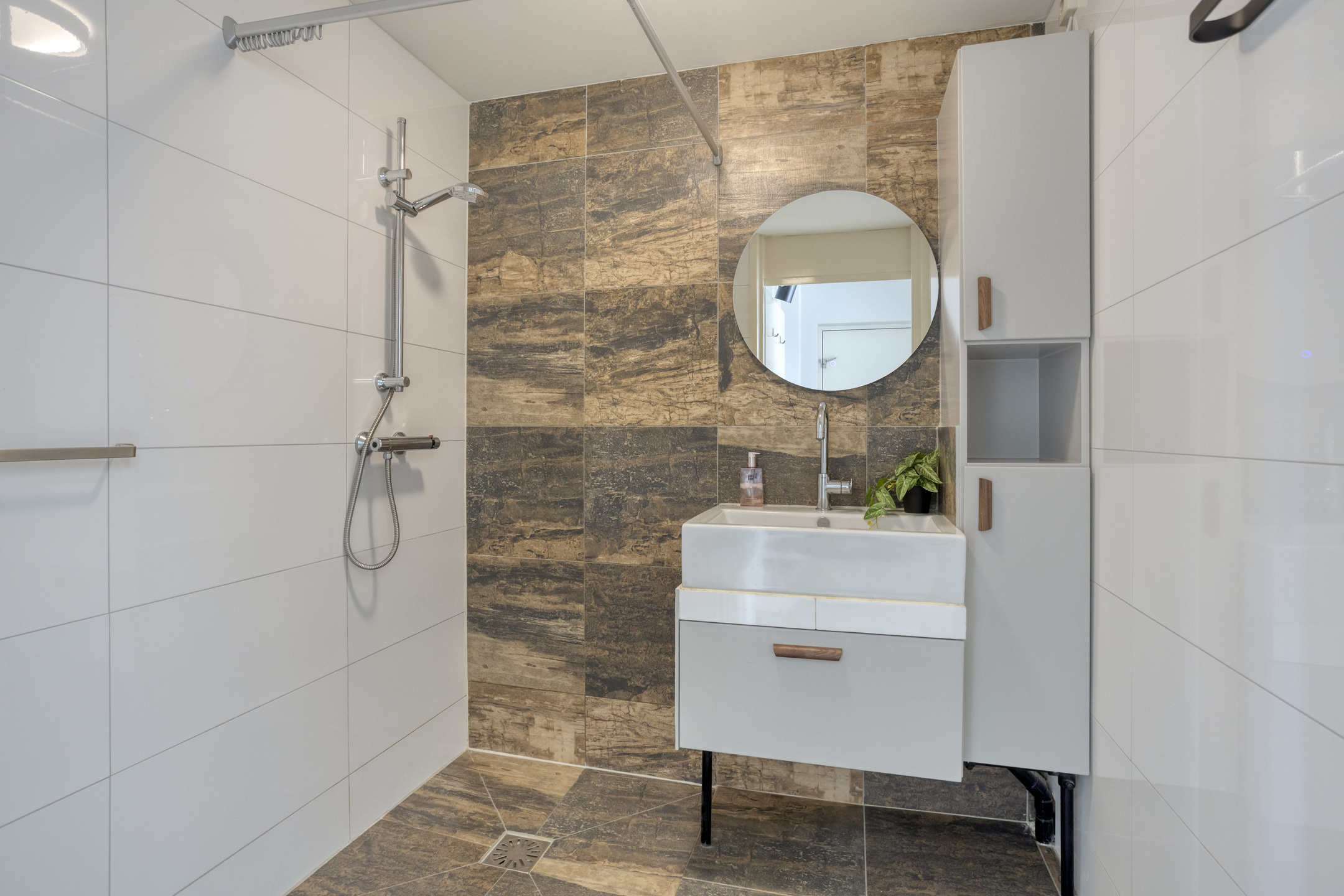 De slaapkamer op de begane grond is royaal en tuingericht; hier word je iedere ochtend rustig wakker. De slaapkamer is voorzien van dezelfde pvc-vloer met vloerverwarming als de rest van de begane grond en beschikt over een royale vaste kast. De aangrenzende badkamer is betegeld in aardetinten en ingericht met een douchehoek, een wastafel met meubel en een wandkast. Het toilet bevindt zich separaat en is uitgevoerd met een zwevend toilet en een wasmeubel.