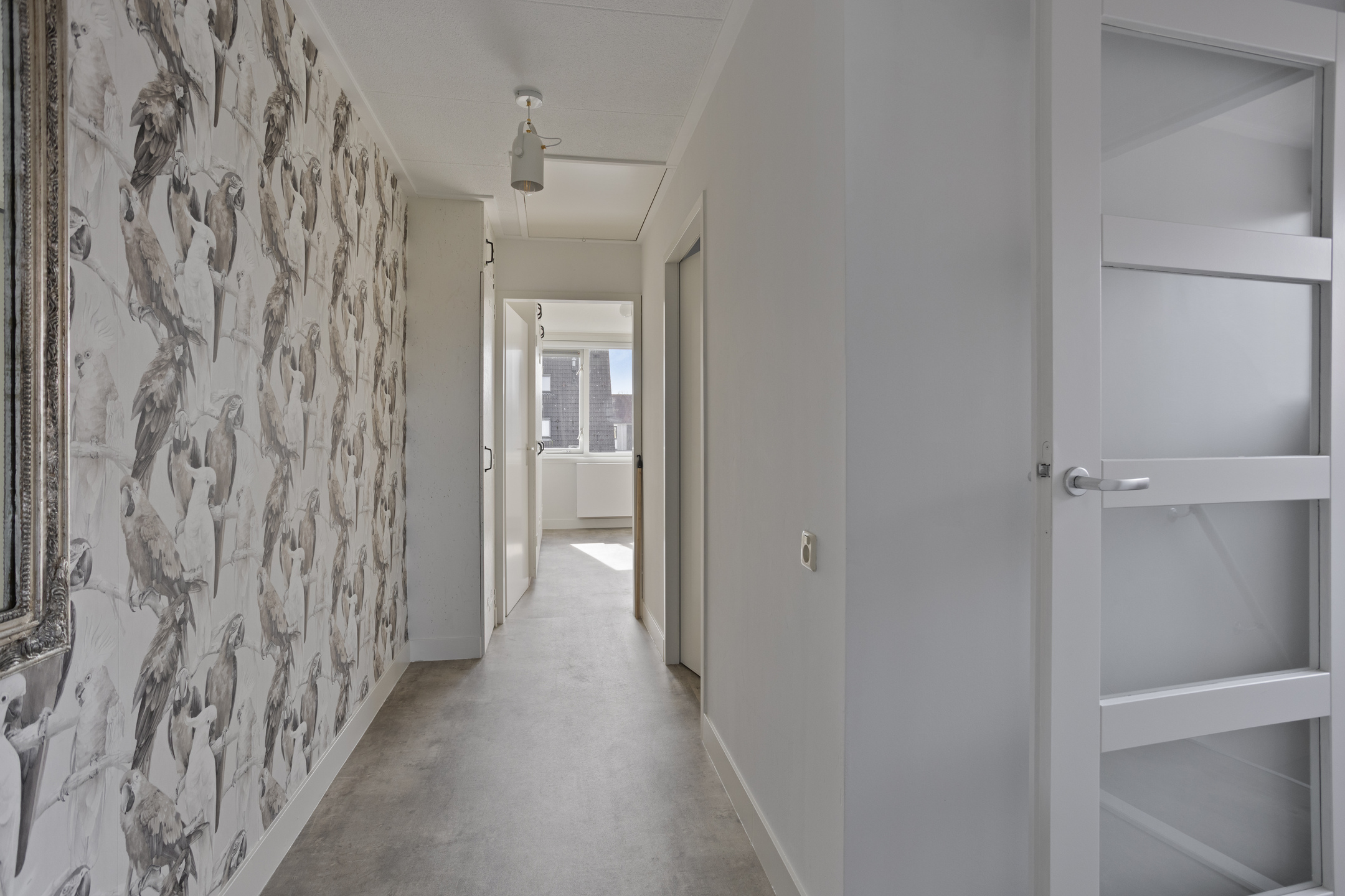 Binnenkomst in de hal, waar je de meterkast, een praktische trapkast, de toegang tot de living, de toiletruimte, de badkamer, de slaapkamer en de doorgang naar de garage aantreft.