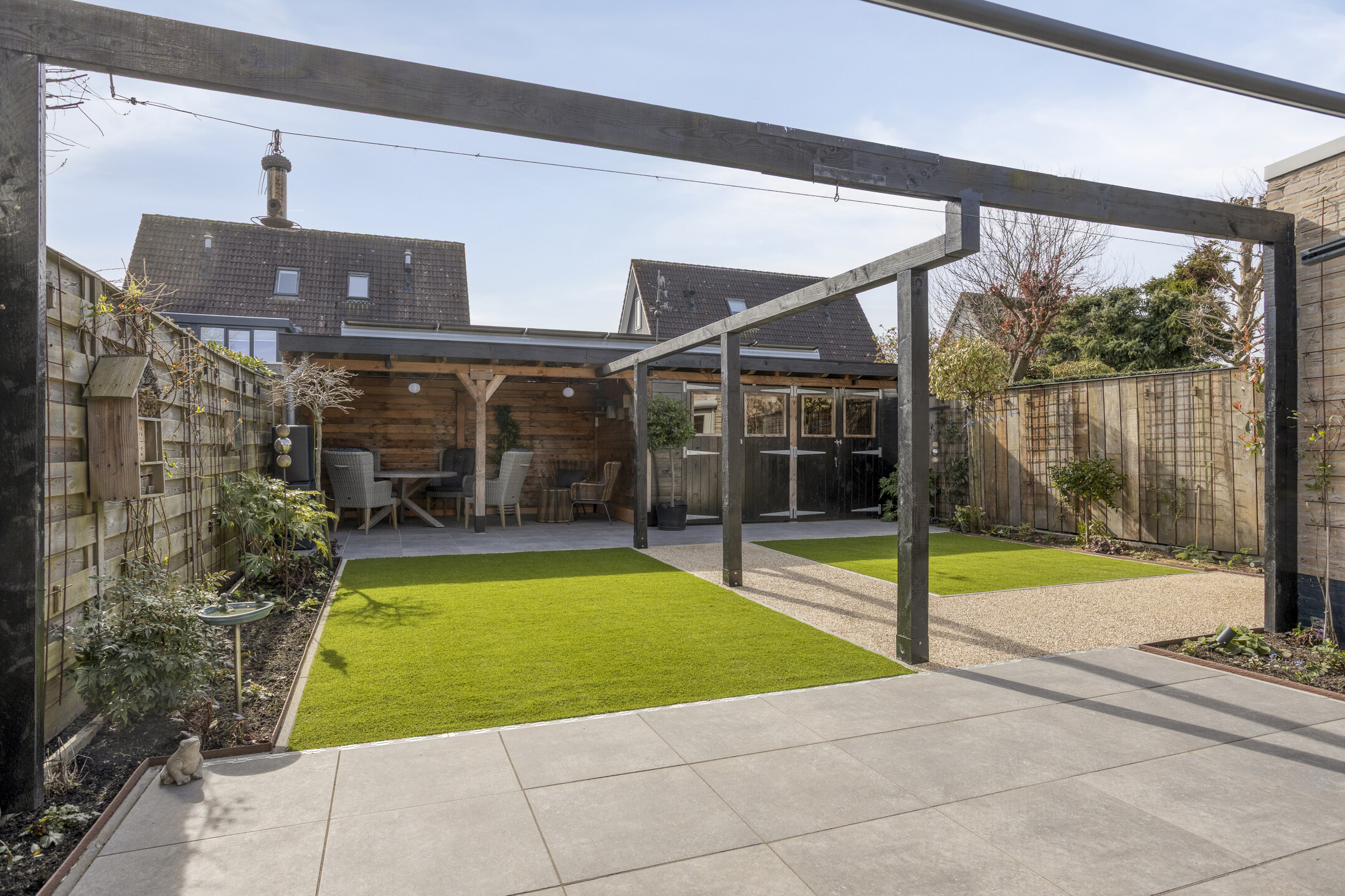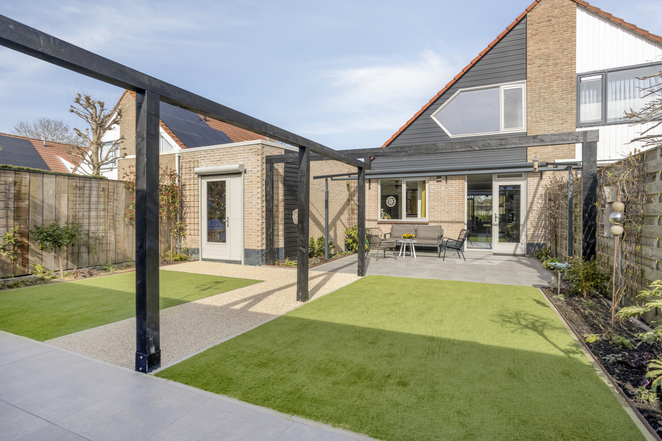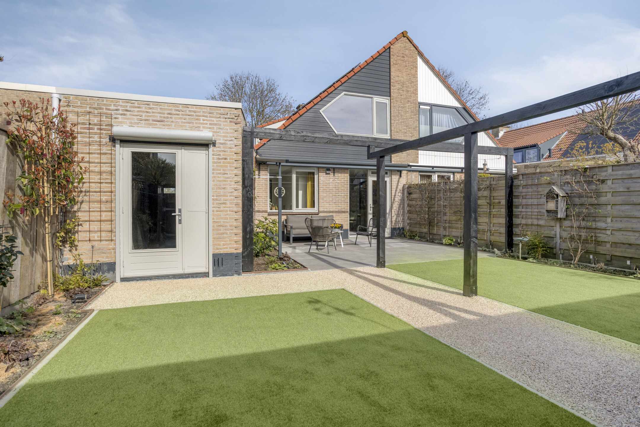 In deze tuin hoef je letterlijk niets meer te doen! De tuin is fraai en verzorgd aangelegd. Hier plaats je eenvoudig een comfortabele loungeset en geniet je volop van de zon dankzij de ligging op het zuiden. Met kunstgras en stroken beplanting is er een prettige hoeveelheid groen aanwezig met weinig onderhoud.