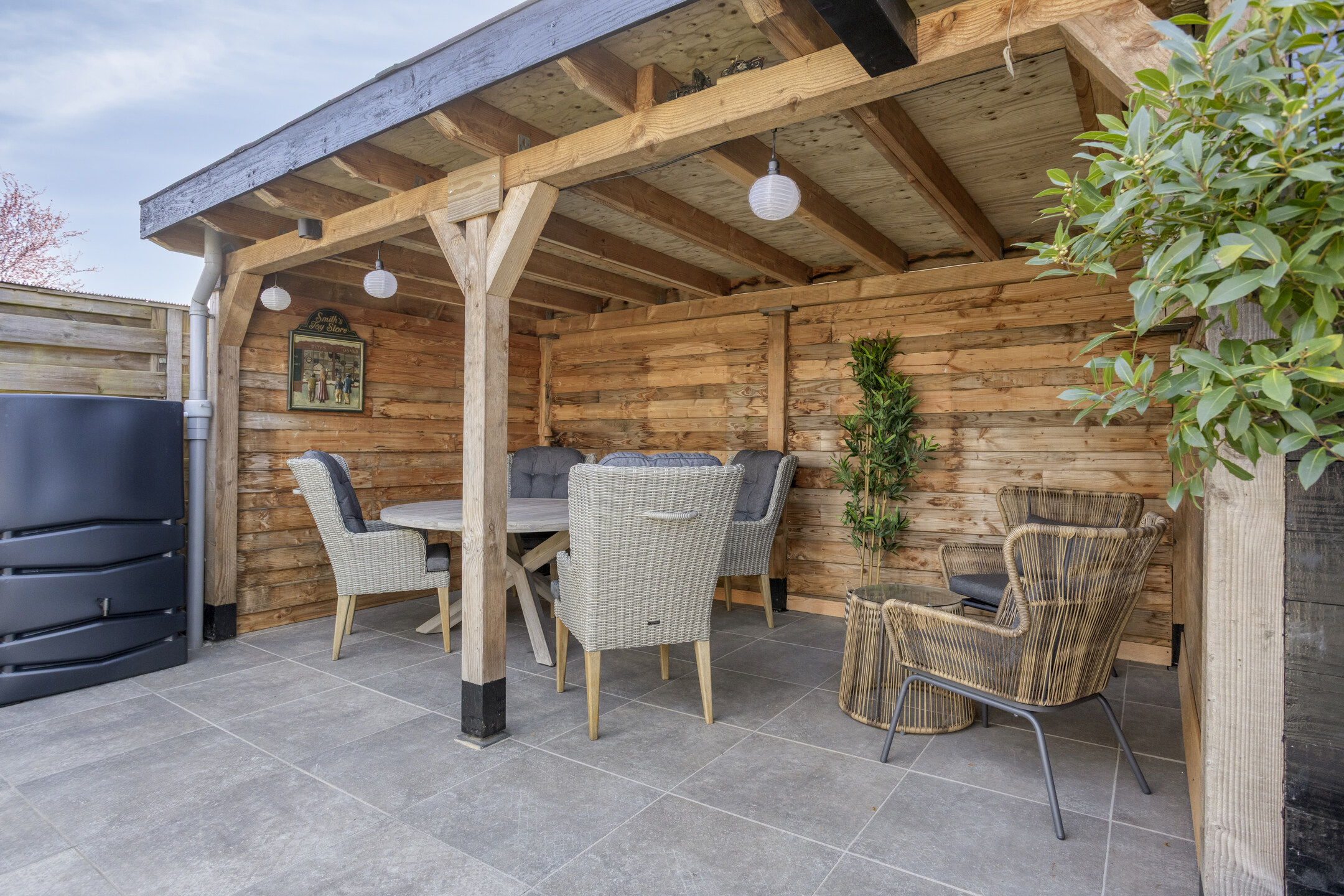 Achter in de tuin bevindt zich een in 2019 geplaatste overkapping met aansluitend een royale berging, voorzien van twee dubbele openslaande deuren. Ideaal voor wie hier een motor of groot gereedschap wil stallen.