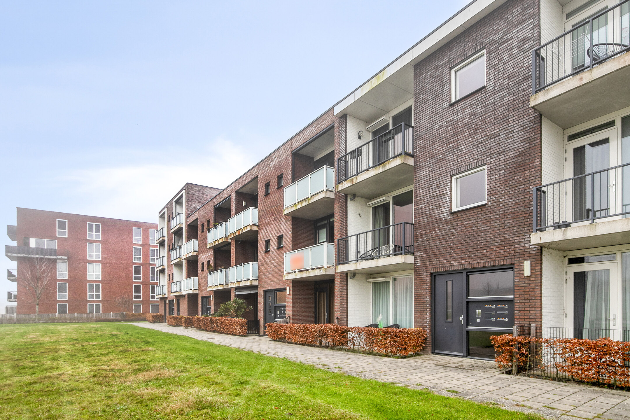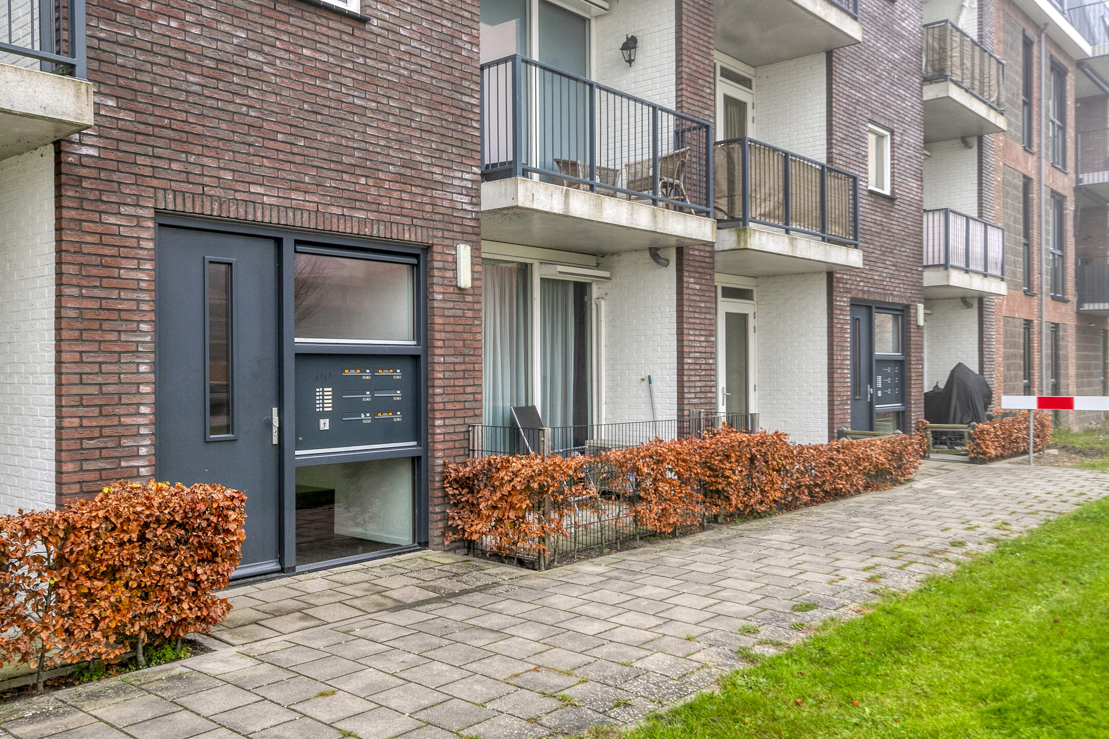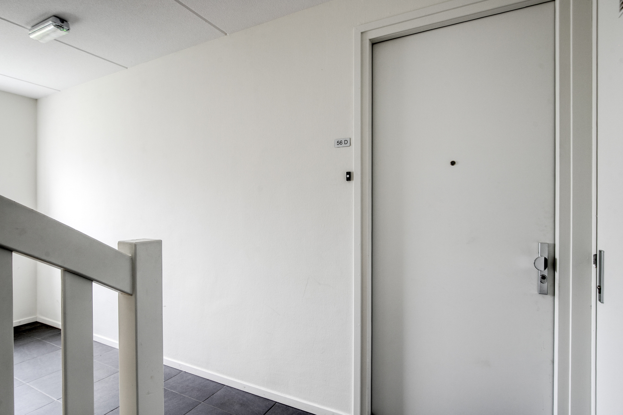 Aankomst bij het appartementencomplex met het bellentableau en de brievenbussen. Binnenkomst in de gemeenschappelijke hal met de trapopgang naar het appartement.