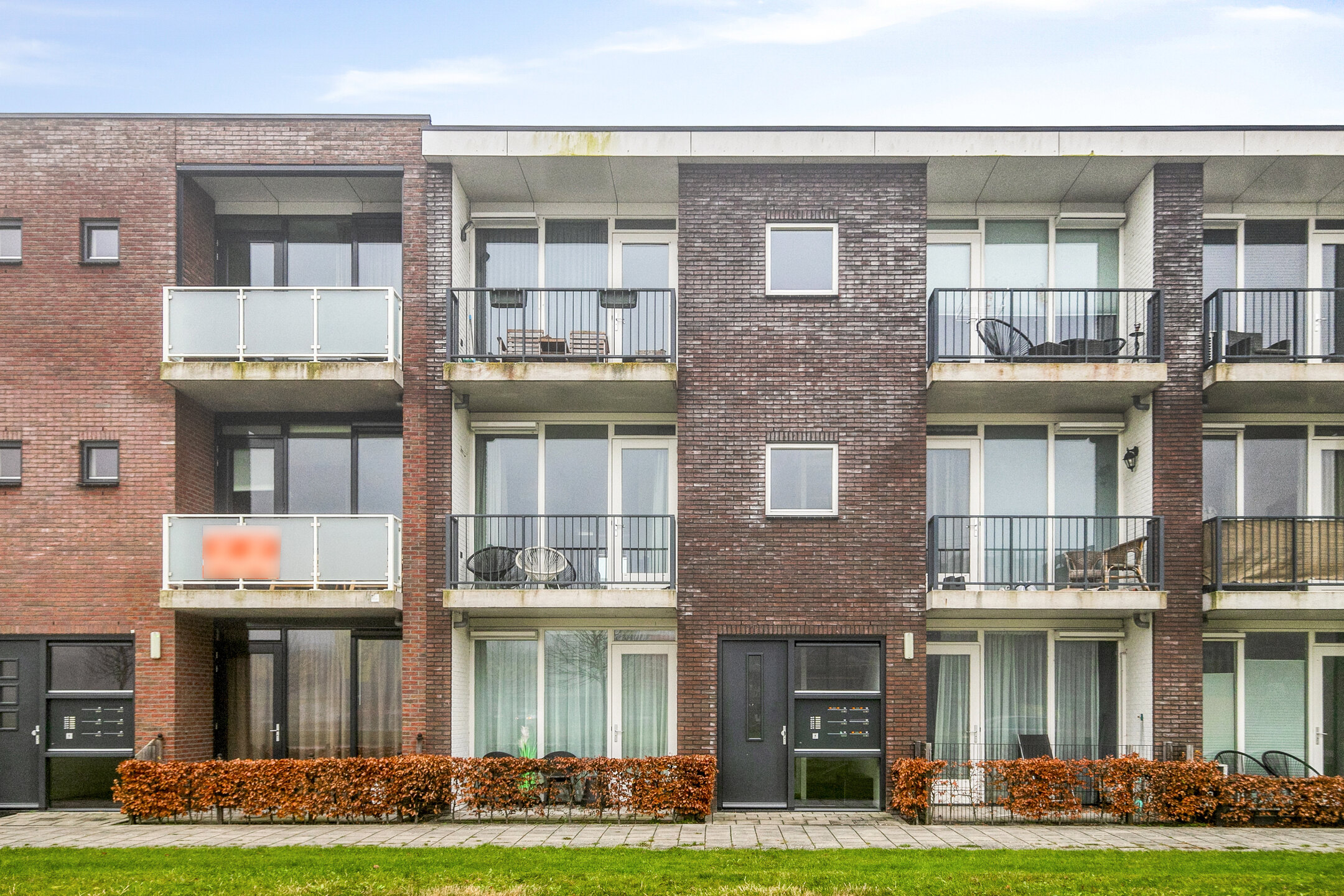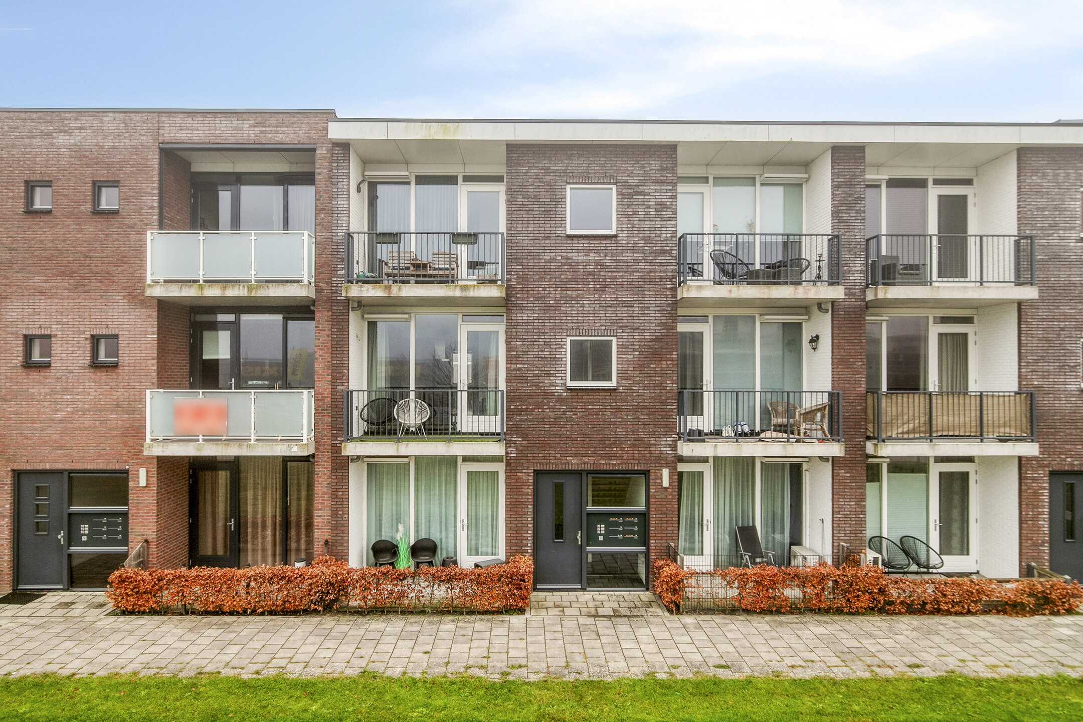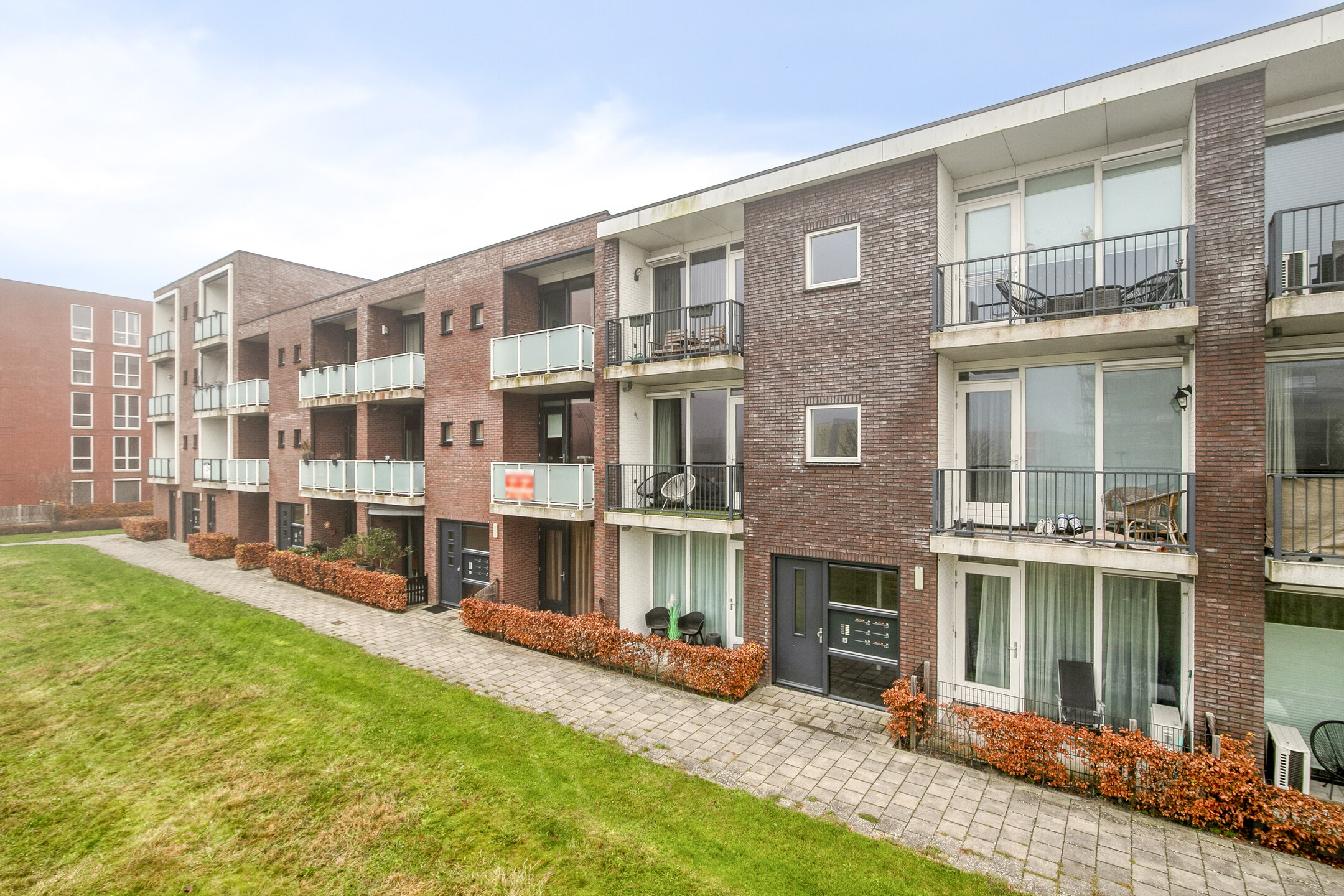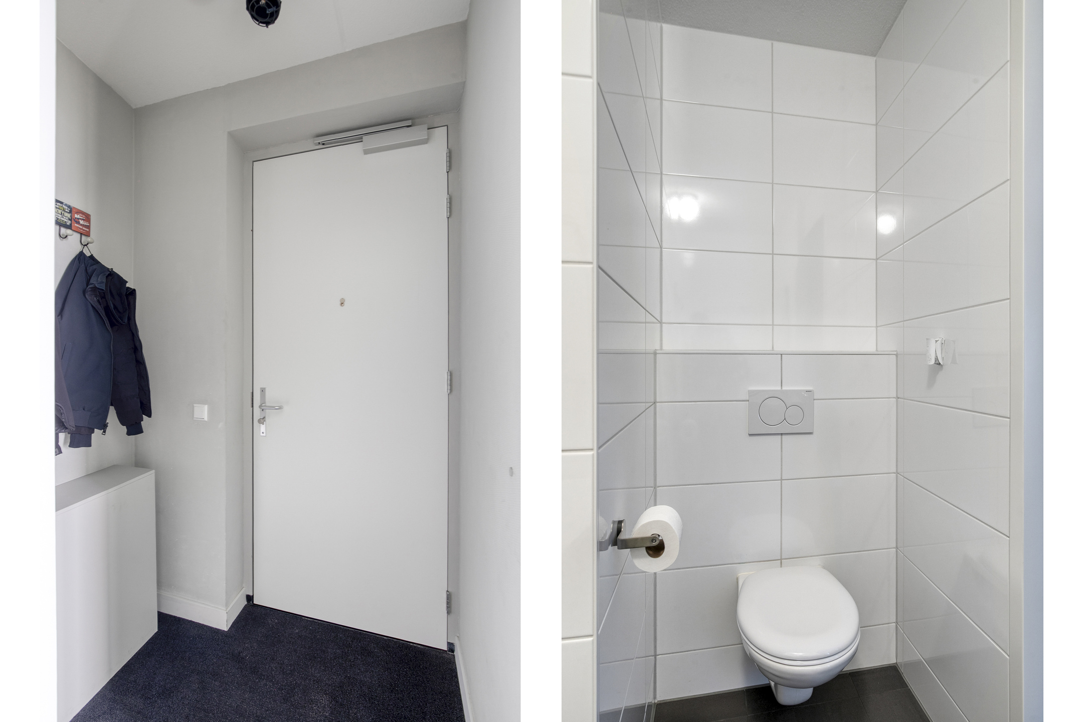 Aankomst bij het appartementencomplex met het bellentableau en de brievenbussen. Binnenkomst in de gemeenschappelijke hal met de trapopgang naar het appartement.
