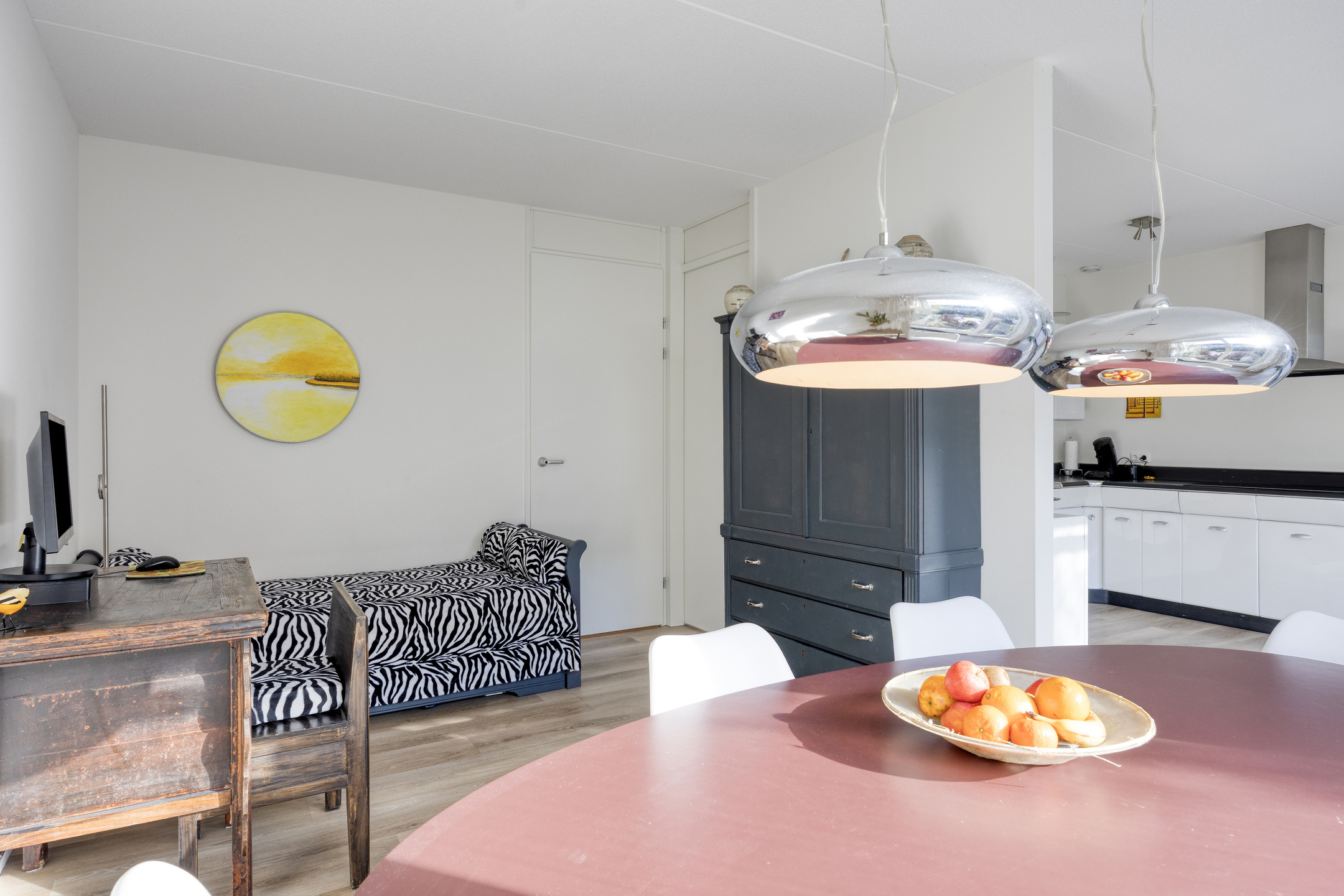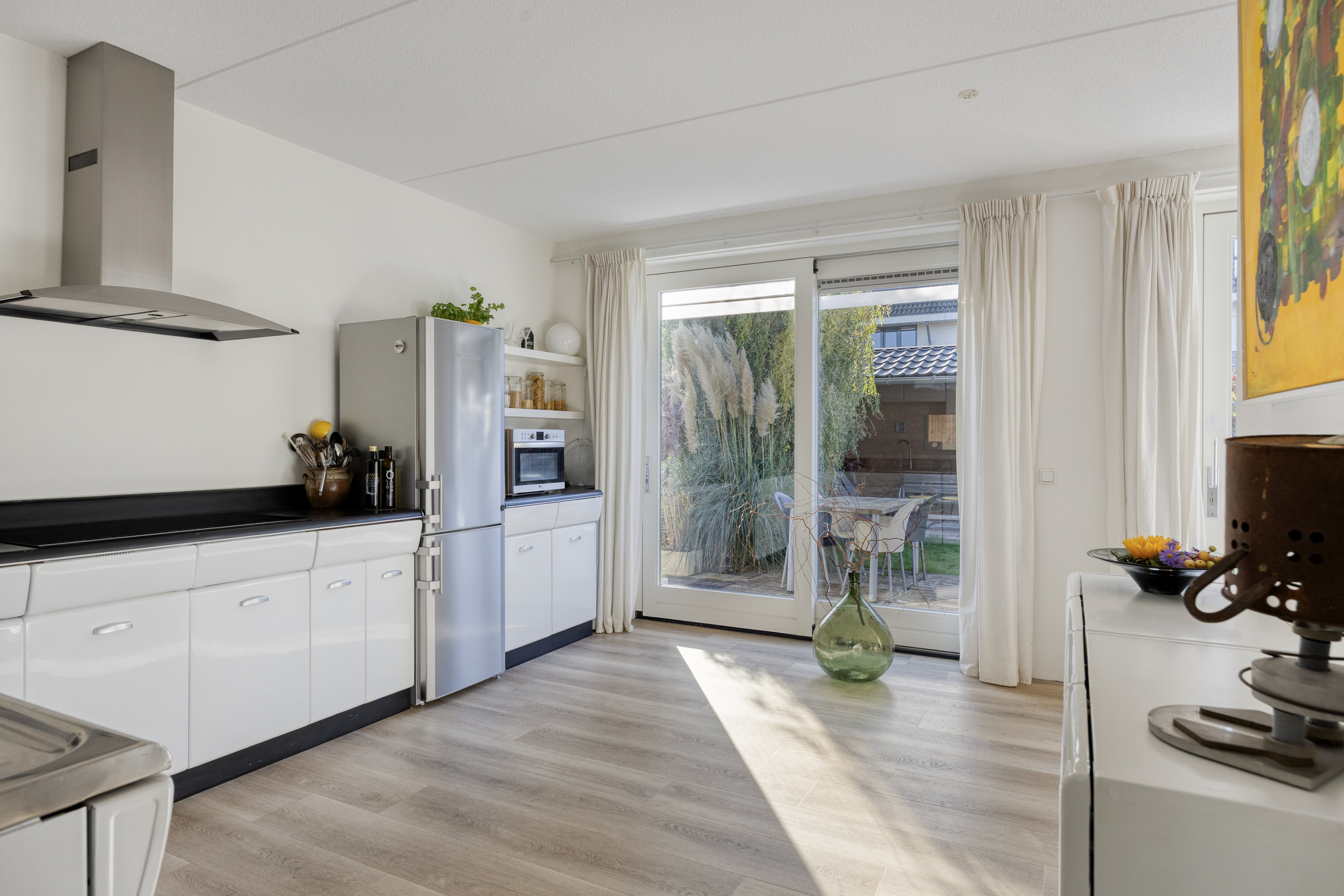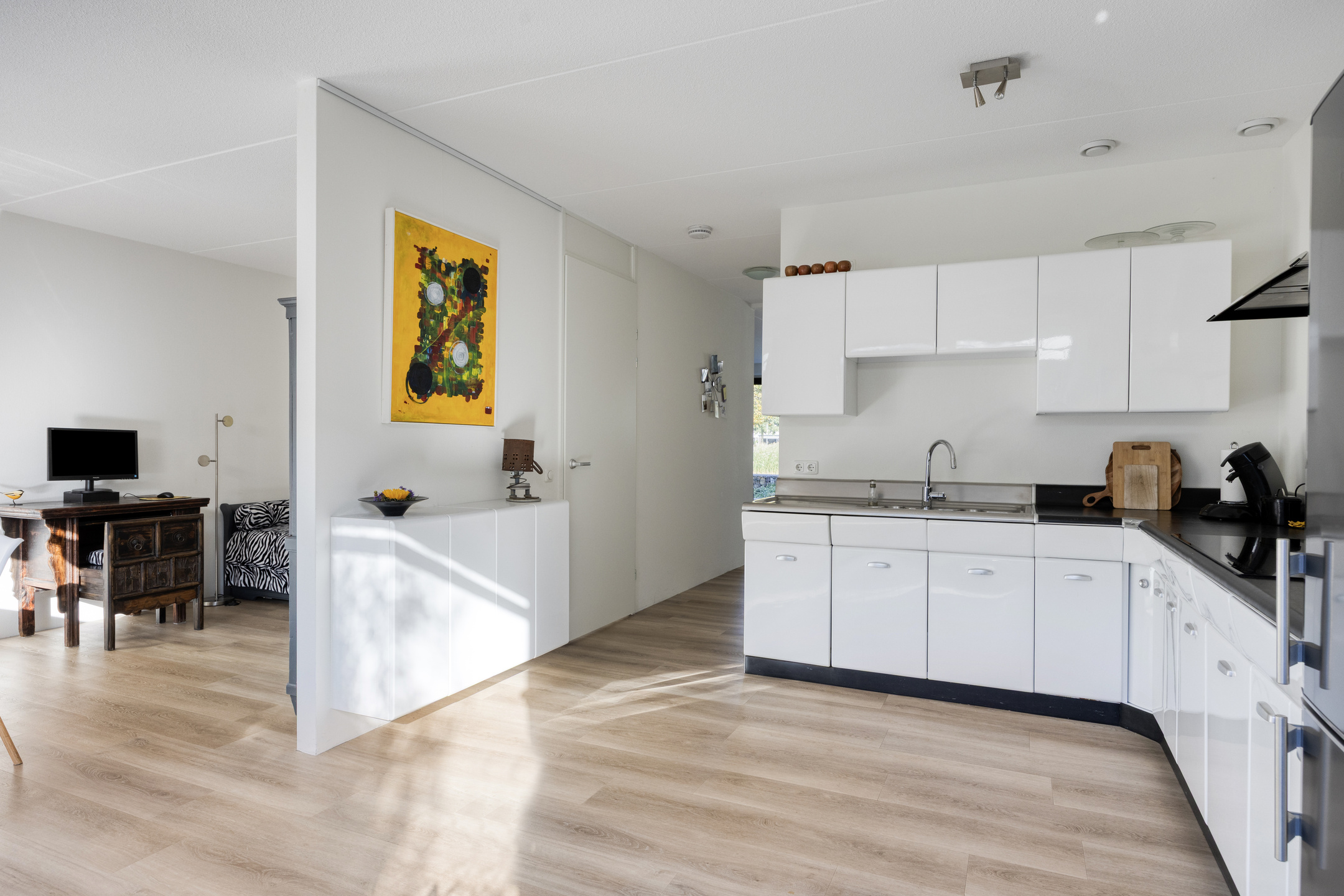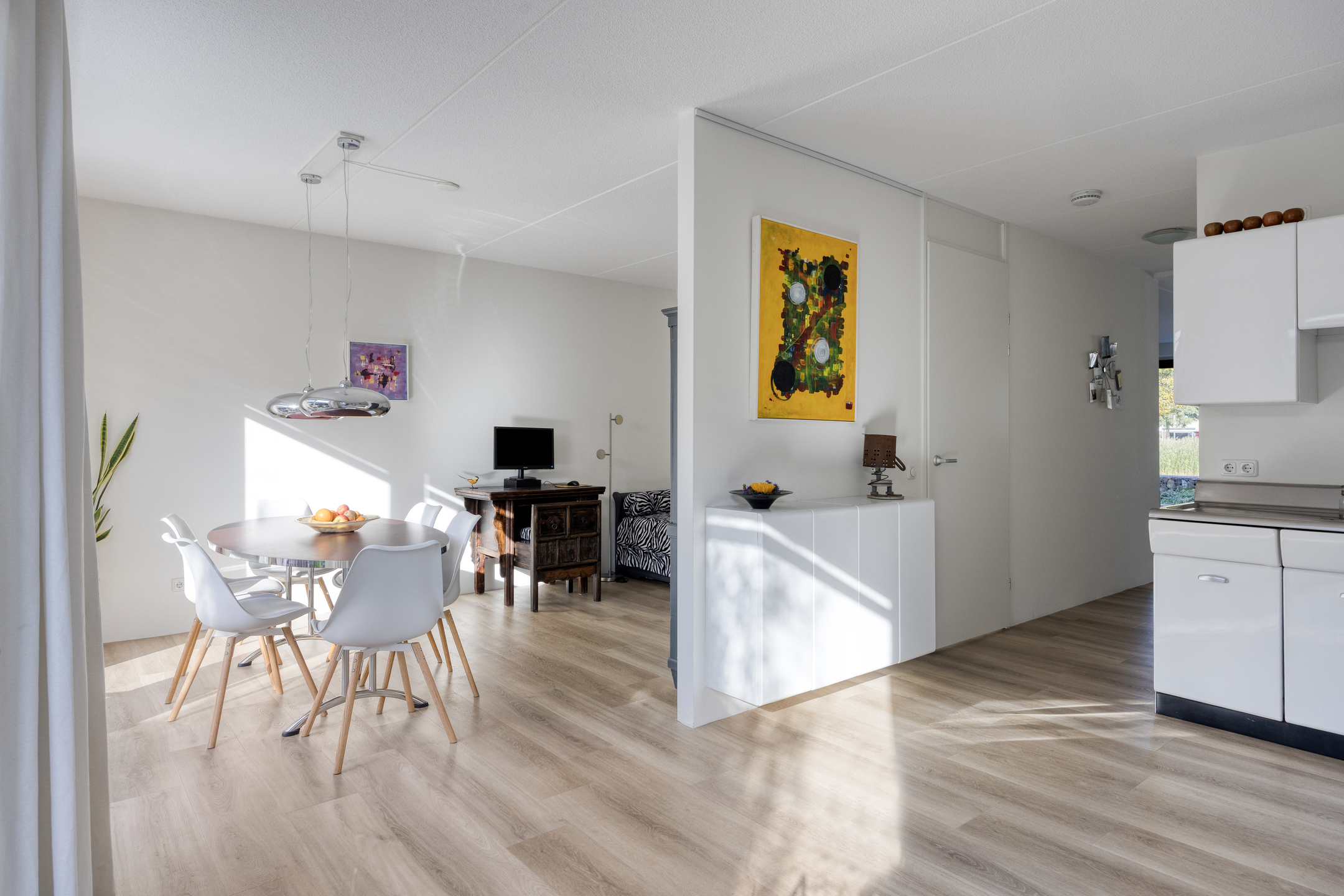Parkeer met gemak meerdere auto’s op de ruime oprit en stap via de overdekte entree de royale hal binnen. Hier vind je ruimte voor de garderobe en toegang tot de garage, de woonkamer, de meterkast en de toiletruimte. De toiletruimte is keurig afgewerkt met glad gestuukte wanden, zandkleurige tegels, een zwevend toilet en een fonteintje. Vanuit de hal stap je de woonkamer binnen, waar aan de voorzijde de zithoek is gesitueerd. Het resultaat? Prachtig vrij uitzicht over het water én enorm veel daglicht dankzij de grote raampartijen. Door de maatvoering van deze ruimte heb je volop mogelijkheden om het volledig naar eigen wens in te richten. Je treft hier verder de open trapopgang naar de eerste verdieping en een mooie pvc-vloer met comfortabele vloerverwarming (gehele begane grond). Aan de achterzijde vind je de royale designkeuken: oorspronkelijk uit 1960, maar volledig gerestaureerd en opnieuw gespoten in 2019. De witte metalen frontjes van de American Kitchen combineren prachtig met het zwarte werkblad. De keuken is uitgerust met een rvs (dubbele) spoelbak met pull-out mengkraan, een 5-pits inductiekookplaat met afzuigschouw, een vaatwasser en een vrijstaande koel-vriescombinatie. Er is bovendien volop kastruimte aanwezig en vanuit hier loop je zo de tuin in middels de schuifpui. Aansluitend aan de keuken is nu een eetkamer gecreëerd, die eenvoudig kan worden omgebouwd tot slaapkamer op de begane grond door het plaatsen van een (schuif)wand. Ook vanuit deze ruimte stap je via een tweede schuifpui de tuin in. Grenzend aan de (slaap)-/eetkamer tref je de badkamer, die stijlvol is ingericht met zandkleurige vloertegels, lichte wandtegels, een houten wastafelmeubel met luxe waskommen en geïntegreerde kranen. Een echte blikvanger! Verder is er een inloopdouche, een designradiator en de voorbereiding (leidingwerk) voor een ligbad aanwezig.