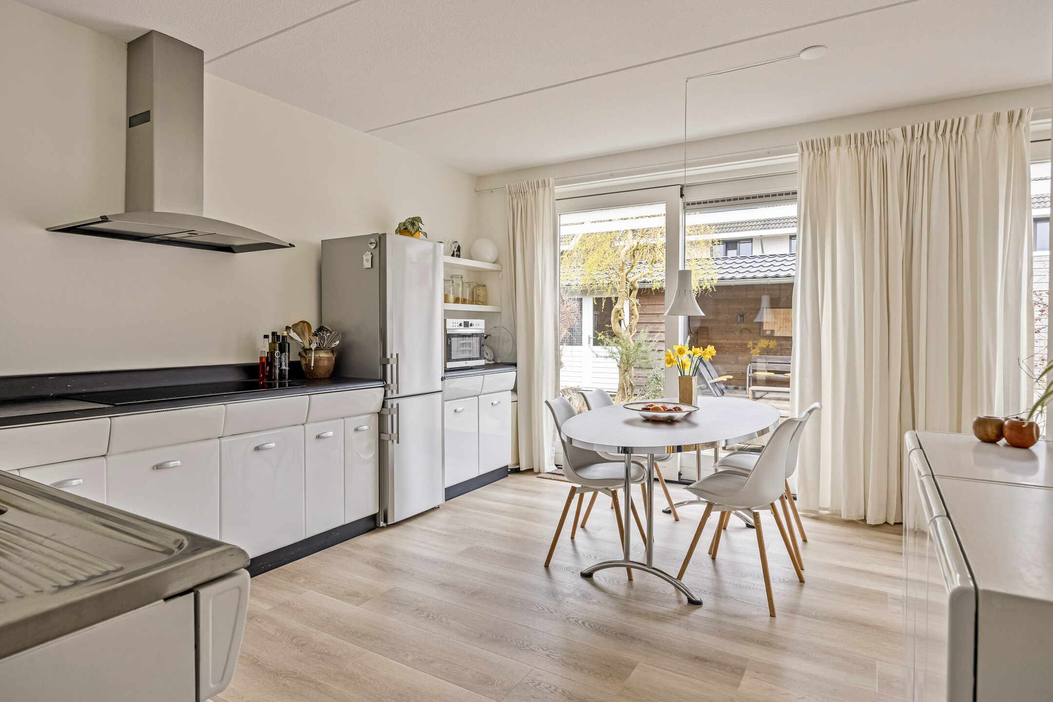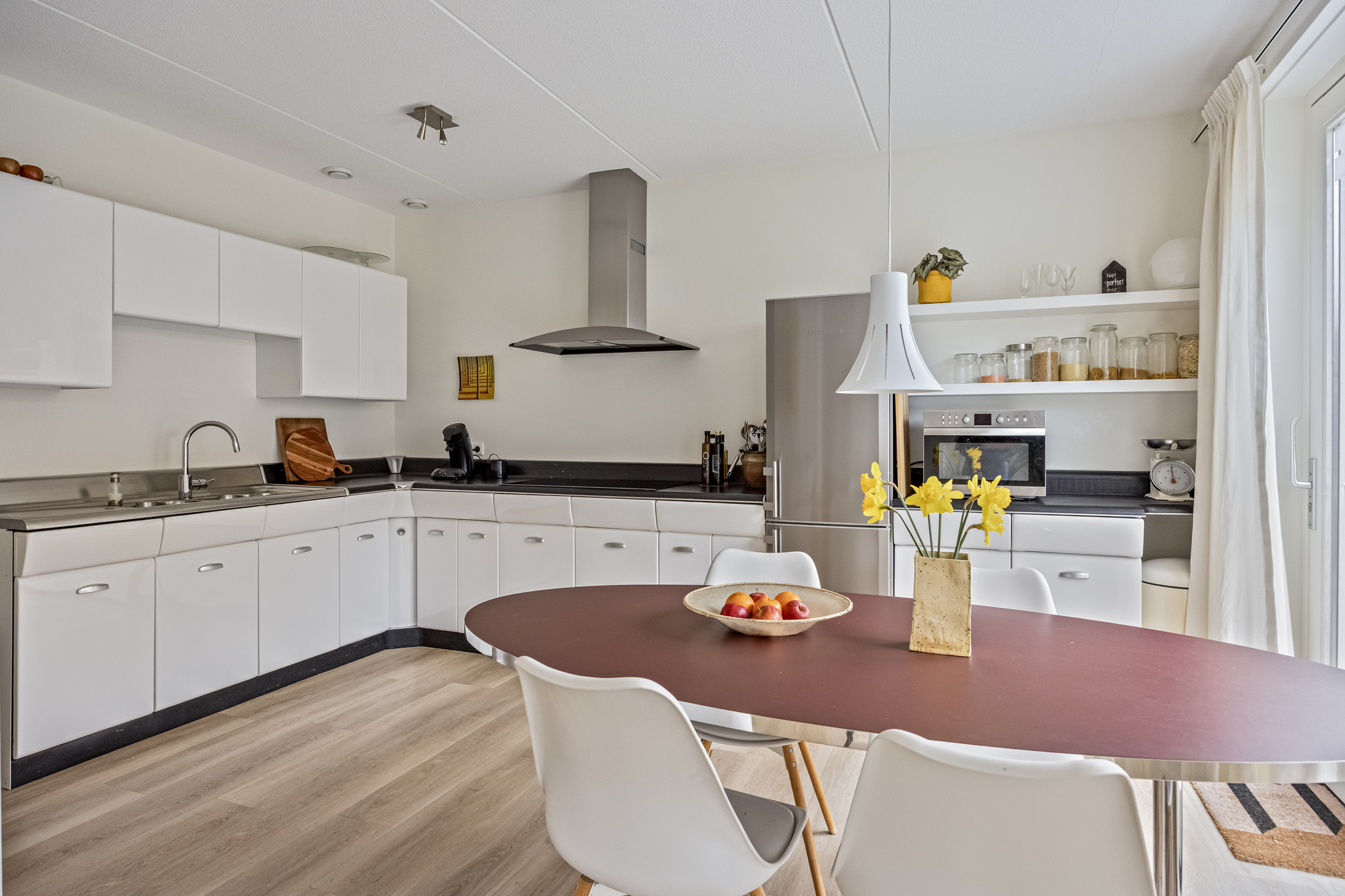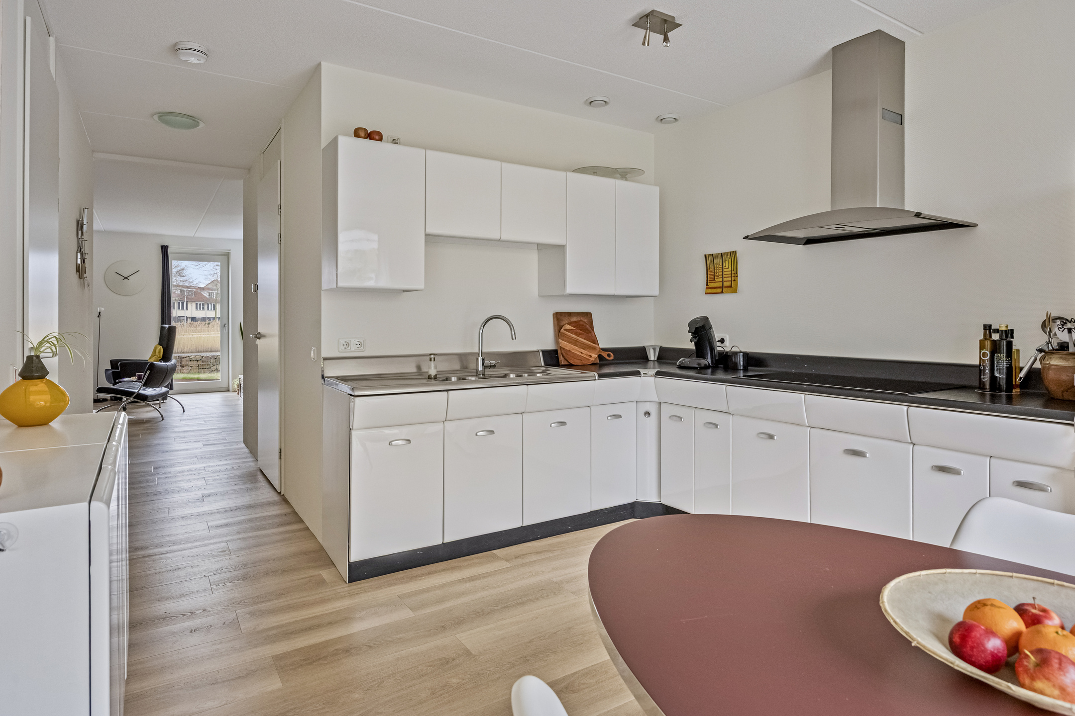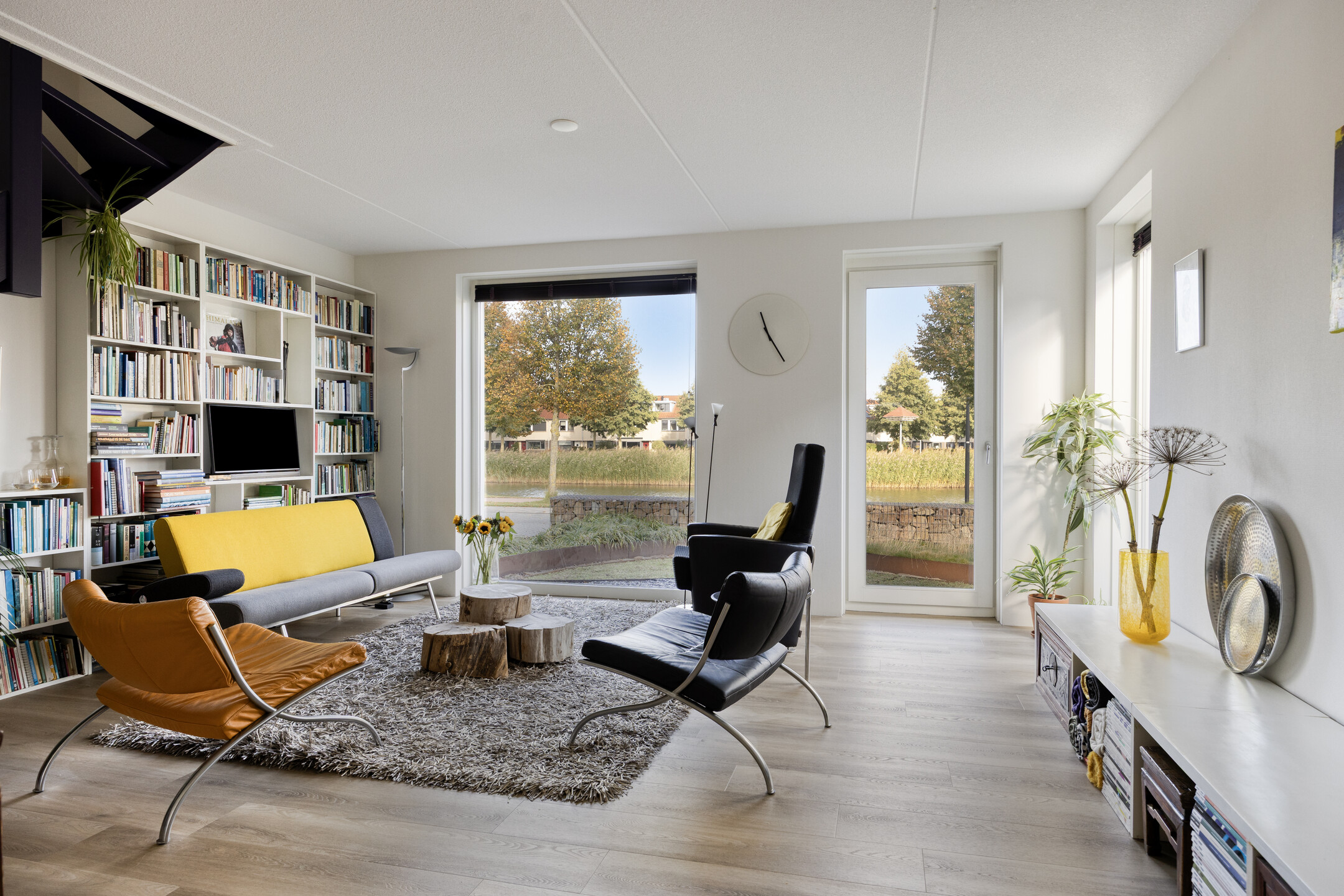 Parkeer met gemak meerdere auto’s op de ruime oprit en stap via de overdekte entree de royale hal binnen. Hier vind je ruimte voor de garderobe en toegang tot de garage, de woonkamer, de meterkast en de toiletruimte. De toiletruimte is keurig afgewerkt met glad gestuukte wanden, zandkleurige tegels, een zwevend toilet en een fonteintje. Vanuit de hal stap je de woonkamer binnen, waar aan de voorzijde de zithoek is gesitueerd. Het resultaat? Prachtig vrij uitzicht over het water én enorm veel daglicht dankzij de grote raampartijen. Door de maatvoering van deze ruimte heb je volop mogelijkheden om het volledig naar eigen wens in te richten. Je treft hier verder de open trapopgang naar de eerste verdieping en een mooie pvc-vloer met comfortabele vloerverwarming (gehele begane grond). Aan de achterzijde vind je de royale designkeuken: oorspronkelijk uit 1960, maar volledig gerestaureerd en opnieuw gespoten in 2019. De witte metalen frontjes van de American Kitchen combineren prachtig met het zwarte werkblad. De keuken is uitgerust met een rvs (dubbele) spoelbak met pull-out mengkraan, een 5-pits inductiekookplaat met afzuigschouw, een vaatwasser en een vrijstaande koel-vriescombinatie. Er is bovendien volop kastruimte aanwezig en vanuit hier loop je zo de tuin in middels de schuifpui. Aansluitend aan de keuken is nu een eetkamer gecreëerd, die eenvoudig kan worden omgebouwd tot slaapkamer op de begane grond door het plaatsen van een (schuif)wand. Ook vanuit deze ruimte stap je via een tweede schuifpui de tuin in. Grenzend aan de (slaap)-/eetkamer tref je de badkamer, die stijlvol is ingericht met zandkleurige vloertegels, lichte wandtegels, een houten wastafelmeubel met luxe waskommen en geïntegreerde kranen. Een echte blikvanger! Verder is er een inloopdouche, een designradiator en de voorbereiding (leidingwerk) voor een ligbad aanwezig.