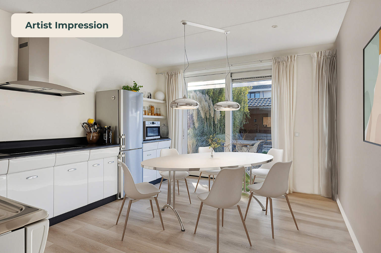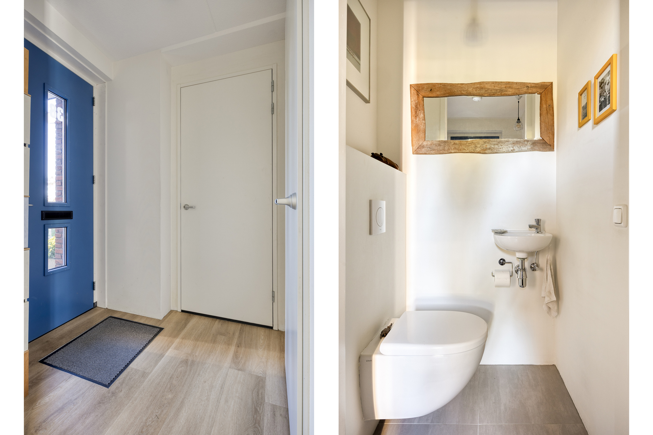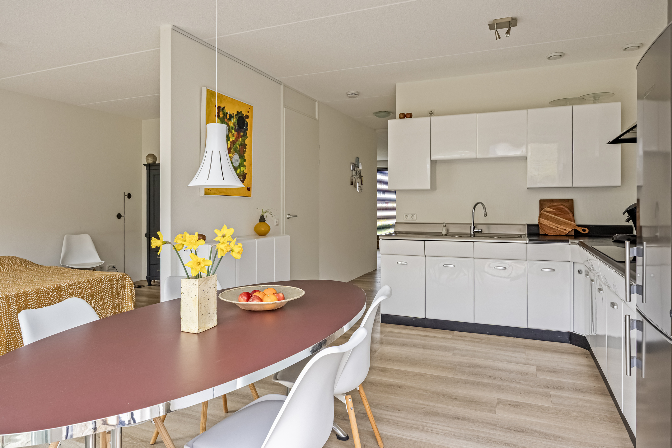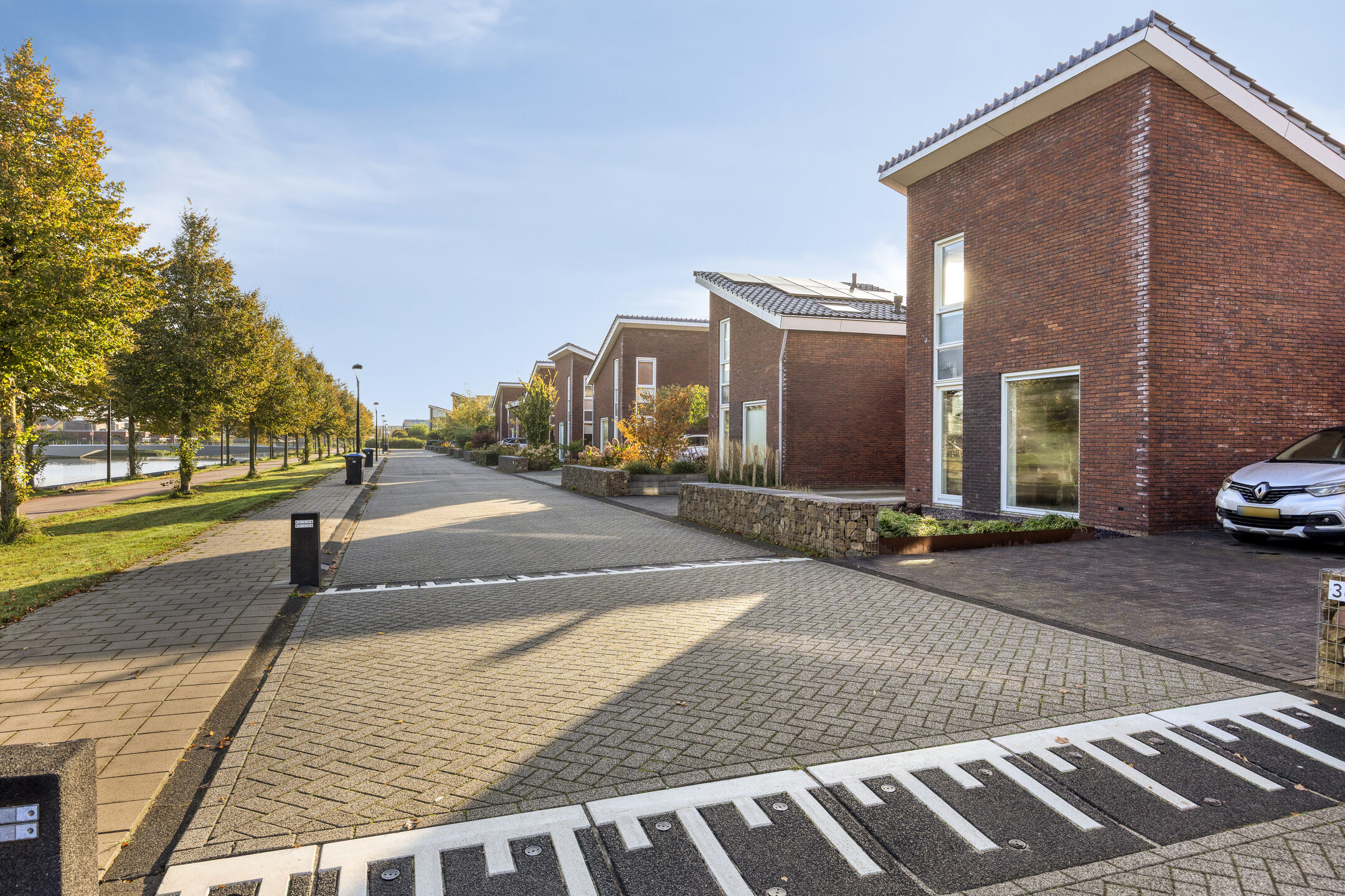 Parkeer met gemak meerdere auto’s op de ruime oprit en stap via de overdekte entree de royale hal binnen. Hier vind je ruimte voor de garderobe en toegang tot de garage, de woonkamer, de meterkast en de toiletruimte. De toiletruimte is keurig afgewerkt met glad gestuukte wanden, zandkleurige tegels, een zwevend toilet en een fonteintje. Vanuit de hal stap je de woonkamer binnen, waar aan de voorzijde de zithoek is gesitueerd. Het resultaat? Prachtig vrij uitzicht over het water én enorm veel daglicht dankzij de grote raampartijen. Door de maatvoering van deze ruimte heb je volop mogelijkheden om het volledig naar eigen wens in te richten. Je treft hier verder de open trapopgang naar de eerste verdieping en een mooie pvc-vloer met comfortabele vloerverwarming (gehele begane grond). Aan de achterzijde vind je de royale designkeuken: oorspronkelijk uit 1960, maar volledig gerestaureerd en opnieuw gespoten in 2019. De witte metalen frontjes van de American Kitchen combineren prachtig met het zwarte werkblad. De keuken is uitgerust met een rvs (dubbele) spoelbak met pull-out mengkraan, een 5-pits inductiekookplaat met afzuigschouw, een vaatwasser en een vrijstaande koel-vriescombinatie. Er is bovendien volop kastruimte aanwezig en vanuit hier loop je zo de tuin in middels de schuifpui. Aansluitend aan de keuken is nu een eetkamer gecreëerd, die eenvoudig kan worden omgebouwd tot slaapkamer op de begane grond door het plaatsen van een (schuif)wand. Ook vanuit deze ruimte stap je via een tweede schuifpui de tuin in. Grenzend aan de (slaap)-/eetkamer tref je de badkamer, die stijlvol is ingericht met zandkleurige vloertegels, lichte wandtegels, een houten wastafelmeubel met luxe waskommen en geïntegreerde kranen. Een echte blikvanger! Verder is er een inloopdouche, een designradiator en de voorbereiding (leidingwerk) voor een ligbad aanwezig.