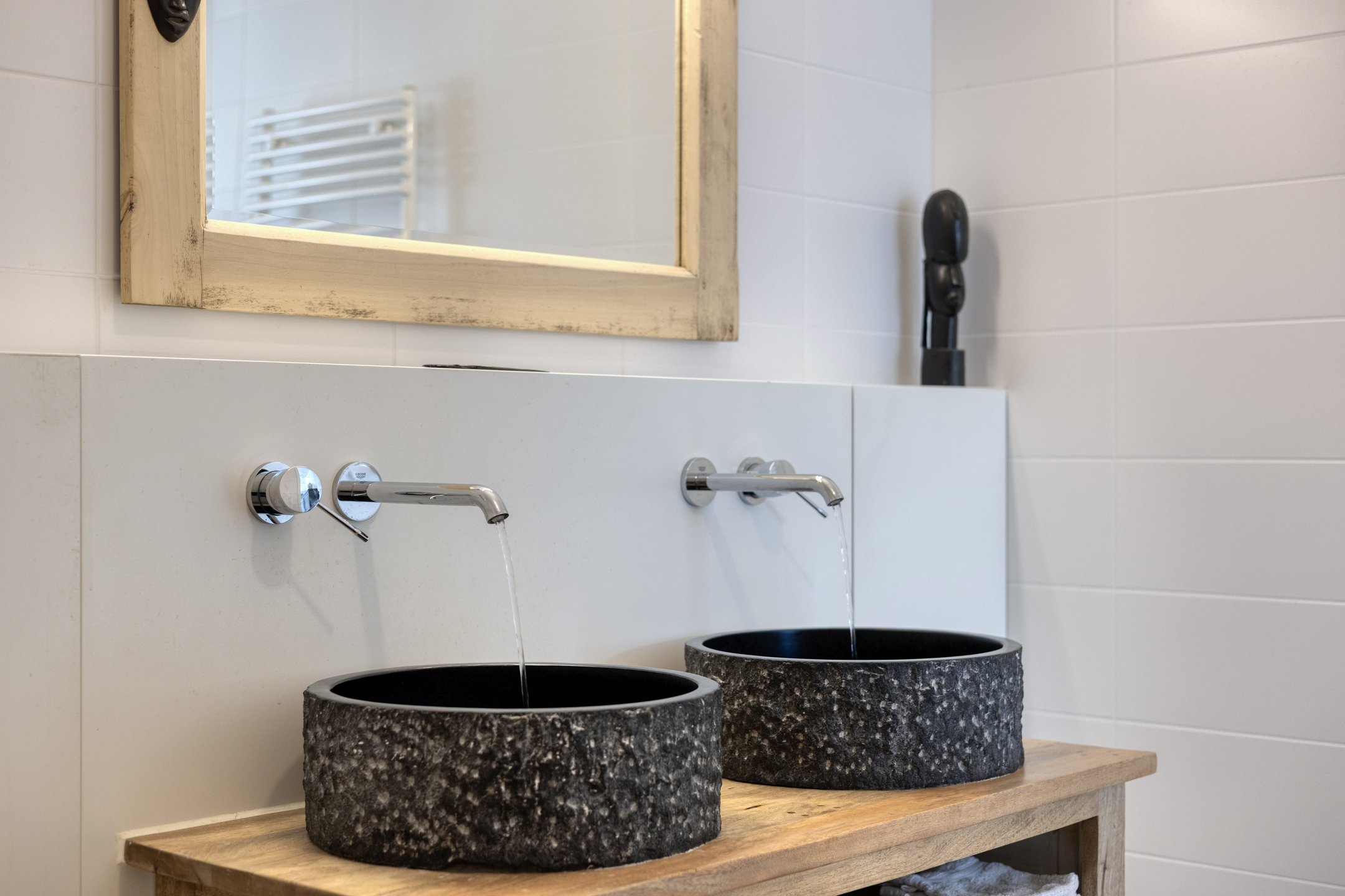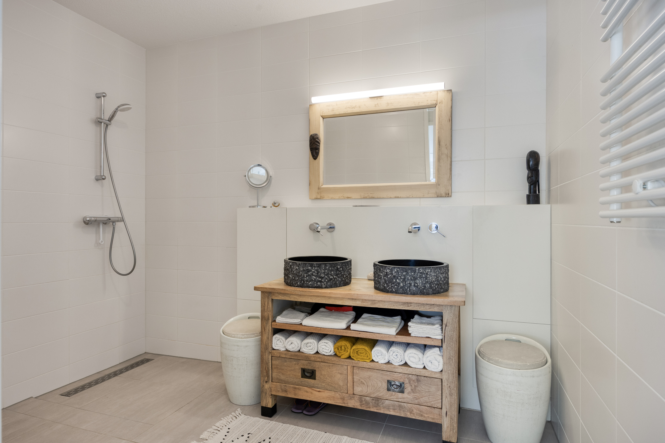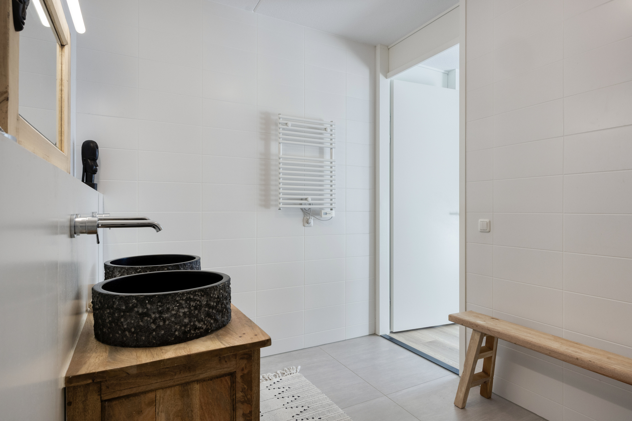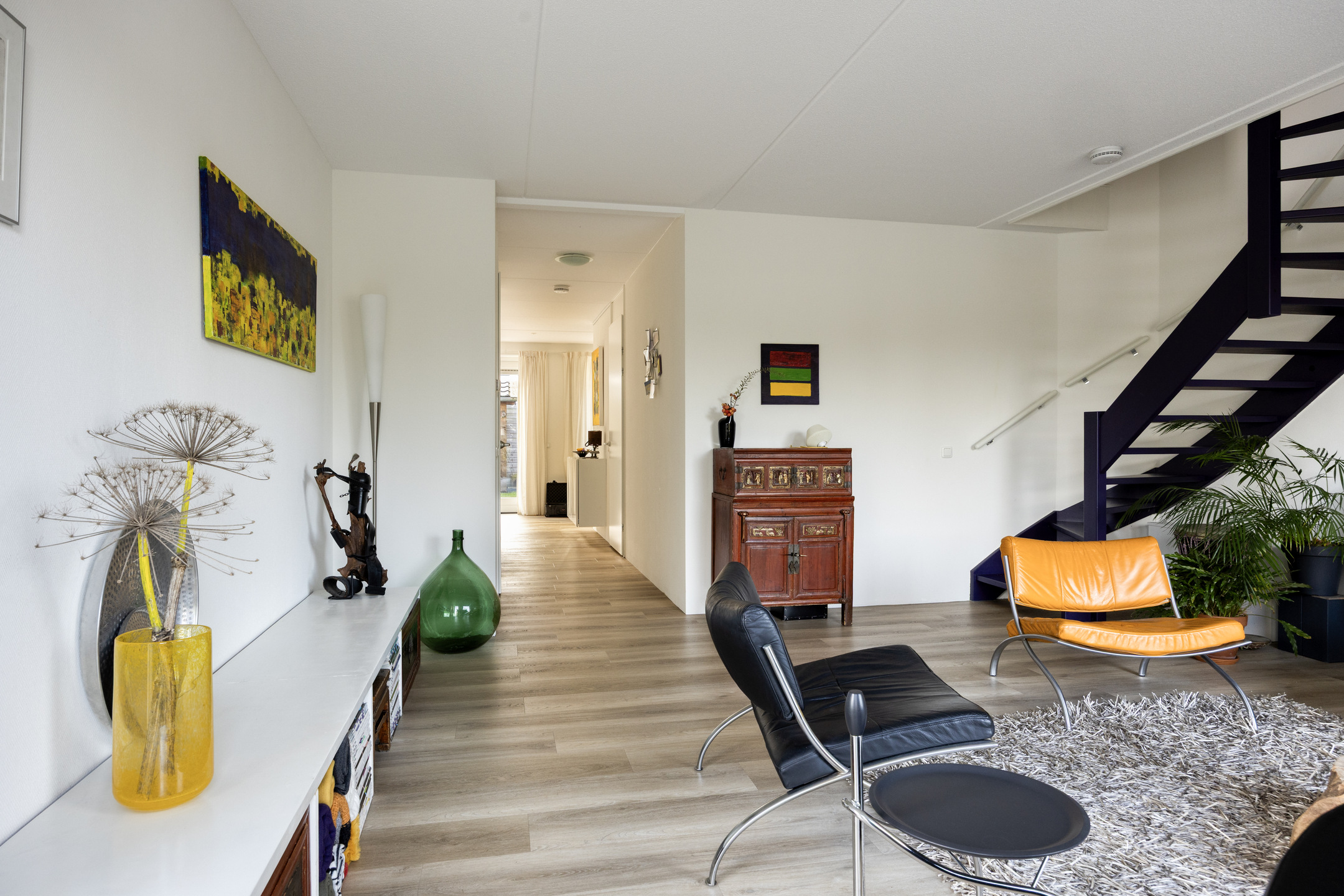 Parkeer met gemak meerdere auto’s op de ruime oprit en stap via de overdekte entree de royale hal binnen. Hier vind je ruimte voor de garderobe en toegang tot de garage, de woonkamer, de meterkast en de toiletruimte. De toiletruimte is keurig afgewerkt met glad gestuukte wanden, zandkleurige tegels, een zwevend toilet en een fonteintje. Vanuit de hal stap je de woonkamer binnen, waar aan de voorzijde de zithoek is gesitueerd. Het resultaat? Prachtig vrij uitzicht over het water én enorm veel daglicht dankzij de grote raampartijen. Door de maatvoering van deze ruimte heb je volop mogelijkheden om het volledig naar eigen wens in te richten. Je treft hier verder de open trapopgang naar de eerste verdieping en een mooie pvc-vloer met comfortabele vloerverwarming (gehele begane grond). Aan de achterzijde vind je de royale designkeuken: oorspronkelijk uit 1960, maar volledig gerestaureerd en opnieuw gespoten in 2019. De witte metalen frontjes van de American Kitchen combineren prachtig met het zwarte werkblad. De keuken is uitgerust met een rvs (dubbele) spoelbak met pull-out mengkraan, een 5-pits inductiekookplaat met afzuigschouw, een vaatwasser en een vrijstaande koel-vriescombinatie. Er is bovendien volop kastruimte aanwezig en vanuit hier loop je zo de tuin in middels de schuifpui. Aansluitend aan de keuken is nu een eetkamer gecreëerd, die eenvoudig kan worden omgebouwd tot slaapkamer op de begane grond door het plaatsen van een (schuif)wand. Ook vanuit deze ruimte stap je via een tweede schuifpui de tuin in. Grenzend aan de (slaap)-/eetkamer tref je de badkamer, die stijlvol is ingericht met zandkleurige vloertegels, lichte wandtegels, een houten wastafelmeubel met luxe waskommen en geïntegreerde kranen. Een echte blikvanger! Verder is er een inloopdouche, een designradiator en de voorbereiding (leidingwerk) voor een ligbad aanwezig.
