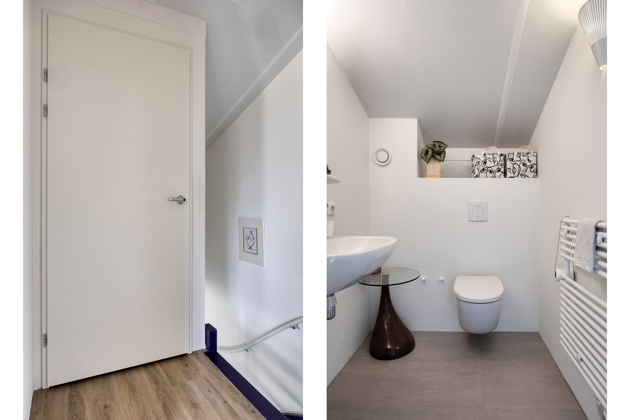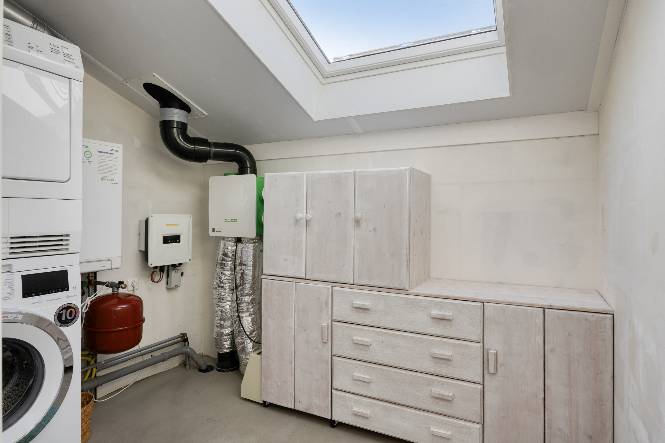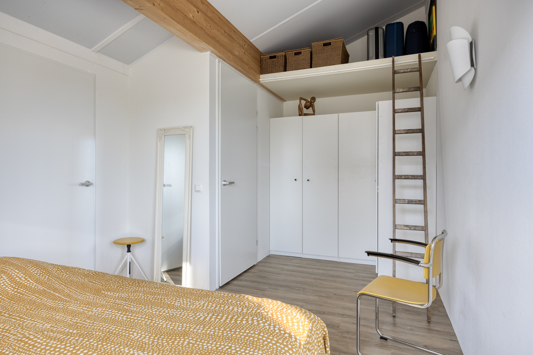 Vanaf de overloop bereik je de slaapkamer en de extra ruime toiletruimte met wastafel. De ruimte is op dit moment voorzien van een zwevend toilet, een wastafel en een designradiator, met nog voldoende plek voor een extra meubel. De slaapkamer is heerlijk licht dankzij de grote ramen en het uitzicht is werkelijk fantastisch: vanuit je bed kijk je vrij uit over het water! In deze royale kamer is een entresol geplaatst voor extra bergruimte en er is voldoende plek voor een grote kledingkast. Fijne bijkomstigheid: ook hier is een mooie pvc-vloer met vloerverwarming aanwezig. Aansluitend vind je de technische ruimte met aansluitingen voor de wasmachine en droger, de mv-unit, de omvormer, de cv-installatie en extra opbergruimte. Dankzij het dakraam is ook deze ruimte prettig licht.
