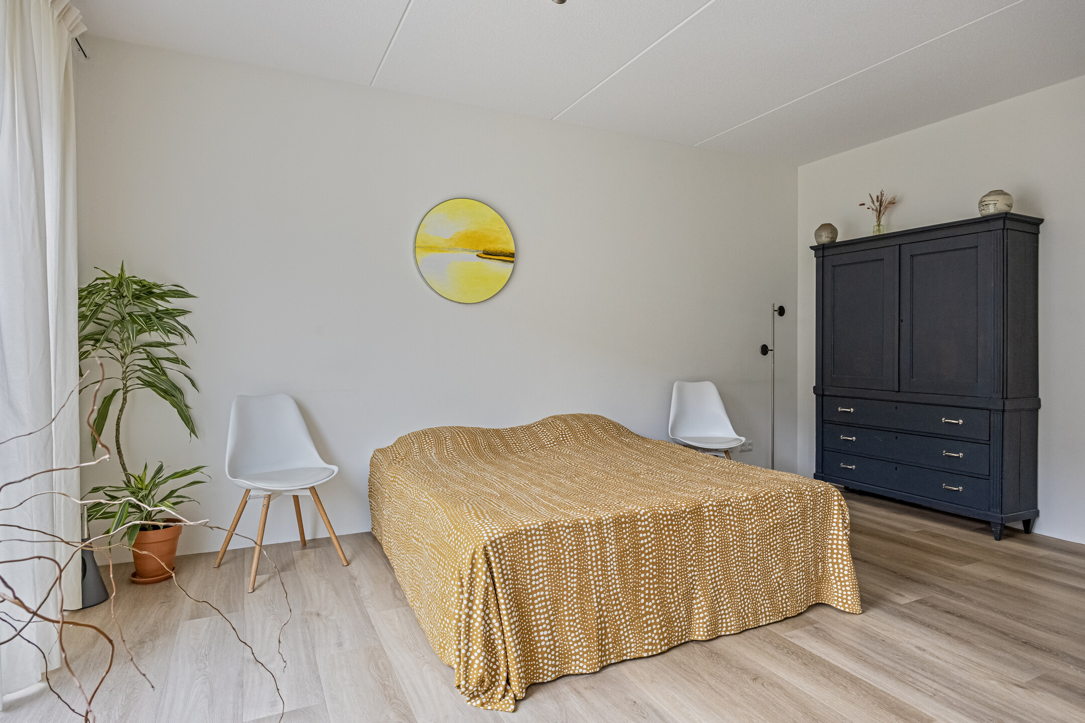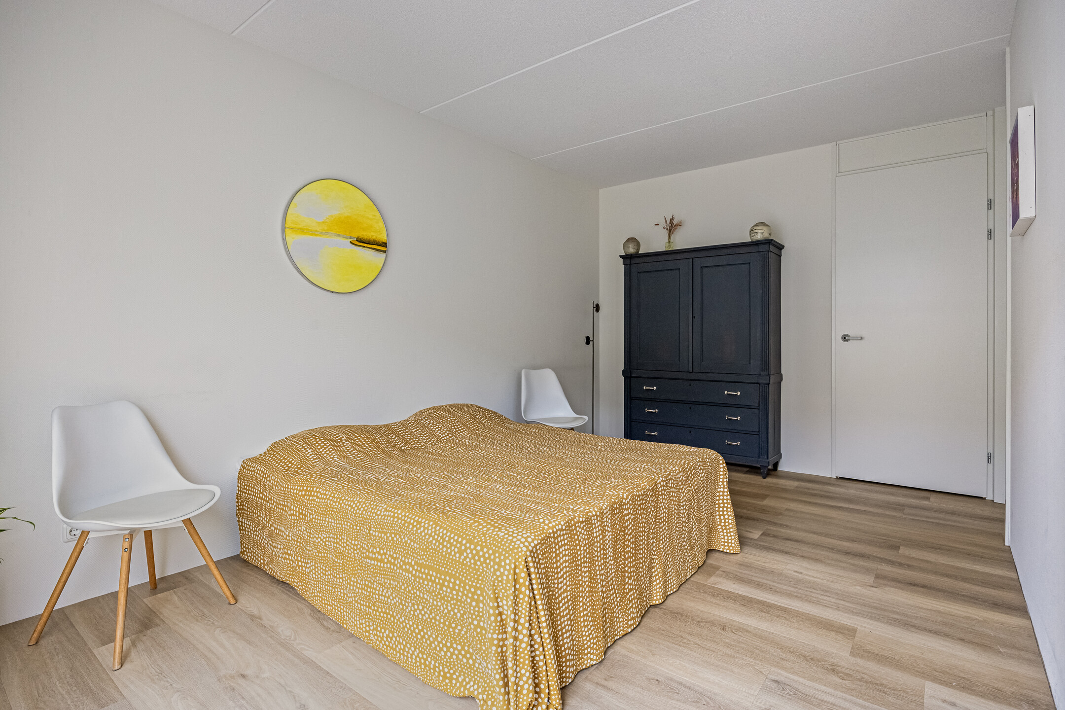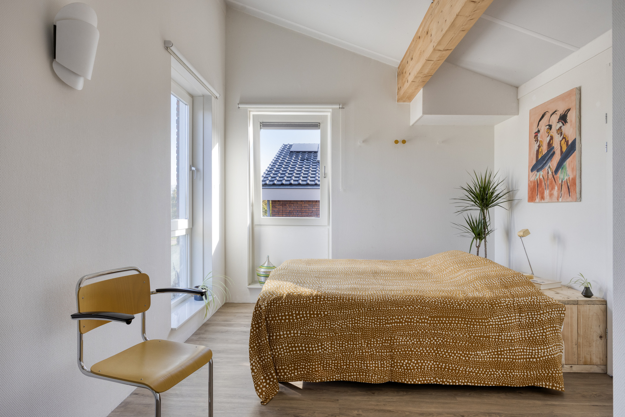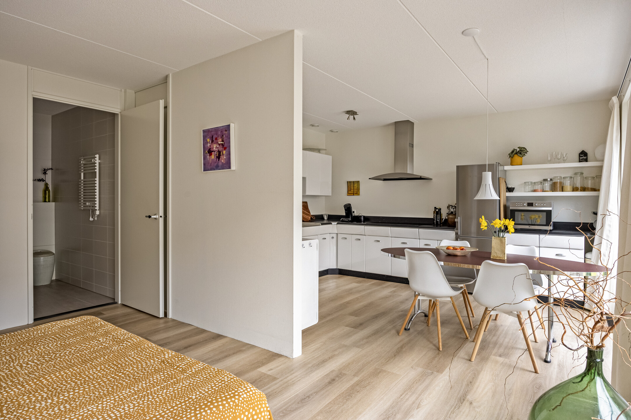 Vanaf de overloop bereik je de slaapkamer en de extra ruime toiletruimte met wastafel. De ruimte is op dit moment voorzien van een zwevend toilet, een wastafel en een designradiator, met nog voldoende plek voor een extra meubel. De slaapkamer is heerlijk licht dankzij de grote ramen en het uitzicht is werkelijk fantastisch: vanuit je bed kijk je vrij uit over het water! In deze royale kamer is een entresol geplaatst voor extra bergruimte en er is voldoende plek voor een grote kledingkast. Fijne bijkomstigheid: ook hier is een mooie pvc-vloer met vloerverwarming aanwezig. Aansluitend vind je de technische ruimte met aansluitingen voor de wasmachine en droger, de mv-unit, de omvormer, de cv-installatie en extra opbergruimte. Dankzij het dakraam is ook deze ruimte prettig licht.