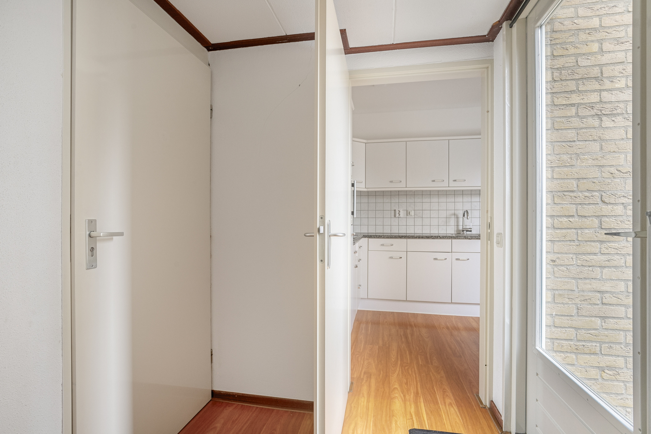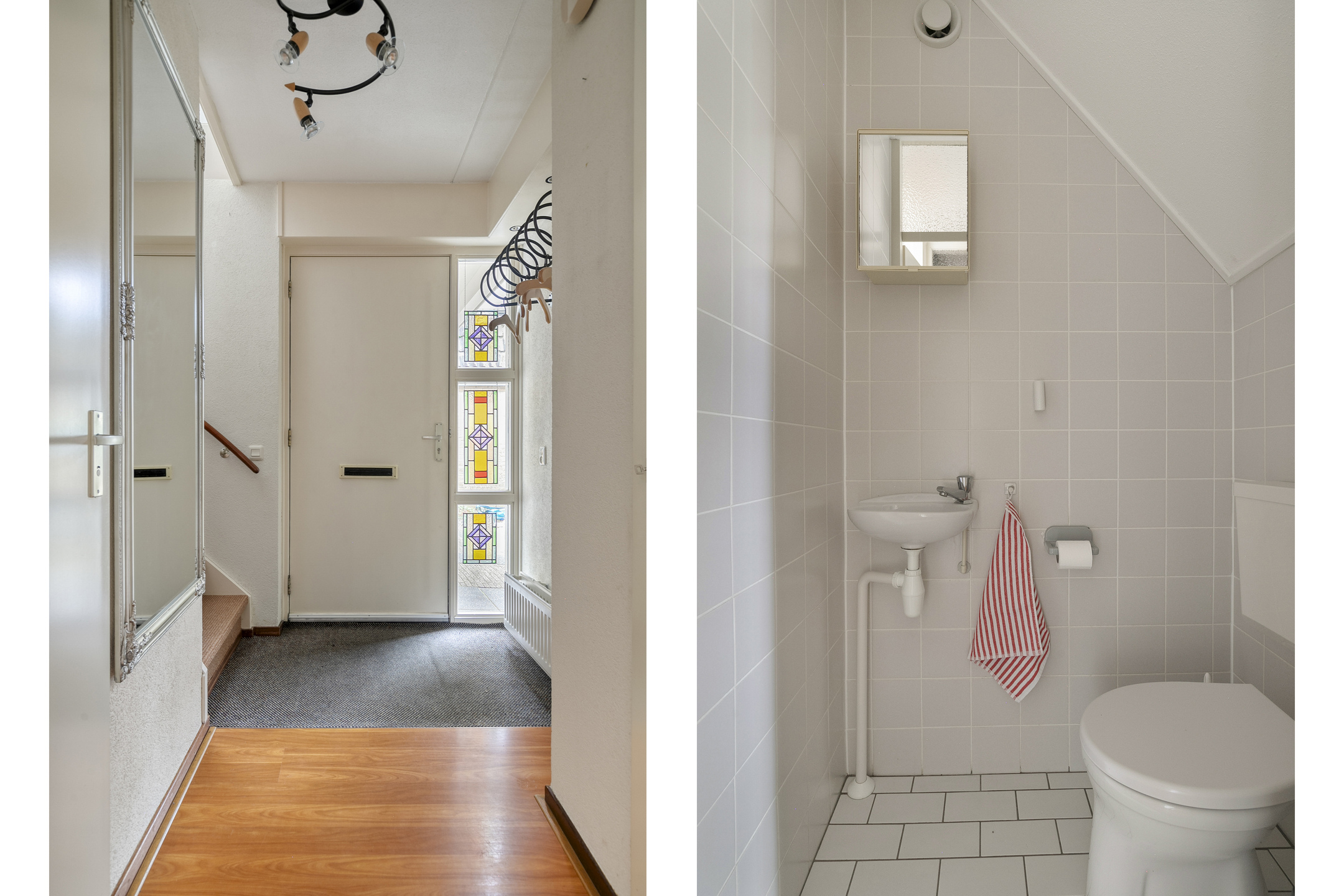 Overdekte entree met binnenkomst in de hal. Hier bevinden zich de meterkast, de trapopgang, de toiletruimte en de doorgang naar de woonkamer. De toiletruimte is volledig betegeld en voorzien van een staand toilet met fonteintje. De hal is afgewerkt met een nette laminaatvloer en spachtelputz wandafwerking wat is doorgetrokken in de woonkamer.