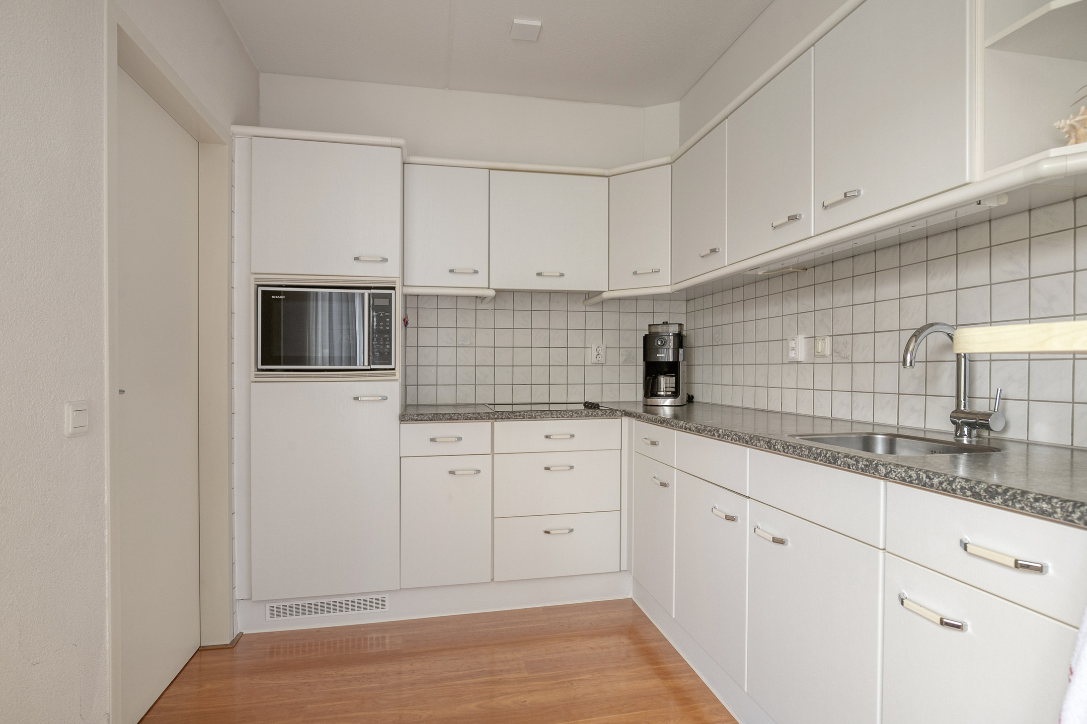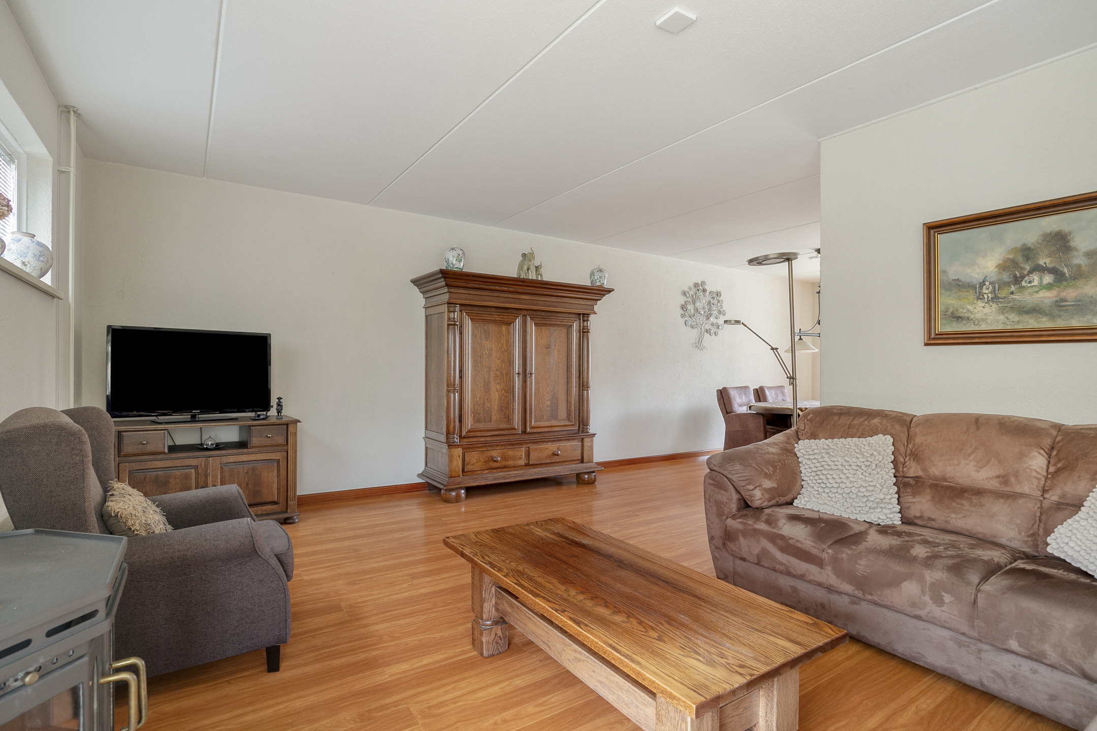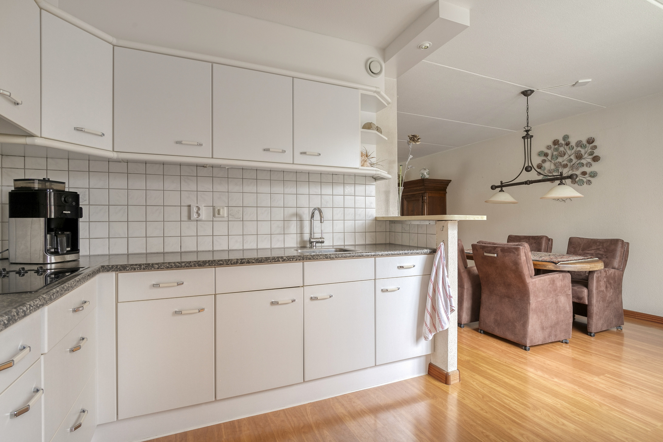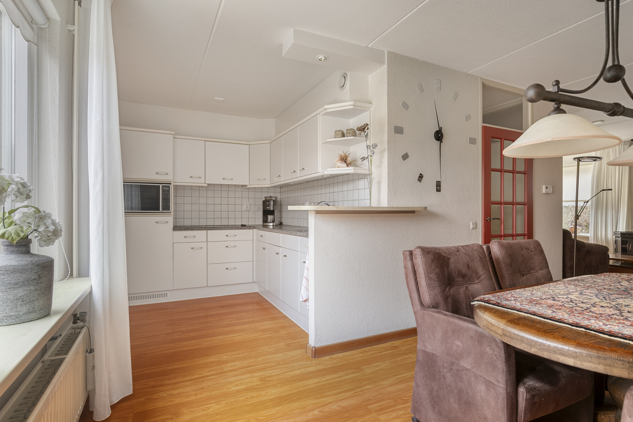 De zithoek is aan de straatzijde gelegen en dankzij de grote ramen gecombineerd met het hoge raam profiteer je hier zowel van privacy als van zicht over de straat. De houtkachel is centraal in de zithoek gesitueerd en zorgt voor extra sfeer. De eethoek biedt een prettig zicht op de tuin en staat in open verbinding met de keuken. De keuken is weliswaar gedateerd, maar verkeert in een zeer nette staat en biedt veel kastruimte. De aanwezige apparatuur betreft een koelkast, een magnetron, een 4-pits keramische kookplaat en een afzuigkap. Vanuit de keuken is de praktische bijkeuken bereikbaar met de opstelplaats voor de wasmachine en droger. Via de bijkeuken loop je binnendoor naar de garage, die is voorzien van elektra en een kanteldeur met loopdeur naar de oprit. Zowel vanuit de bijkeuken als vanuit de garage heb je direct toegang tot de tuin.