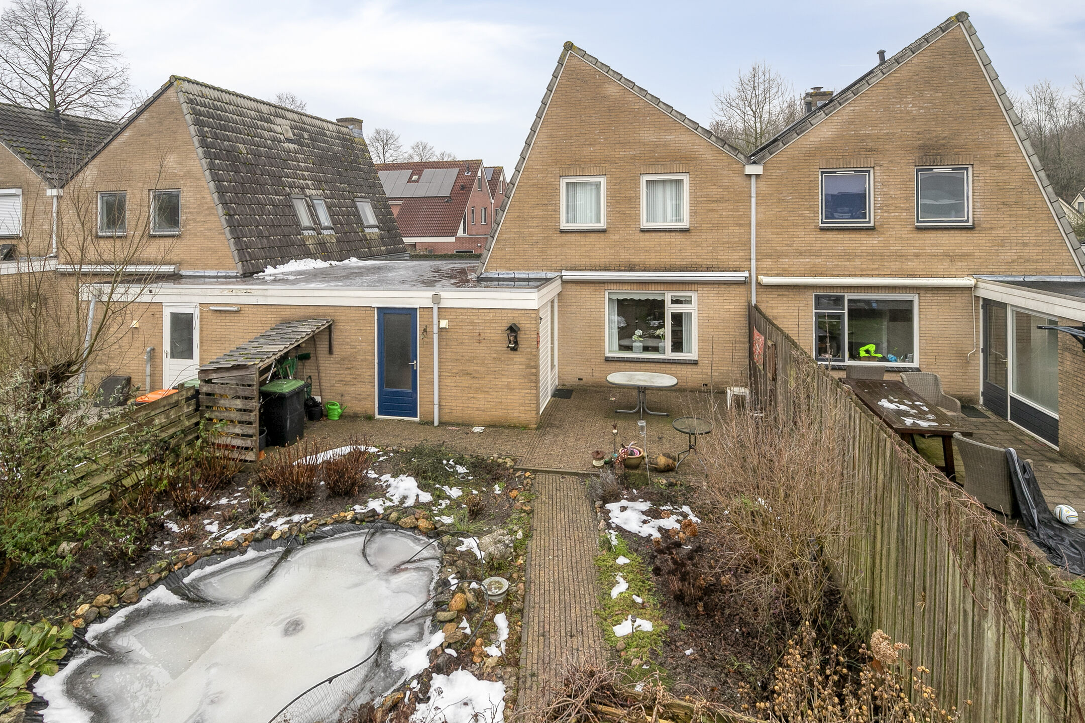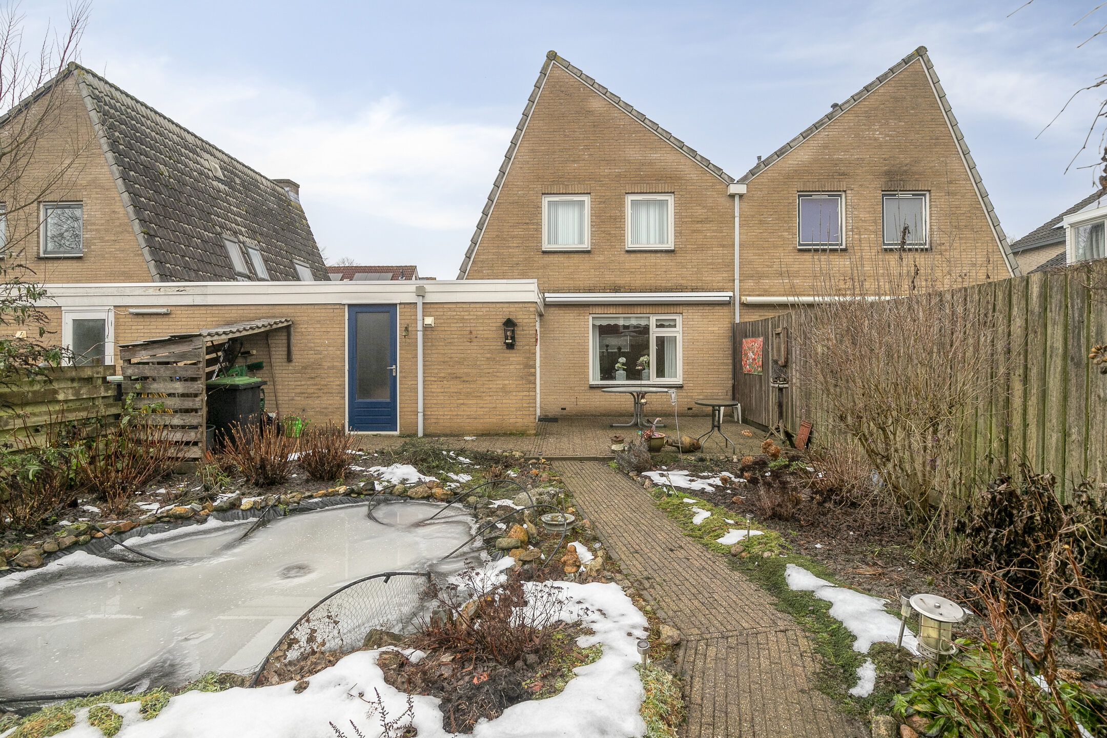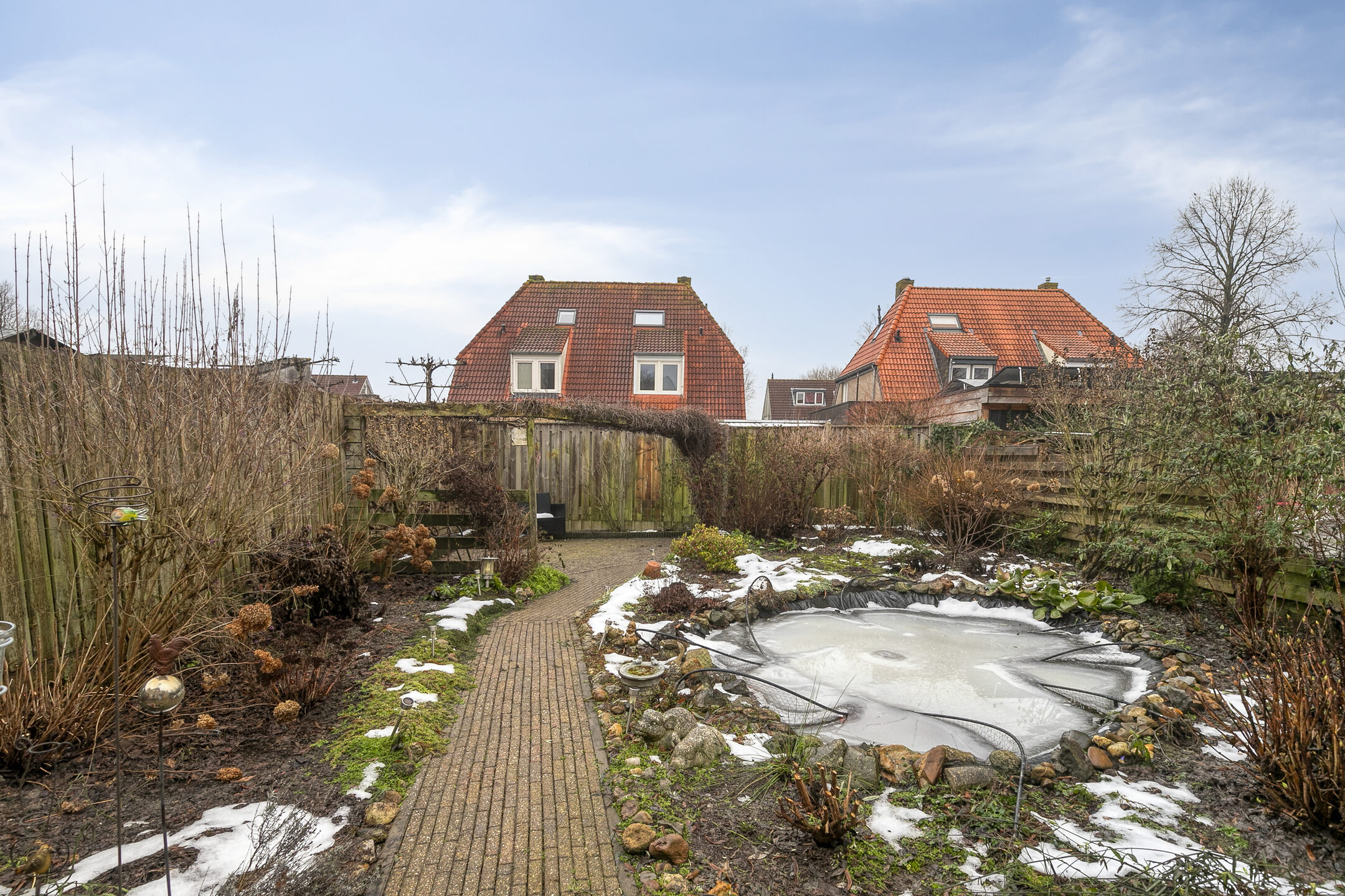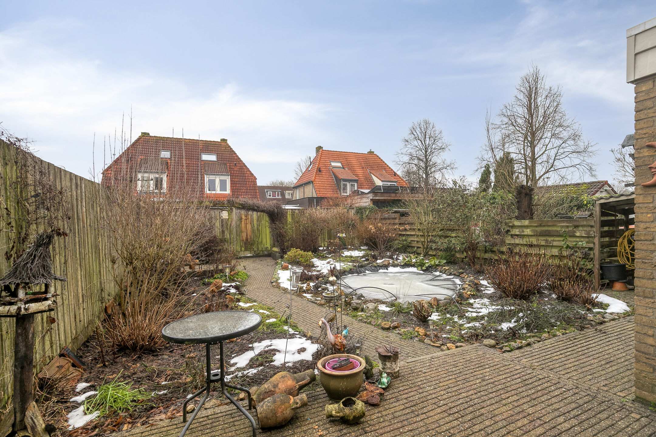 Dankzij de zuidoosten ligging geniet je in deze tuin al vroeg in de ochtend van de eerste zonnestralen op het terras bij de woning. Pas laat thuis na een lange dag werken? Dan pak je ook in de avond de zon nog mee op het terras achterin de tuin! De tuin is aangelegd met een vijver en veel vaste beplanting.