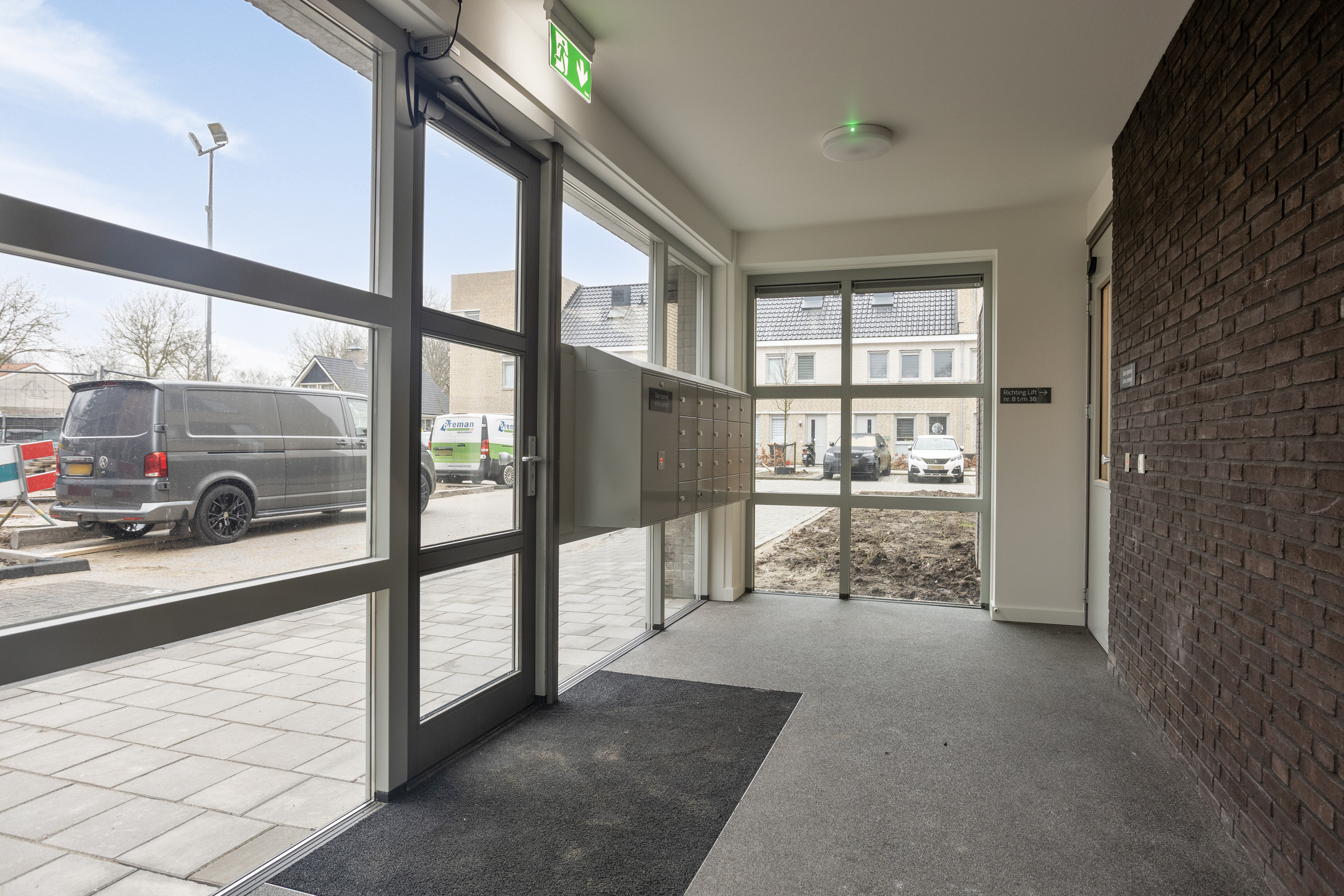 Aankomst bij het complex met het bellentableau en de brievenbussen. Binnenkomst...