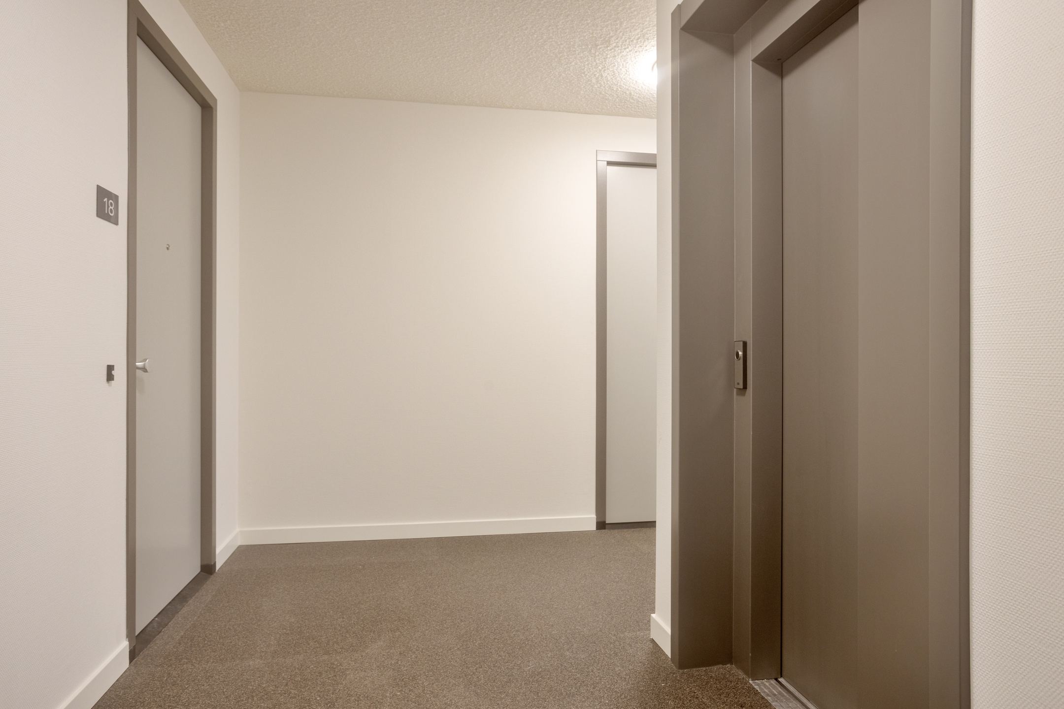 Aankomst bij het complex met het bellentableau en de brievenbussen. Binnenkomst in de gemeenschappelijke hal met de toegang tot de begane grond appartementen, de privébergingen, de trap naar de verschillende verdiepingen en de lift.