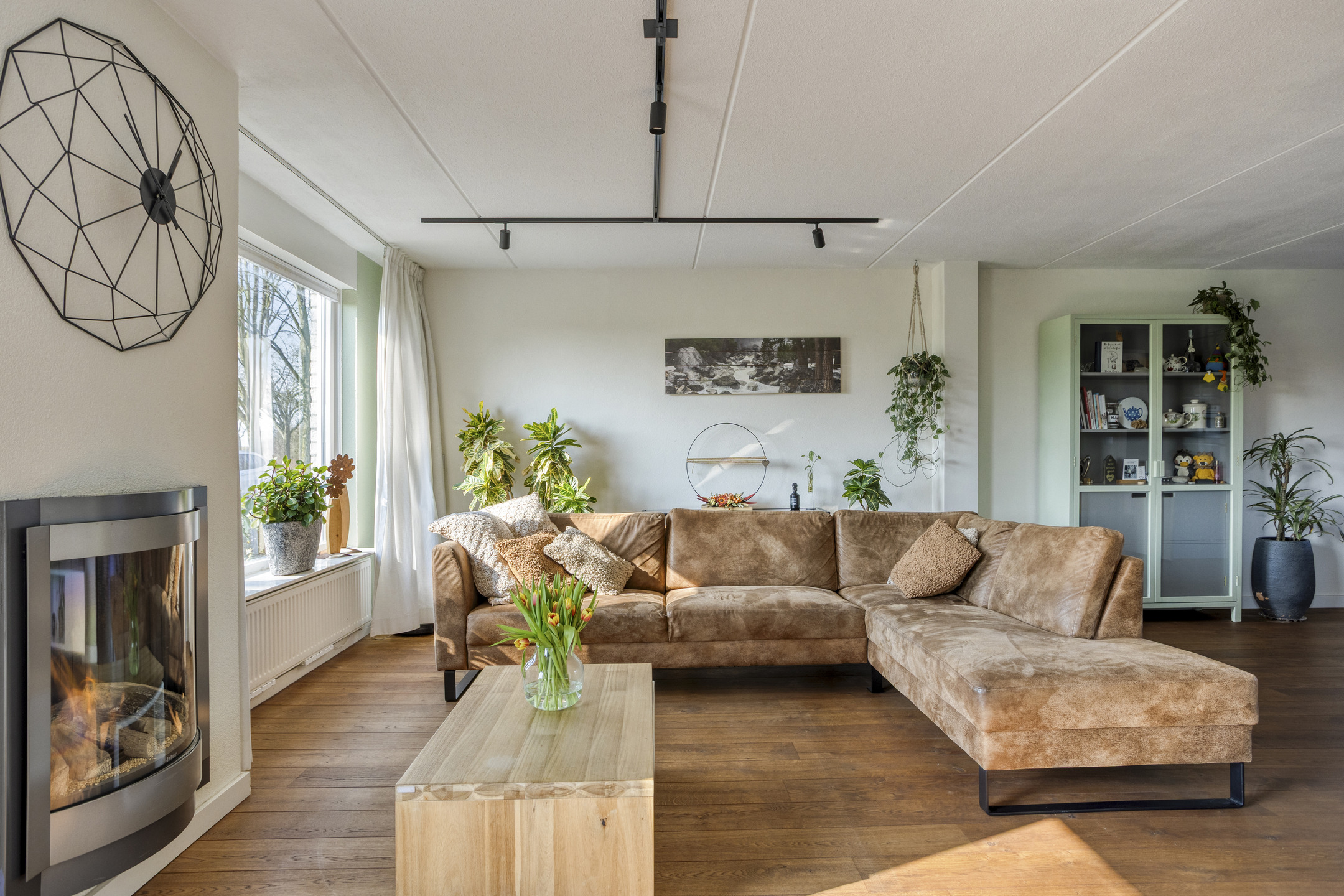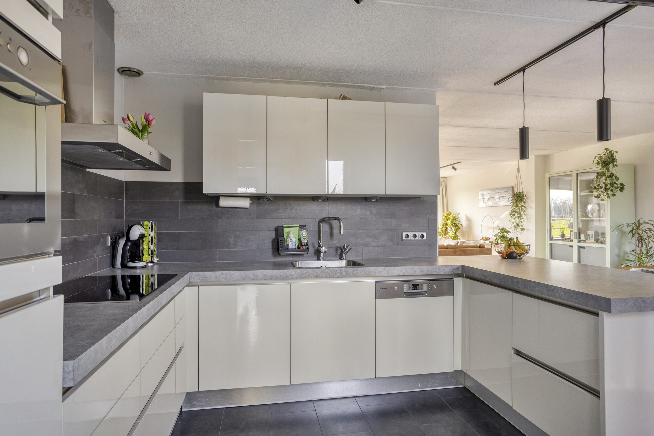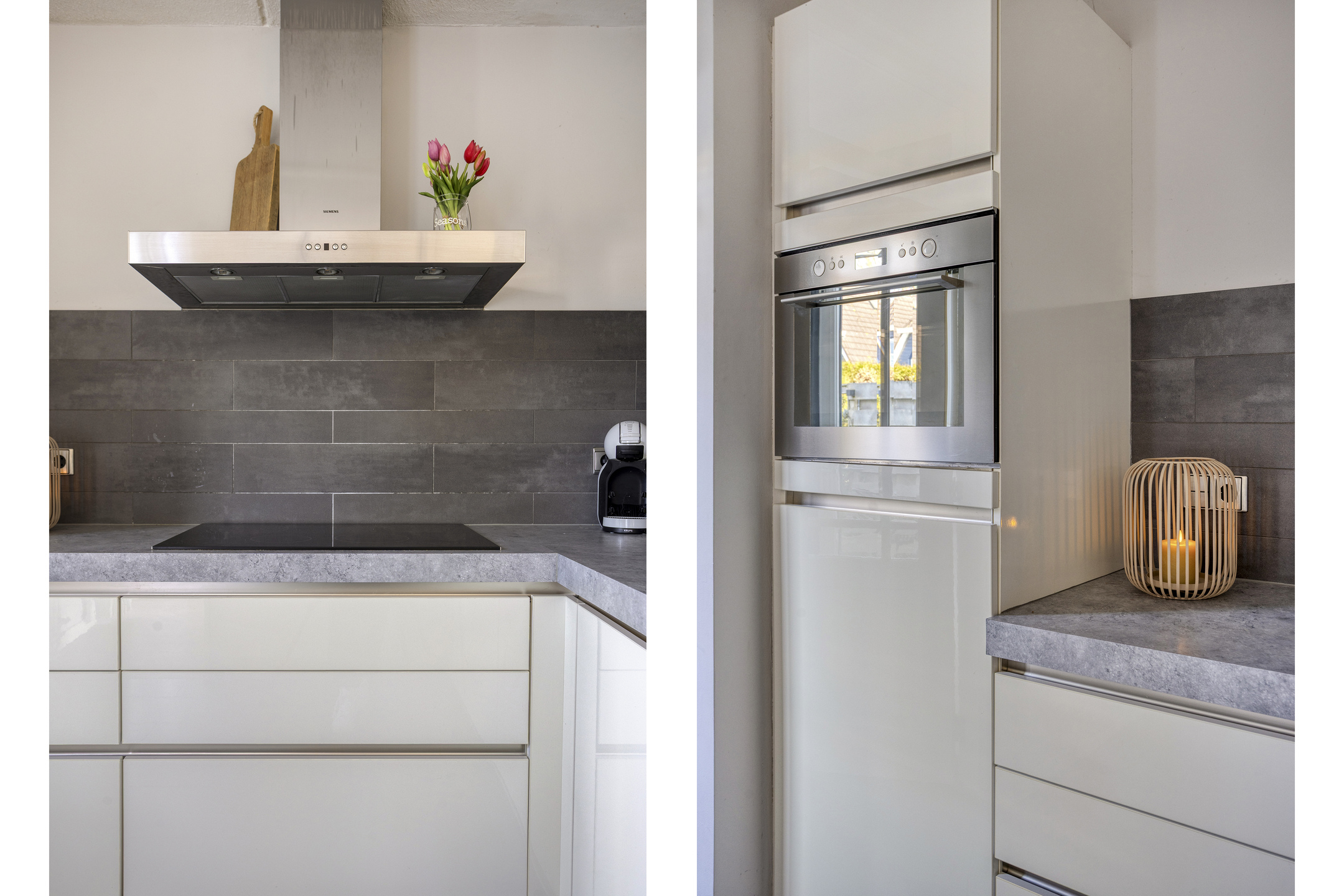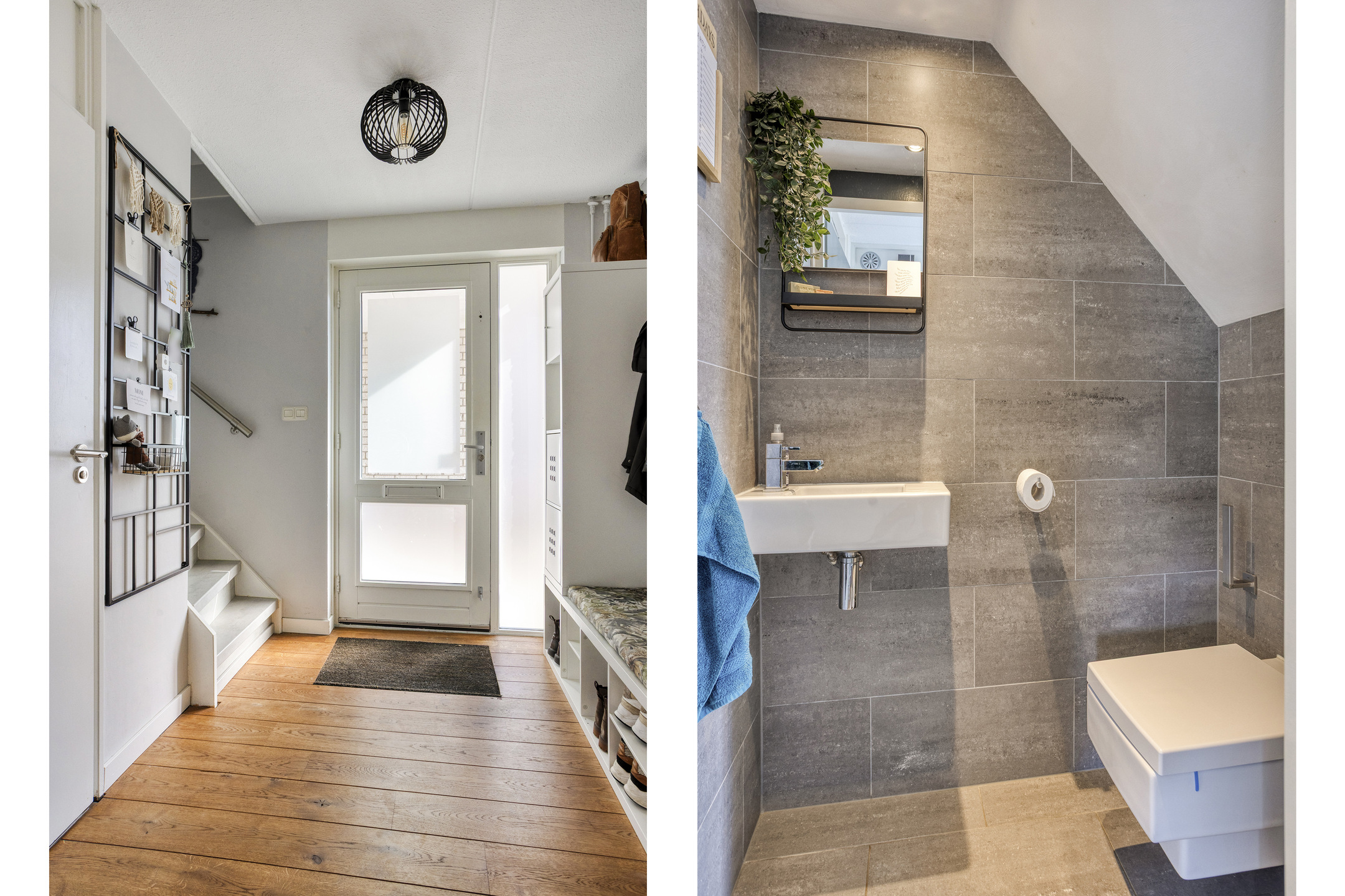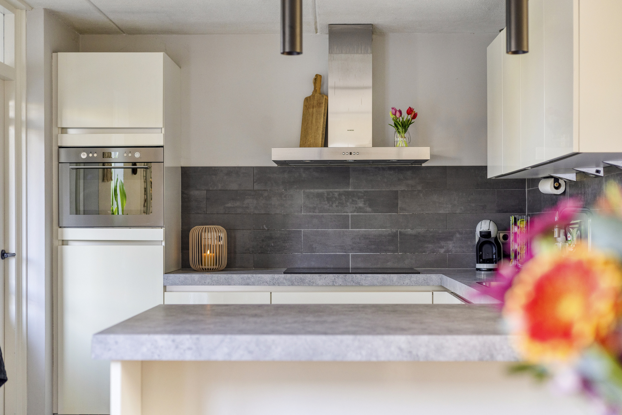 Parkeer je auto gemakkelijk op eigen terrein en stap via de overdekte entree de ruime hal binnen. Hier tref je de meterkast (3-fase aansluiting, voorbereid voor een laadpaal en warmtepomp), de trapopgang, toegang tot de woonkamer en de toiletruimte. De toiletruimte is volledig betegeld met antracietkleurige tegels, een zwevend toilet en een fonteintje. Je betreedt de ruime woonkamer in het midden van de woning, met aan de straatzijde de zithoek. Wat direct opvalt is het vrije uitzicht: dankzij de grote ramen en de ligging aan openbaar groen zit je hier heerlijk rustig en vrij! De houten vloer in combinatie met de gashaard zorgt voor een warme en sfeervolle uitstraling. Aan de tuinzijde bevindt zich de eethoek, waar met gemak een riante eettafel geplaatst kan worden. Dankzij de openslaande deuren sta je hier in directe verbinding met de tuin. Aansluitend tref je de open keuken, opgesteld in een U-vorm, wat zorgt voor veel werkruimte. De bar maakt het geheel extra gezellig: zo kunnen vrienden en familie aansluiten bij het koken. De aanwezige inbouwapparatuur betreft een vaatwasser, een spoelbak met Quooker, een inductiekookplaat met afzuigschouw, een koelkast en een combimagnetron. Aansluitend tref je nog een fijne extra van deze woning: de bijkeuken! Dankzij de grote vaste kast is hier volop bergruimte aanwezig en je treft hier ook de aansluiting voor de wasmachine. Vanuit de bijkeuken heb je toegang tot zowel de tuin als de garage. De garage is uitgerust met openslaande deuren naar de oprit, elektra en water.