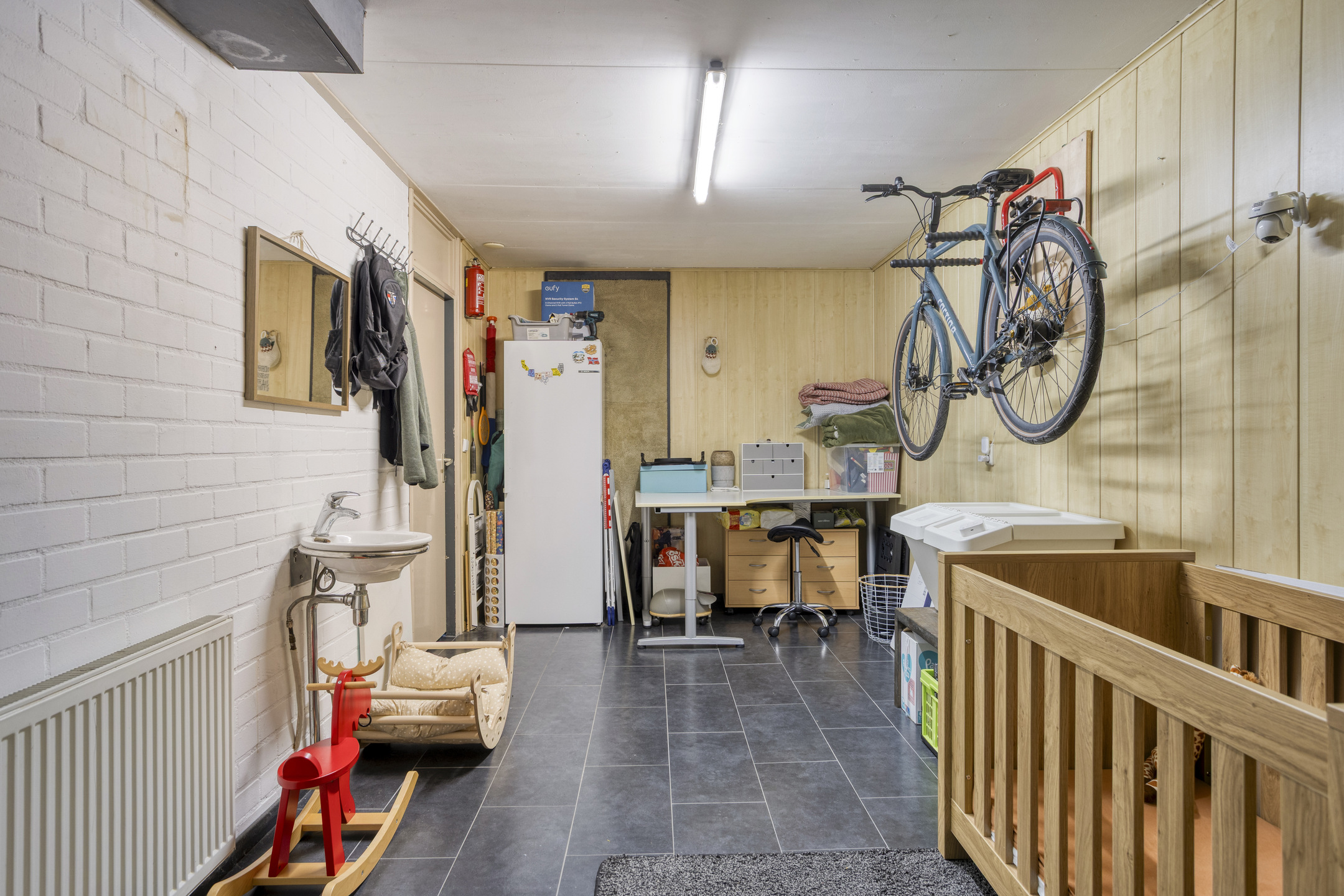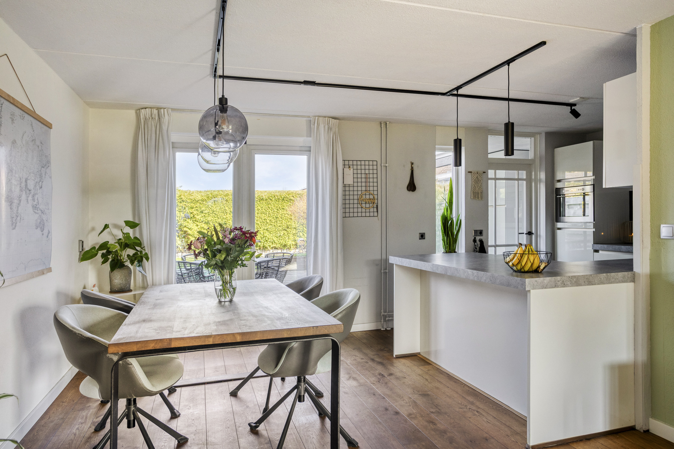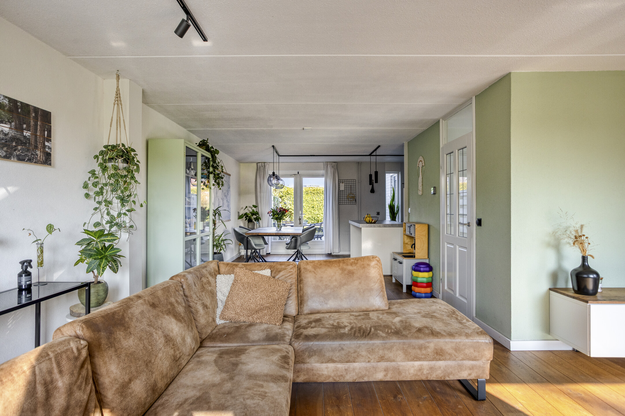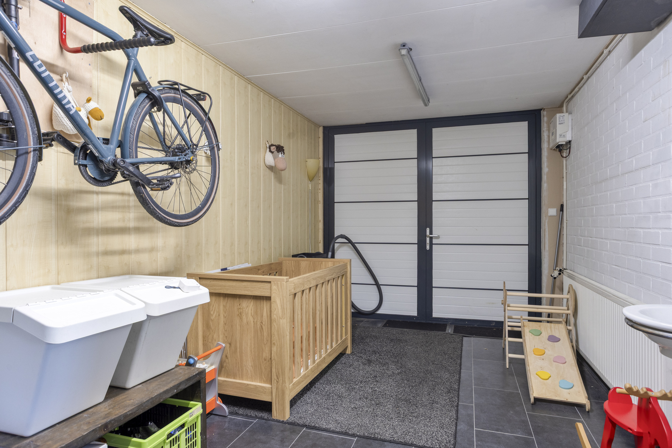Parkeer je auto gemakkelijk op eigen terrein en stap via de overdekte entree de ruime hal binnen. Hier tref je de meterkast (3-fase aansluiting, voorbereid voor een laadpaal en warmtepomp), de trapopgang, toegang tot de woonkamer en de toiletruimte. De toiletruimte is volledig betegeld met antracietkleurige tegels, een zwevend toilet en een fonteintje. Je betreedt de ruime woonkamer in het midden van de woning, met aan de straatzijde de zithoek. Wat direct opvalt is het vrije uitzicht: dankzij de grote ramen en de ligging aan openbaar groen zit je hier heerlijk rustig en vrij! De houten vloer in combinatie met de gashaard zorgt voor een warme en sfeervolle uitstraling. Aan de tuinzijde bevindt zich de eethoek, waar met gemak een riante eettafel geplaatst kan worden. Dankzij de openslaande deuren sta je hier in directe verbinding met de tuin. Aansluitend tref je de open keuken, opgesteld in een U-vorm, wat zorgt voor veel werkruimte. De bar maakt het geheel extra gezellig: zo kunnen vrienden en familie aansluiten bij het koken. De aanwezige inbouwapparatuur betreft een vaatwasser, een spoelbak met Quooker, een inductiekookplaat met afzuigschouw, een koelkast en een combimagnetron. Aansluitend tref je nog een fijne extra van deze woning: de bijkeuken! Dankzij de grote vaste kast is hier volop bergruimte aanwezig en je treft hier ook de aansluiting voor de wasmachine. Vanuit de bijkeuken heb je toegang tot zowel de tuin als de garage. De garage is uitgerust met openslaande deuren naar de oprit, elektra en water.