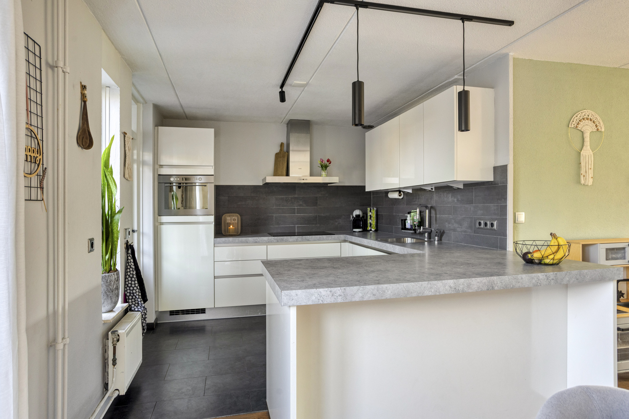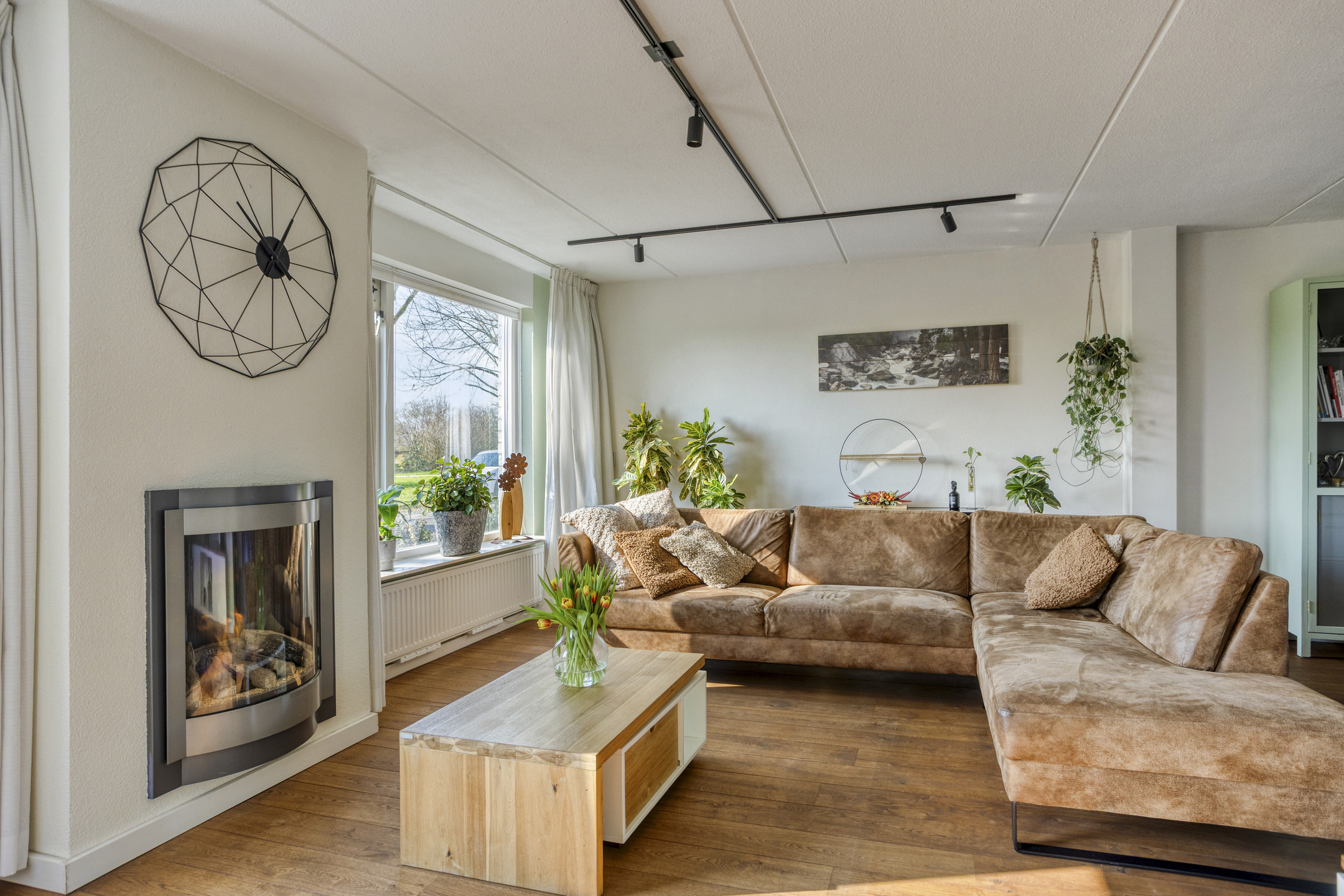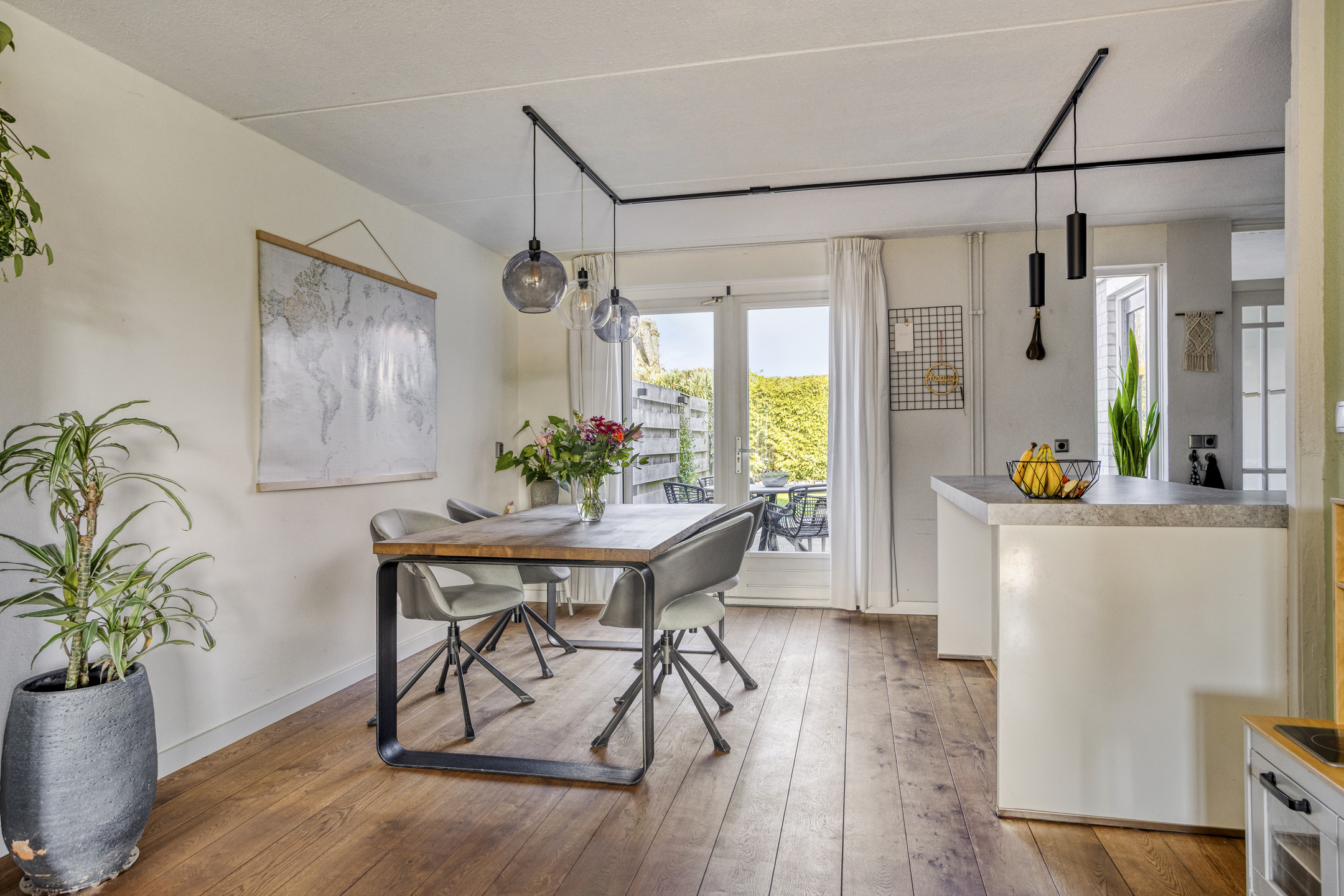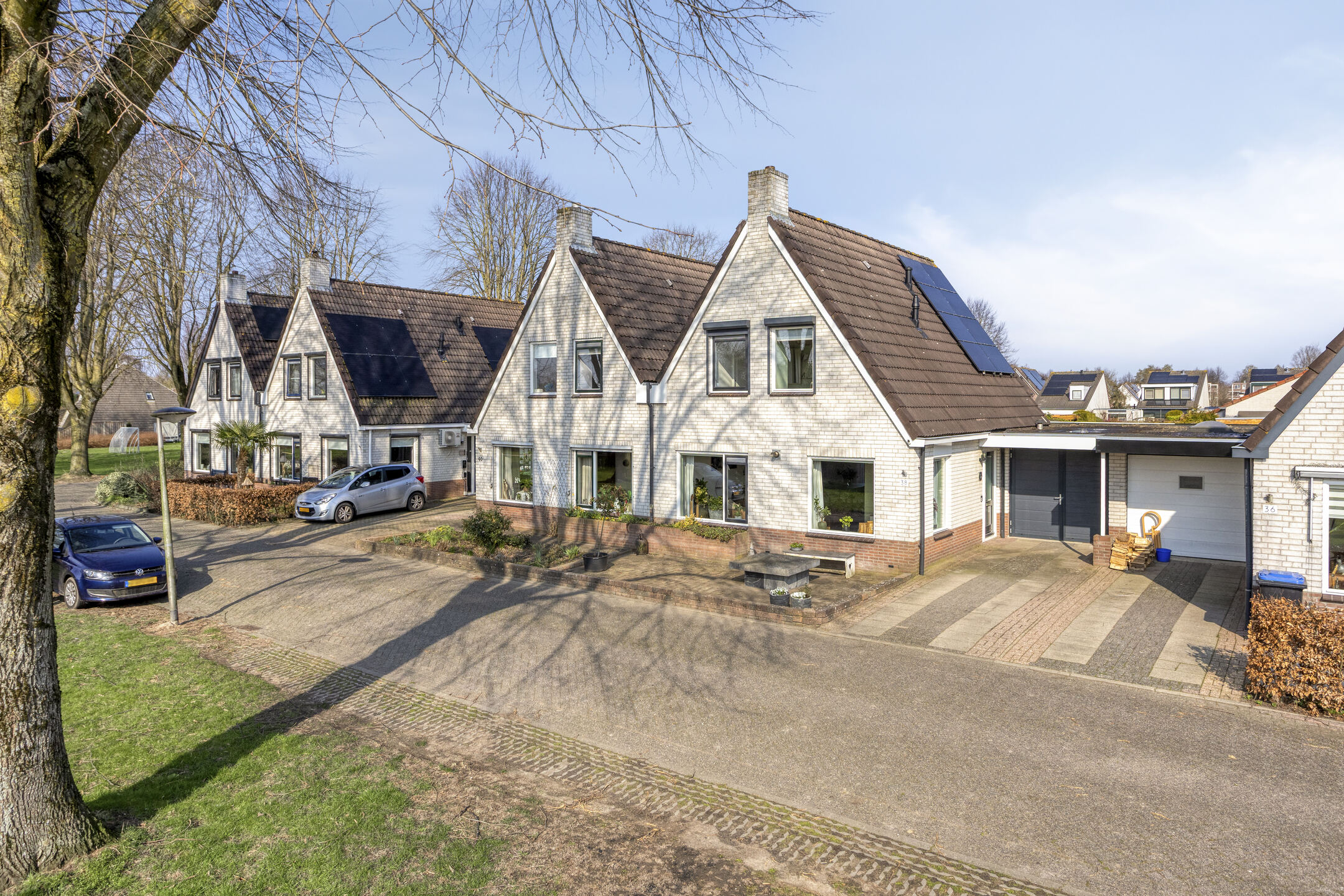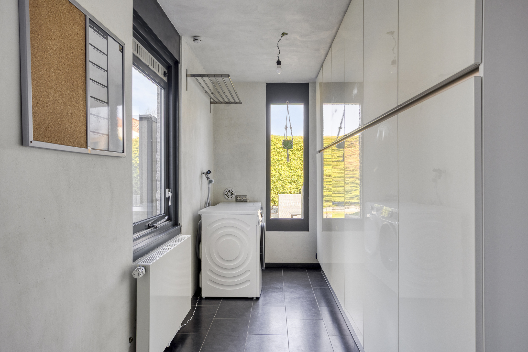 Parkeer je auto gemakkelijk op eigen terrein en stap via de overdekte entree de ruime hal binnen. Hier tref je de meterkast (3-fase aansluiting, voorbereid voor een laadpaal en warmtepomp), de trapopgang, toegang tot de woonkamer en de toiletruimte. De toiletruimte is volledig betegeld met antracietkleurige tegels, een zwevend toilet en een fonteintje. Je betreedt de ruime woonkamer in het midden van de woning, met aan de straatzijde de zithoek. Wat direct opvalt is het vrije uitzicht: dankzij de grote ramen en de ligging aan openbaar groen zit je hier heerlijk rustig en vrij! De houten vloer in combinatie met de gashaard zorgt voor een warme en sfeervolle uitstraling. Aan de tuinzijde bevindt zich de eethoek, waar met gemak een riante eettafel geplaatst kan worden. Dankzij de openslaande deuren sta je hier in directe verbinding met de tuin. Aansluitend tref je de open keuken, opgesteld in een U-vorm, wat zorgt voor veel werkruimte. De bar maakt het geheel extra gezellig: zo kunnen vrienden en familie aansluiten bij het koken. De aanwezige inbouwapparatuur betreft een vaatwasser, een spoelbak met Quooker, een inductiekookplaat met afzuigschouw, een koelkast en een combimagnetron. Aansluitend tref je nog een fijne extra van deze woning: de bijkeuken! Dankzij de grote vaste kast is hier volop bergruimte aanwezig en je treft hier ook de aansluiting voor de wasmachine. Vanuit de bijkeuken heb je toegang tot zowel de tuin als de garage. De garage is uitgerust met openslaande deuren naar de oprit, elektra en water.