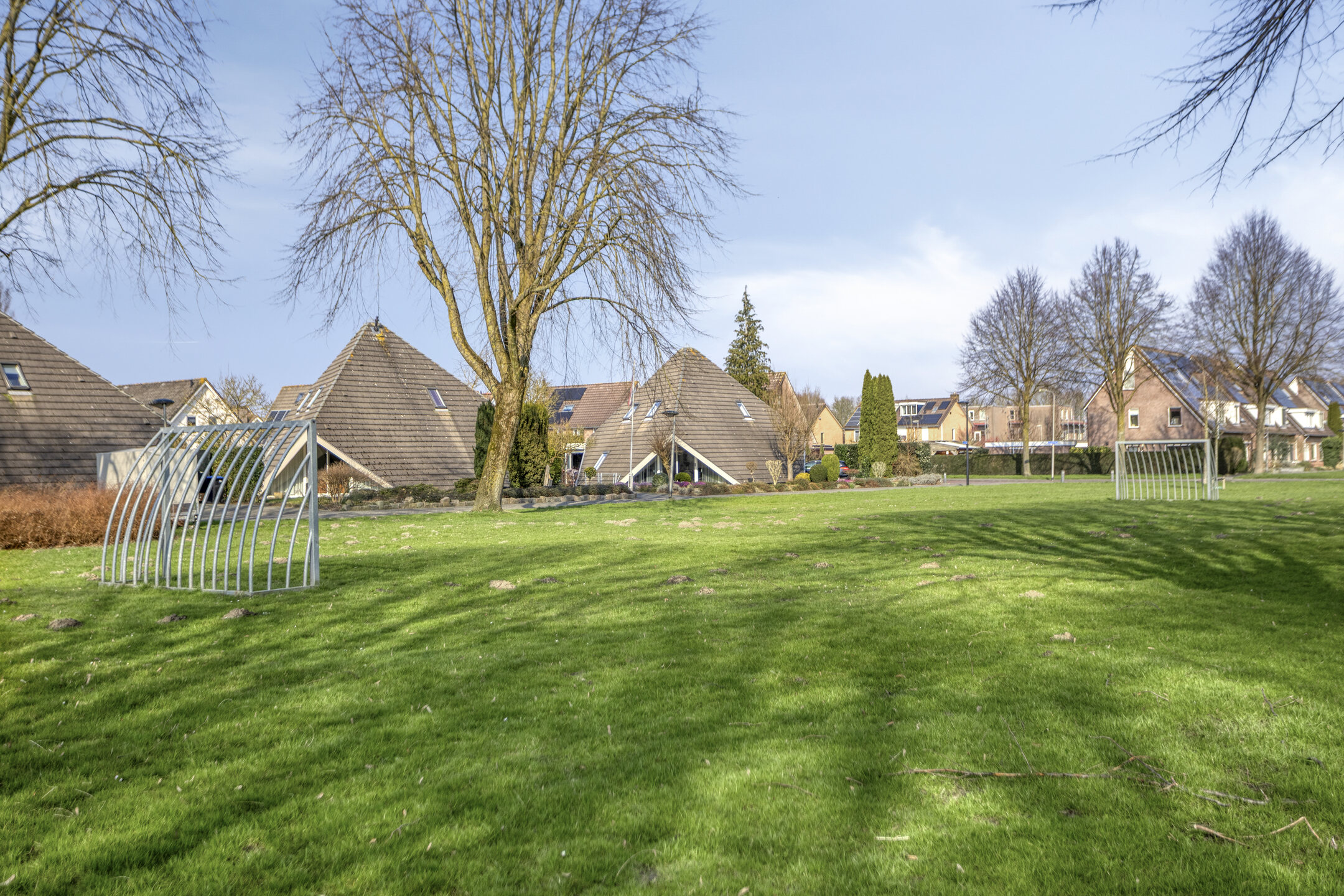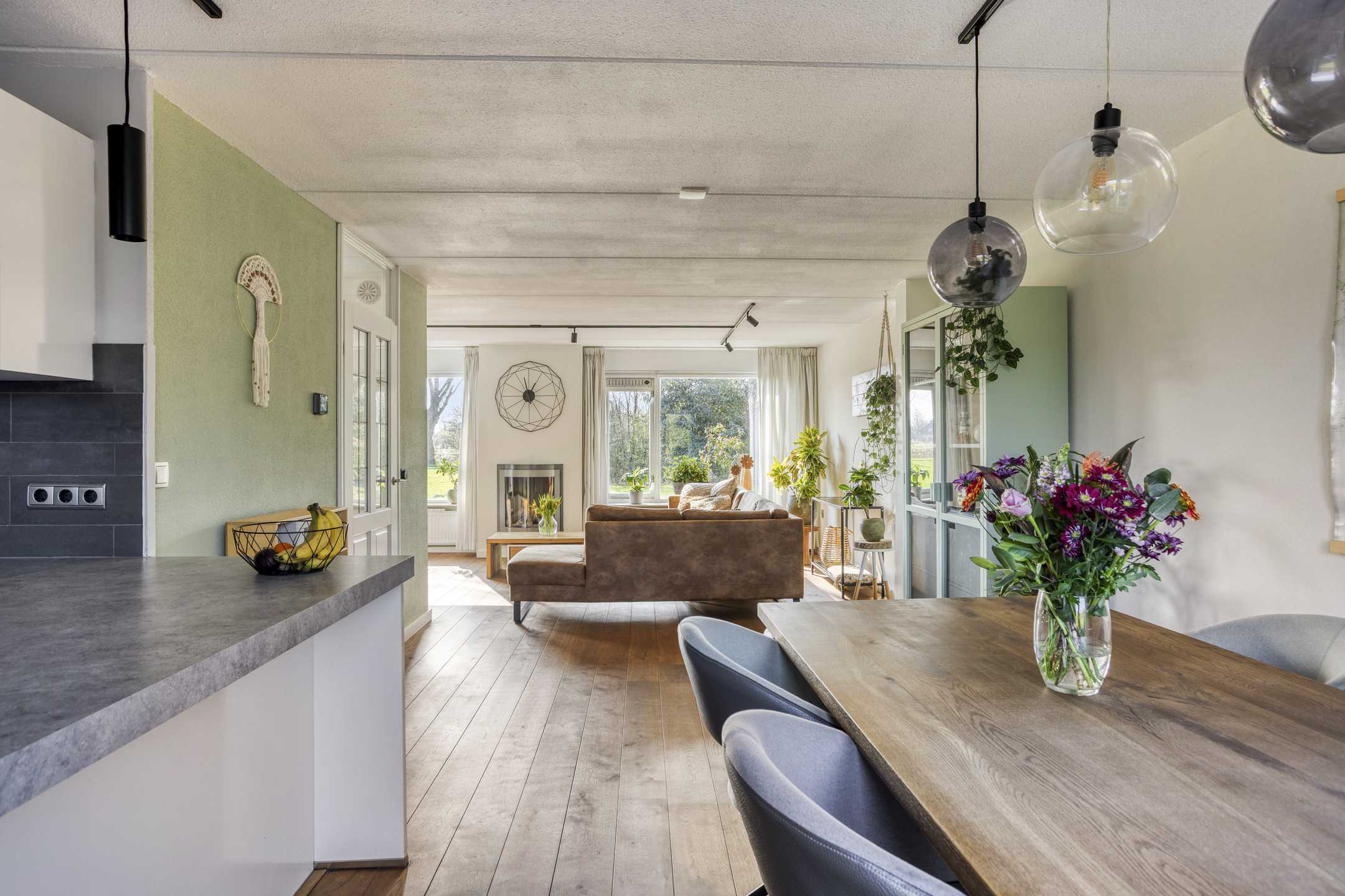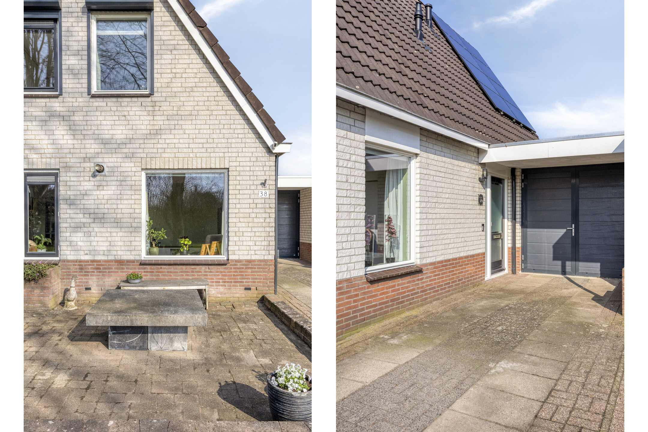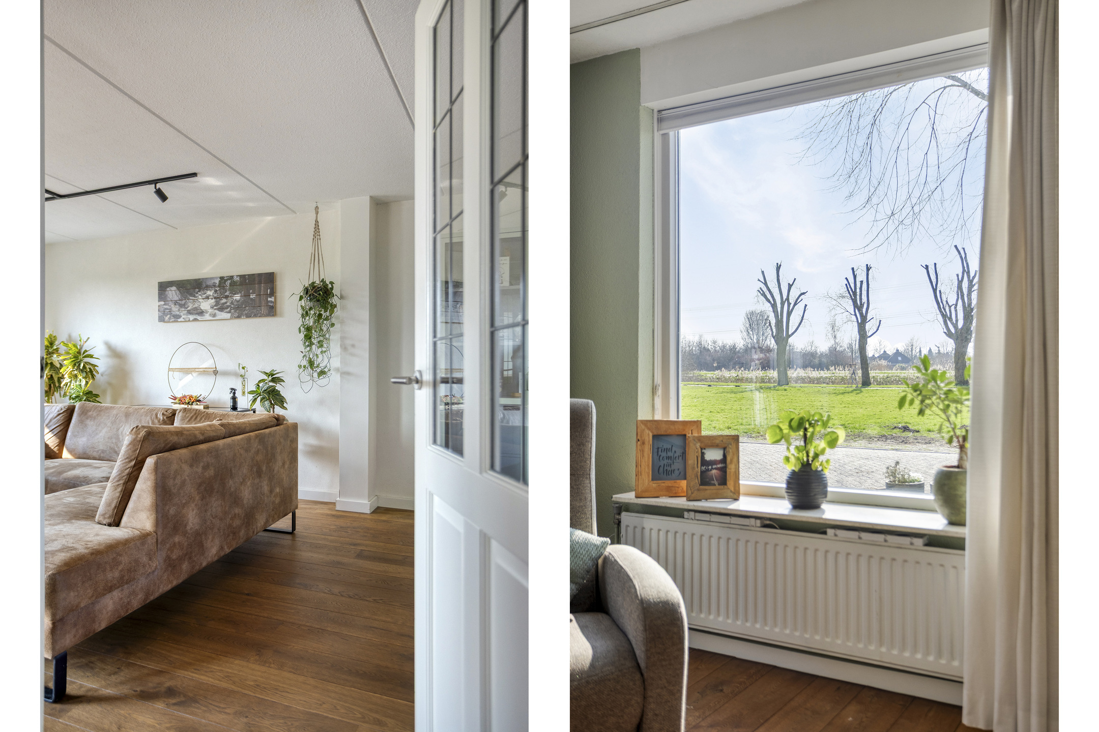 Parkeer je auto gemakkelijk op eigen terrein en stap via de overdekte entree de ruime hal binnen. Hier tref je de meterkast (3-fase aansluiting, voorbereid voor een laadpaal en warmtepomp), de trapopgang, toegang tot de woonkamer en de toiletruimte. De toiletruimte is volledig betegeld met antracietkleurige tegels, een zwevend toilet en een fonteintje. Je betreedt de ruime woonkamer in het midden van de woning, met aan de straatzijde de zithoek. Wat direct opvalt is het vrije uitzicht: dankzij de grote ramen en de ligging aan openbaar groen zit je hier heerlijk rustig en vrij! De houten vloer in combinatie met de gashaard zorgt voor een warme en sfeervolle uitstraling. Aan de tuinzijde bevindt zich de eethoek, waar met gemak een riante eettafel geplaatst kan worden. Dankzij de openslaande deuren sta je hier in directe verbinding met de tuin. Aansluitend tref je de open keuken, opgesteld in een U-vorm, wat zorgt voor veel werkruimte. De bar maakt het geheel extra gezellig: zo kunnen vrienden en familie aansluiten bij het koken. De aanwezige inbouwapparatuur betreft een vaatwasser, een spoelbak met Quooker, een inductiekookplaat met afzuigschouw, een koelkast en een combimagnetron. Aansluitend tref je nog een fijne extra van deze woning: de bijkeuken! Dankzij de grote vaste kast is hier volop bergruimte aanwezig en je treft hier ook de aansluiting voor de wasmachine. Vanuit de bijkeuken heb je toegang tot zowel de tuin als de garage. De garage is uitgerust met openslaande deuren naar de oprit, elektra en water.