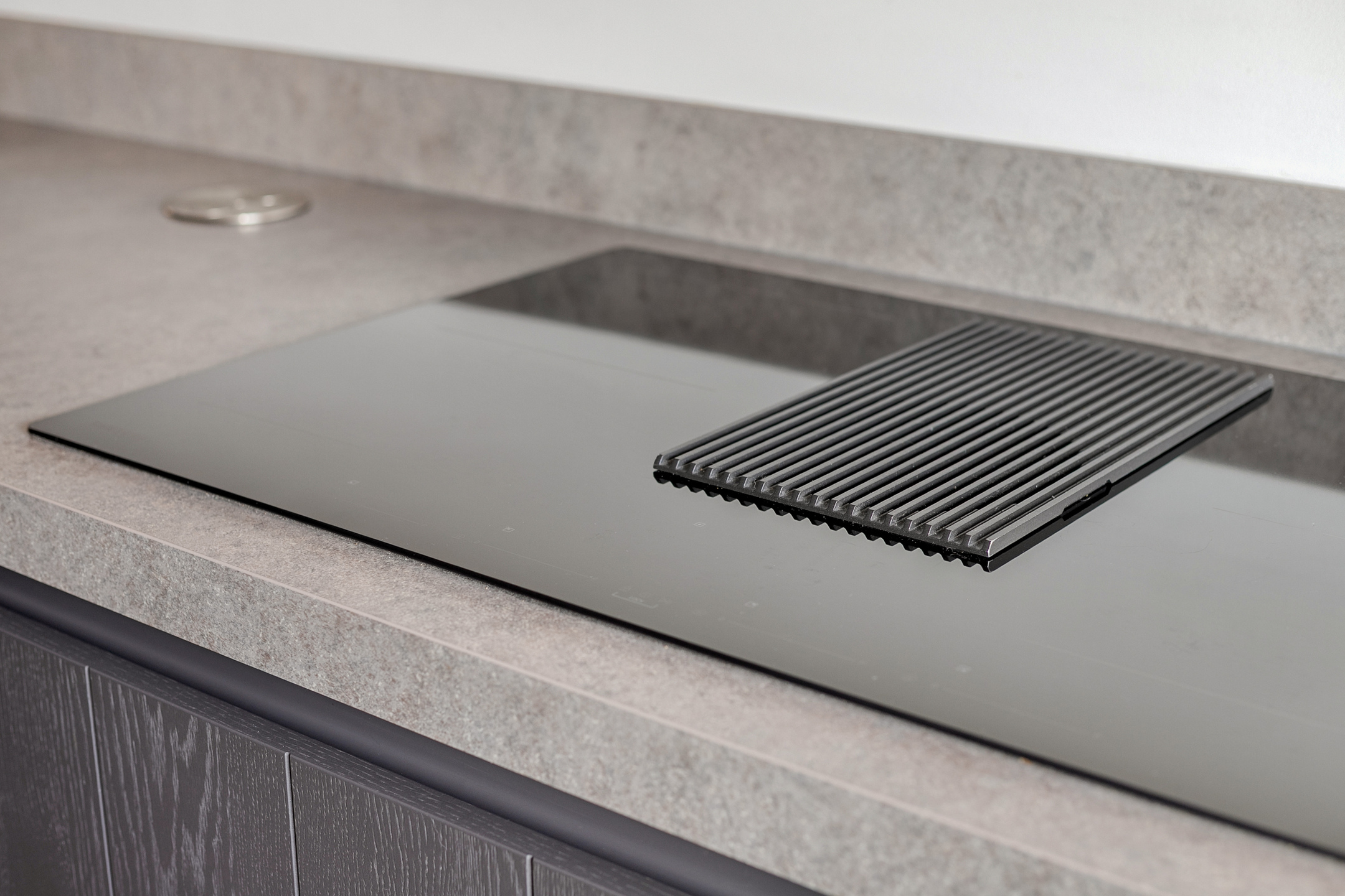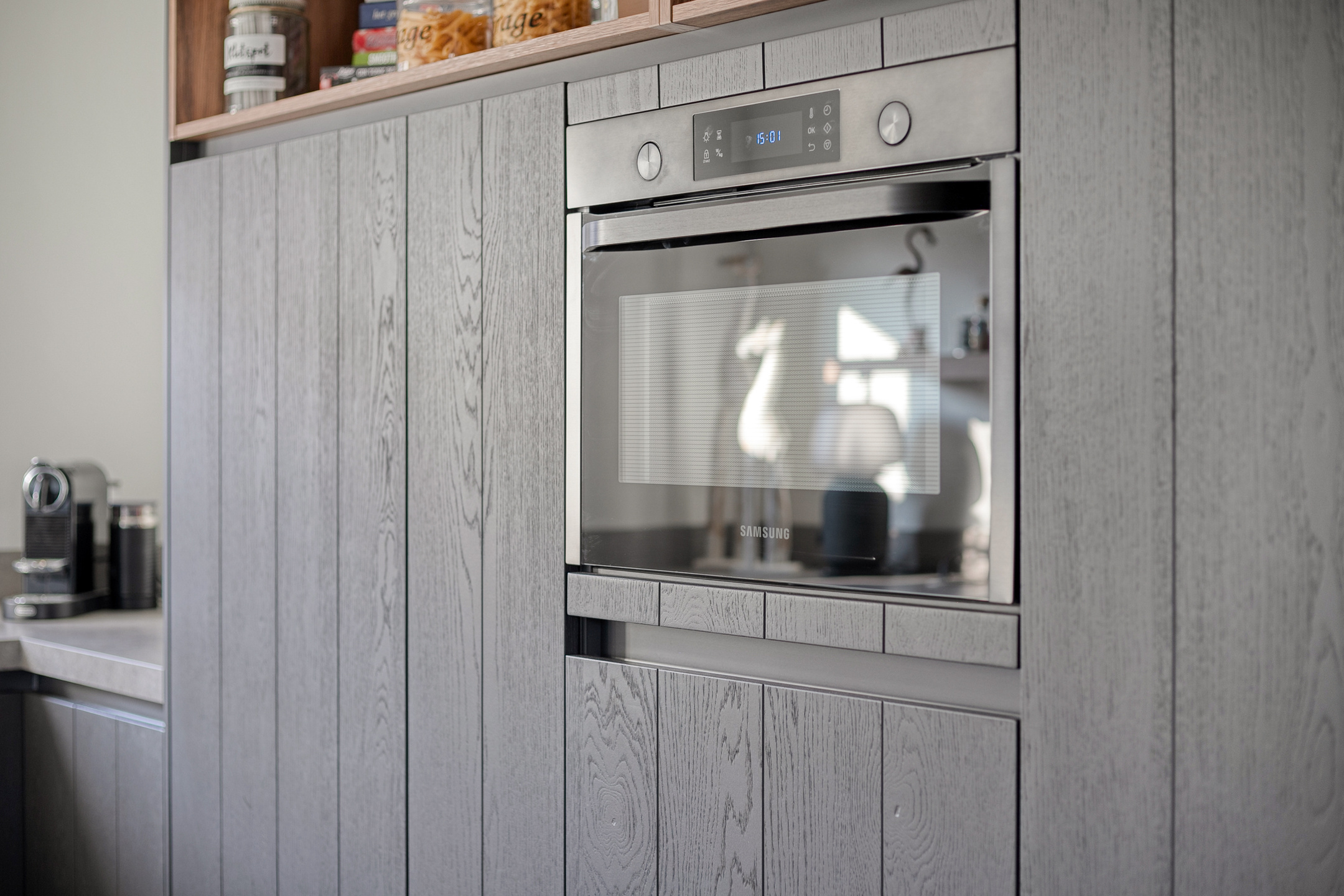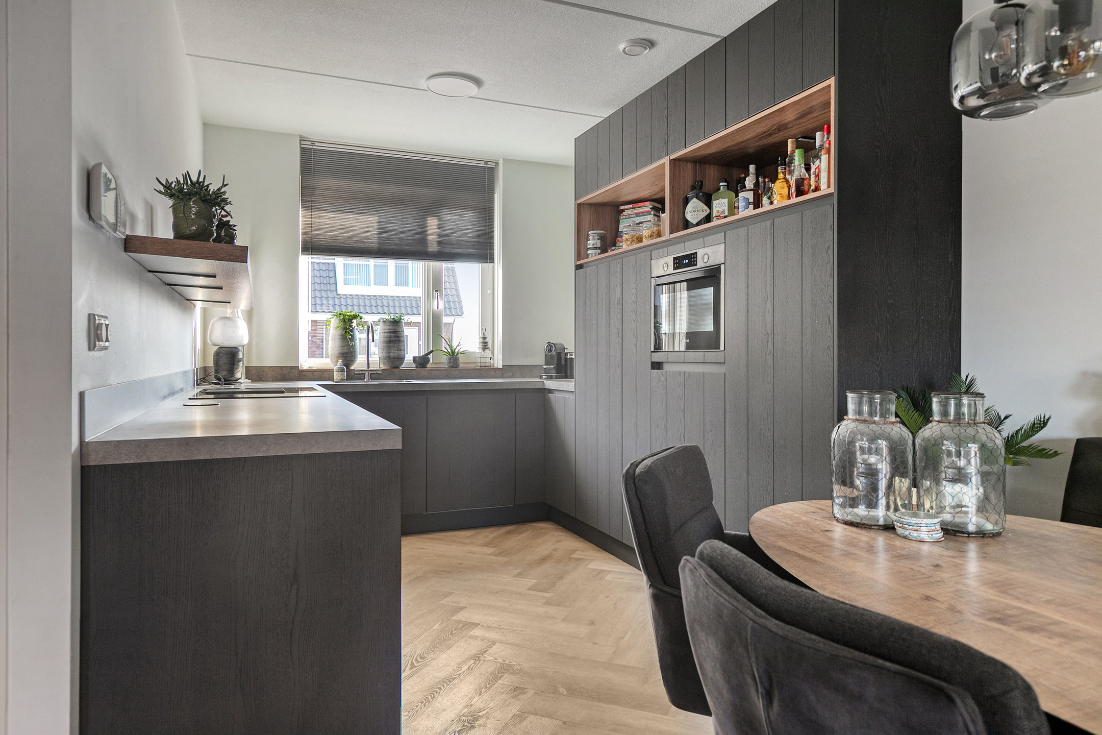 De keuken is uitgevoerd met zwarte fronten en een modern werkblad met bijpassende spatrand en is opgesteld in een praktische U-opstelling. Er is volop opbergruimte dankzij onder andere een hoge apothekerskast en een carrouselkast. De keuken is compleet uitgerust met een koelkast, een vriezer, een combi-oven, een vaatwasser, een spoelbak met kokendwaterkraan en een inductiekookplaat met geïntegreerde afzuiging. Extra bergruimte vind je in de trapkast.