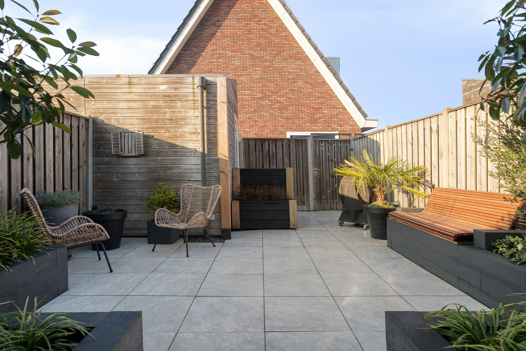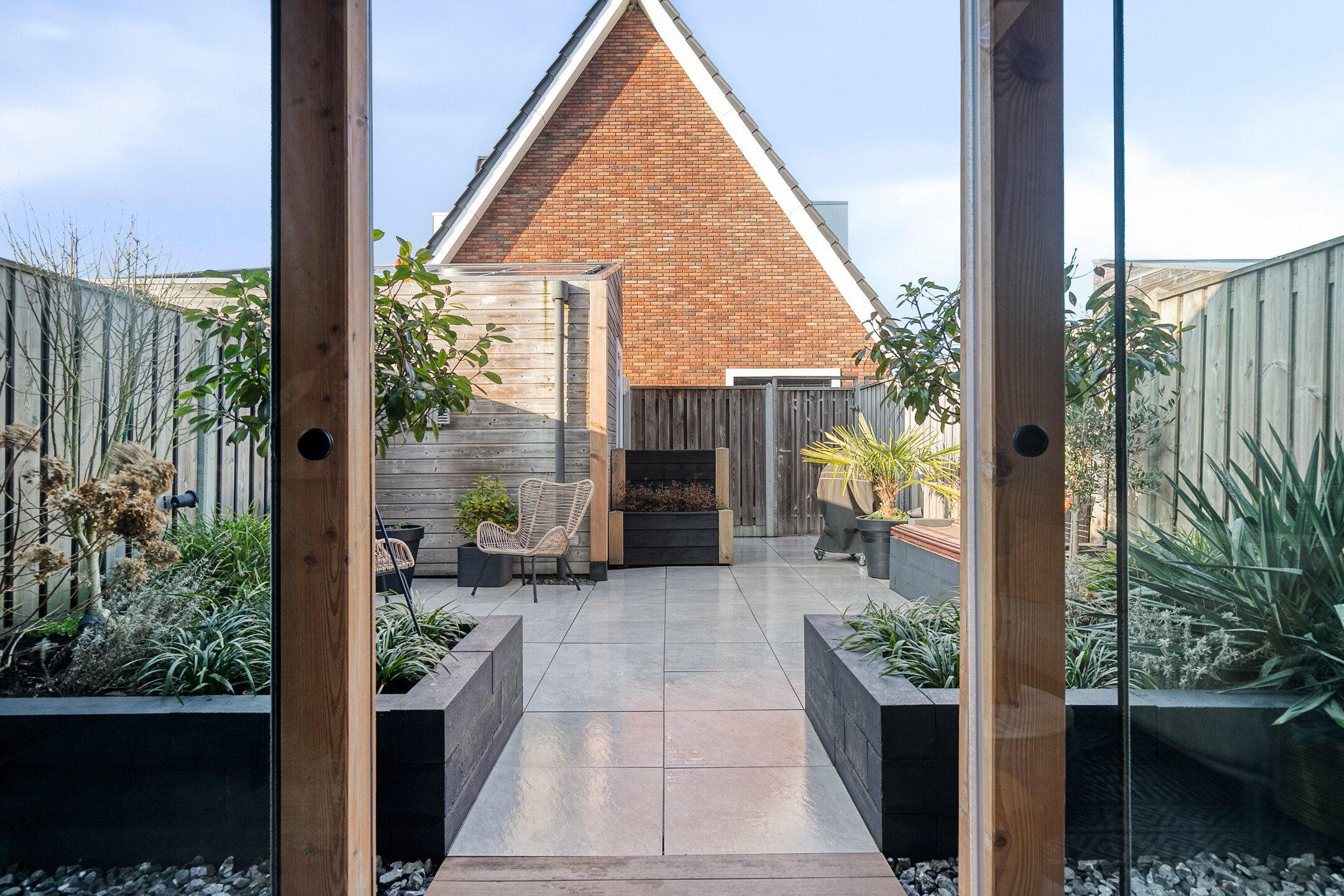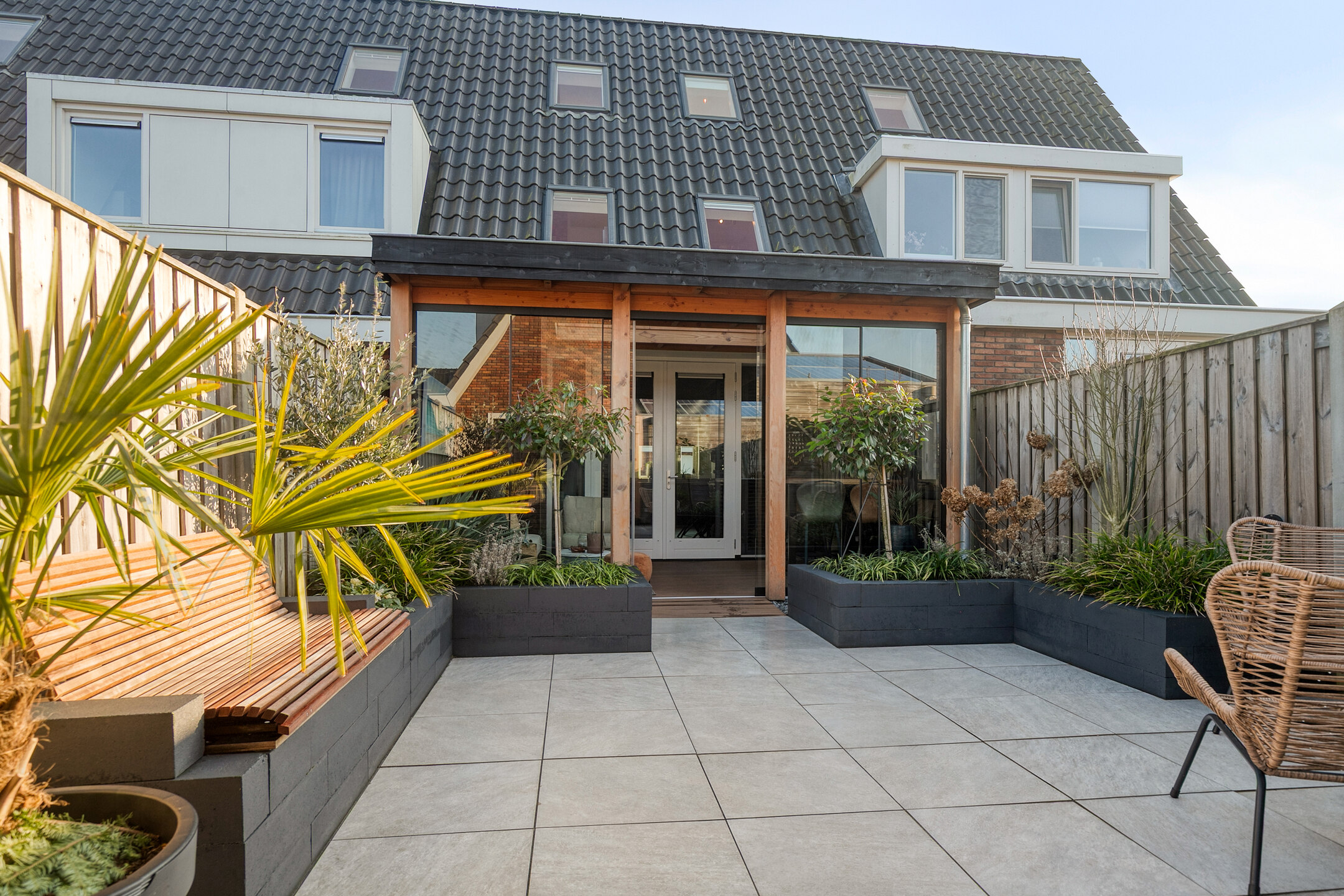 Via de openslaande deuren bereik je de tuin met riante overkapping, die aanvoelt als een 2e woonkamer. Dankzij de glazen wanden is deze ruimte eenvoudig af te sluiten, waardoor je hier tot in de late uurtjes comfortabel kunt zitten. De tuin is verzorgd aangelegd met vaste beplanting in verhoogde borders en lichte keramische tegels met voegwerk, wat onderhoudsvriendelijk is. Achter in de tuin bevindt zich de berging met de omvormer van de zonnepanelen en voldoende ruimte voor bijvoorbeeld fietsen. De tuin is tevens bereikbaar via een achterom.