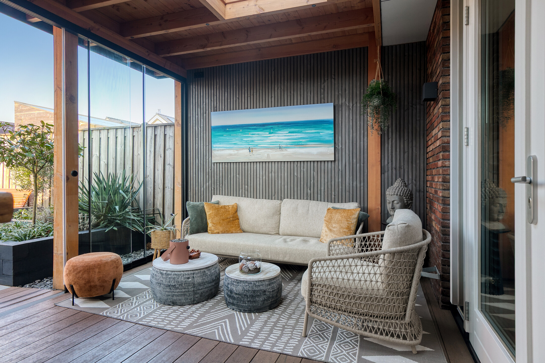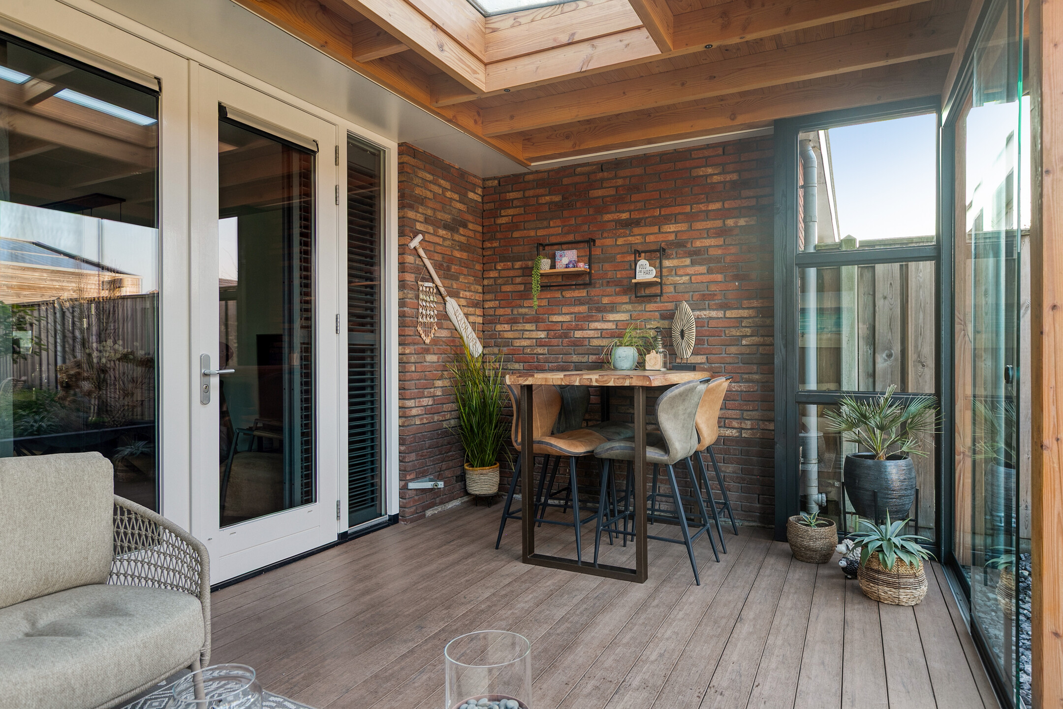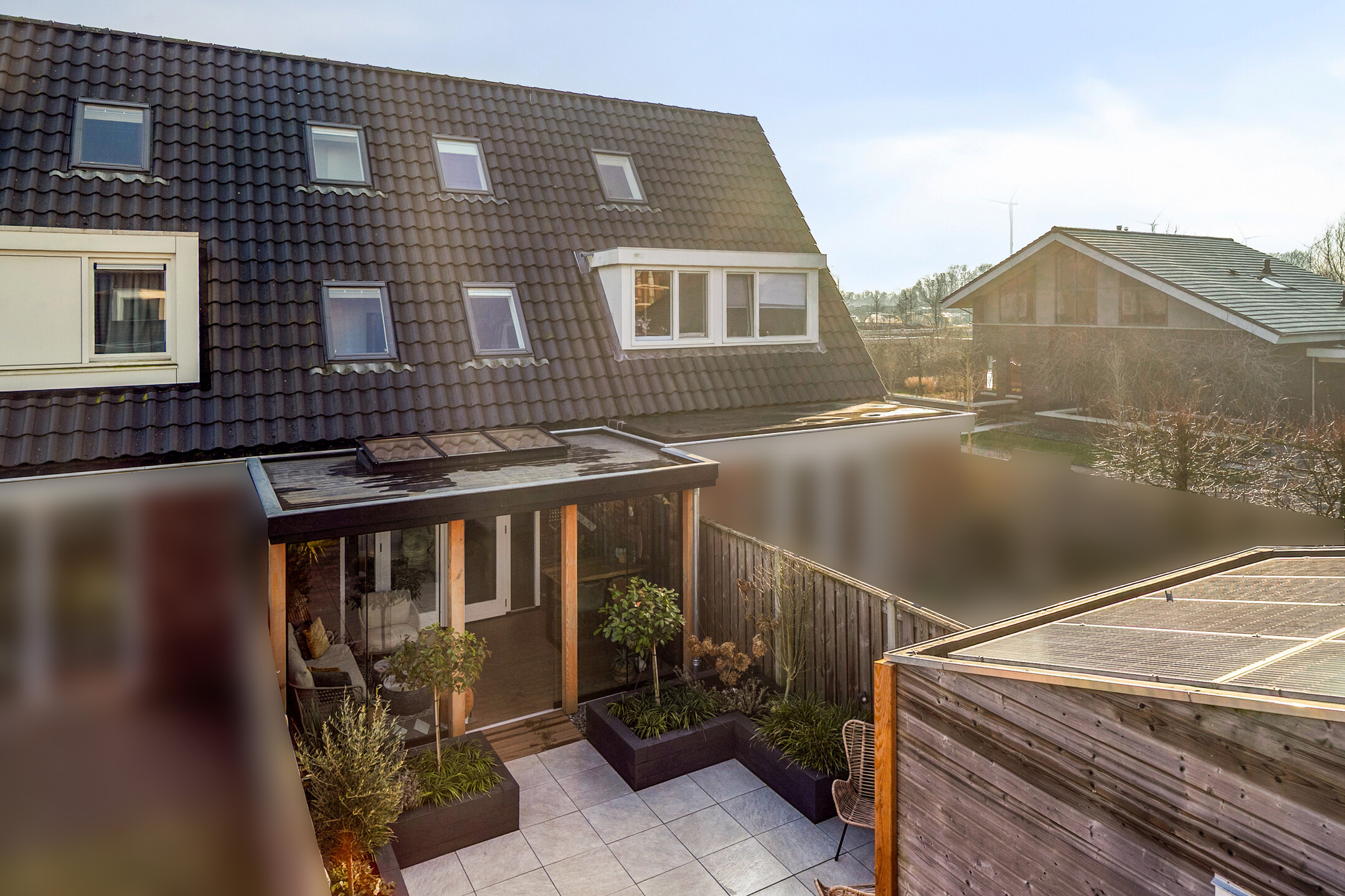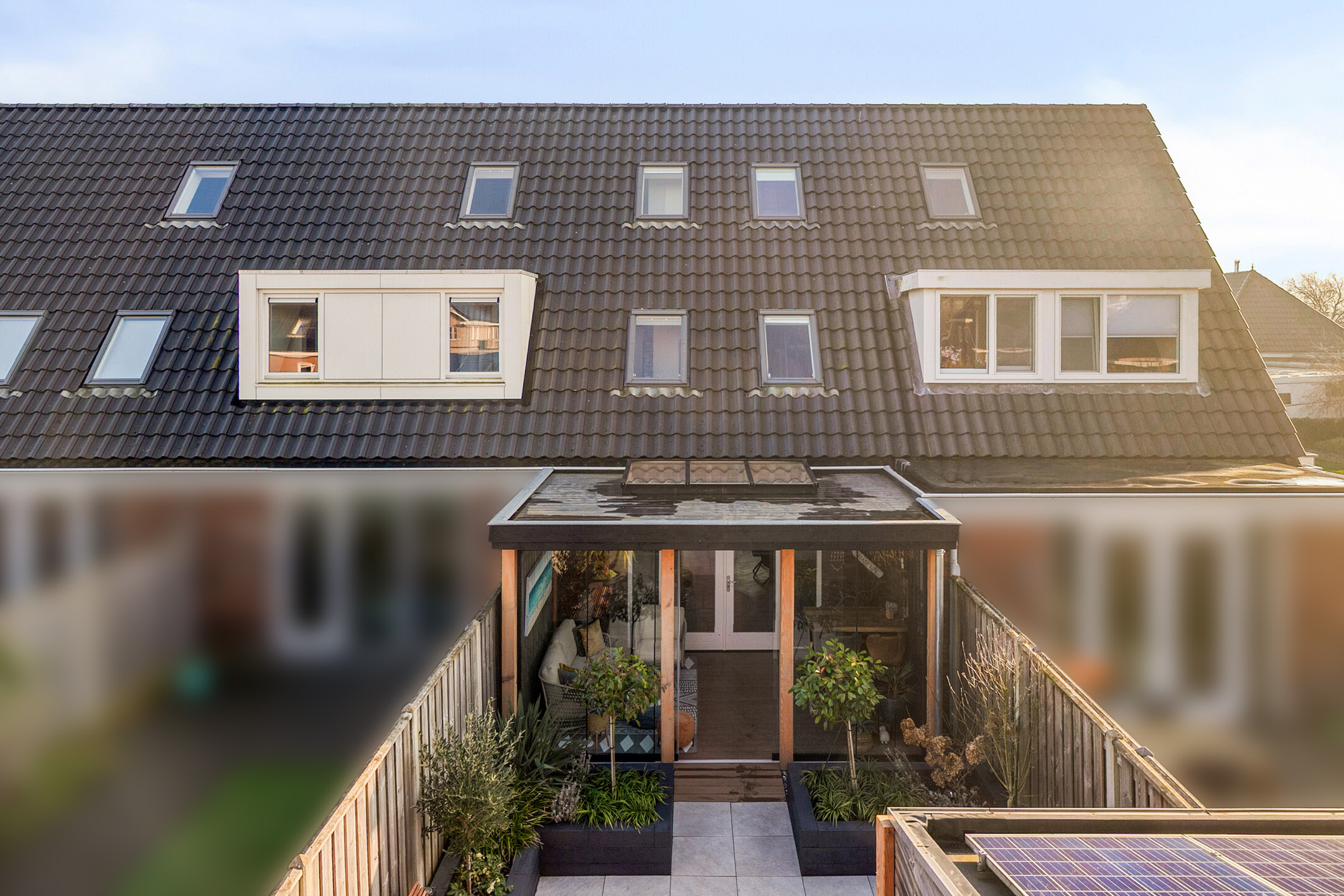 Via de openslaande deuren bereik je de tuin met riante overkapping, die aanvoelt als een 2e woonkamer. Dankzij de glazen wanden is deze ruimte eenvoudig af te sluiten, waardoor je hier tot in de late uurtjes comfortabel kunt zitten. De tuin is verzorgd aangelegd met vaste beplanting in verhoogde borders en lichte keramische tegels met voegwerk, wat onderhoudsvriendelijk is. Achter in de tuin bevindt zich de berging met de omvormer van de zonnepanelen en voldoende ruimte voor bijvoorbeeld fietsen. De tuin is tevens bereikbaar via een achterom.