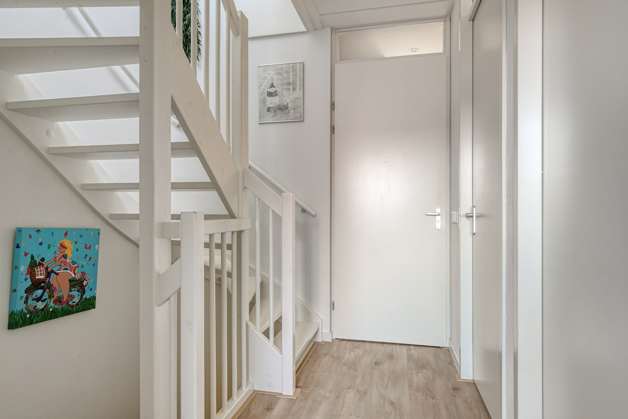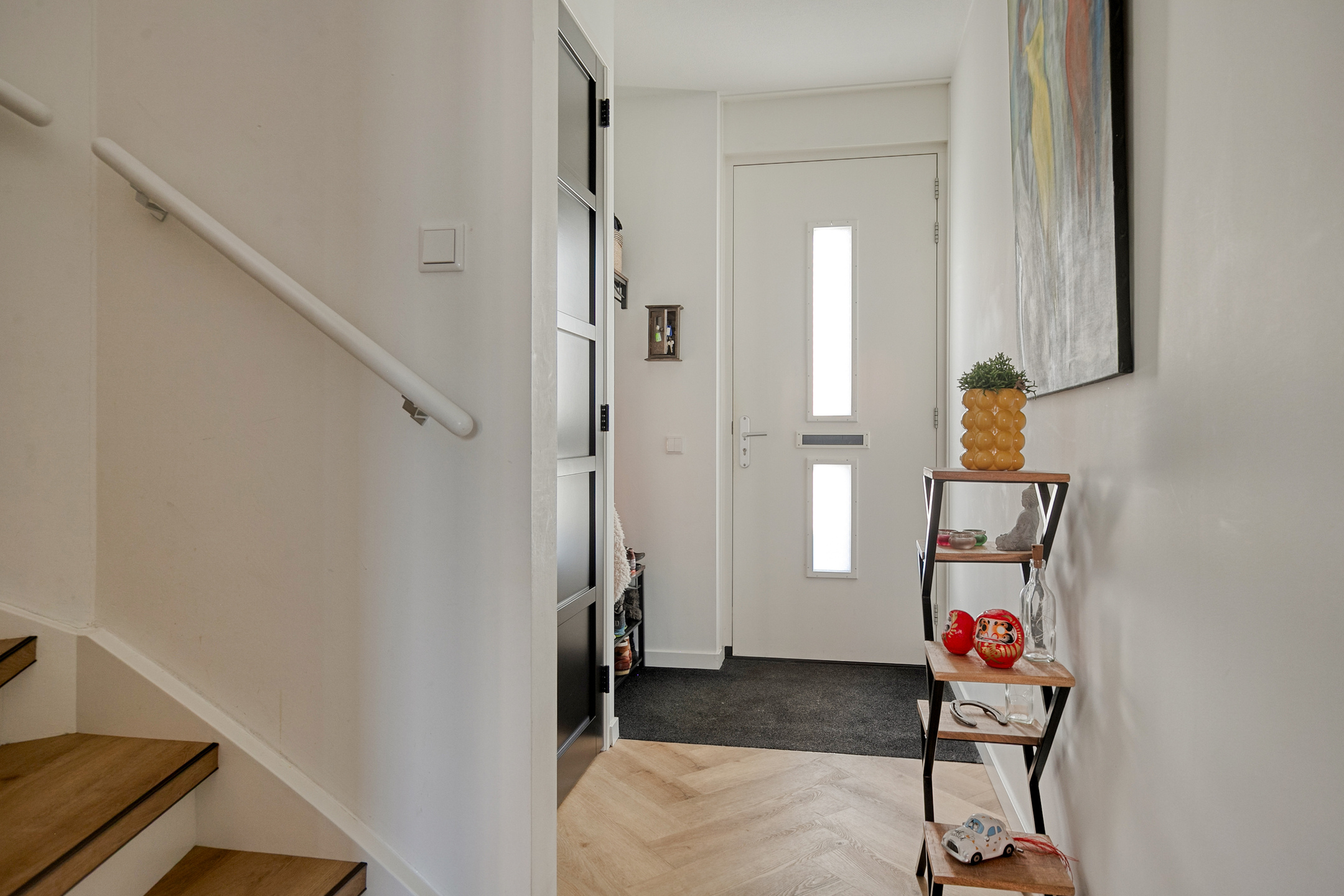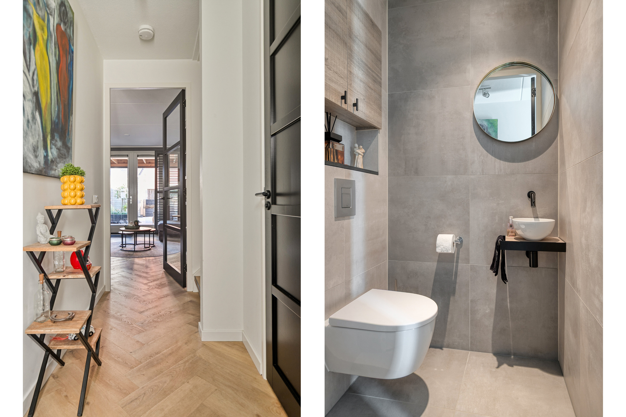 Bij binnenkomst ervaar je direct de luxe uitstraling dankzij de vernieuwde zwarte binnendeuren in combinatie met de visgraat pvc-vloer. In de hal bevinden zich de meterkast, de trapopgang, de toegang tot de woonkamer en de toiletruimte. De toiletruimte is modern uitgevoerd met grote grijze wand- en vloertegels, een zwevend toilet, een waskom met ingebouwde kraan en een spiegel.