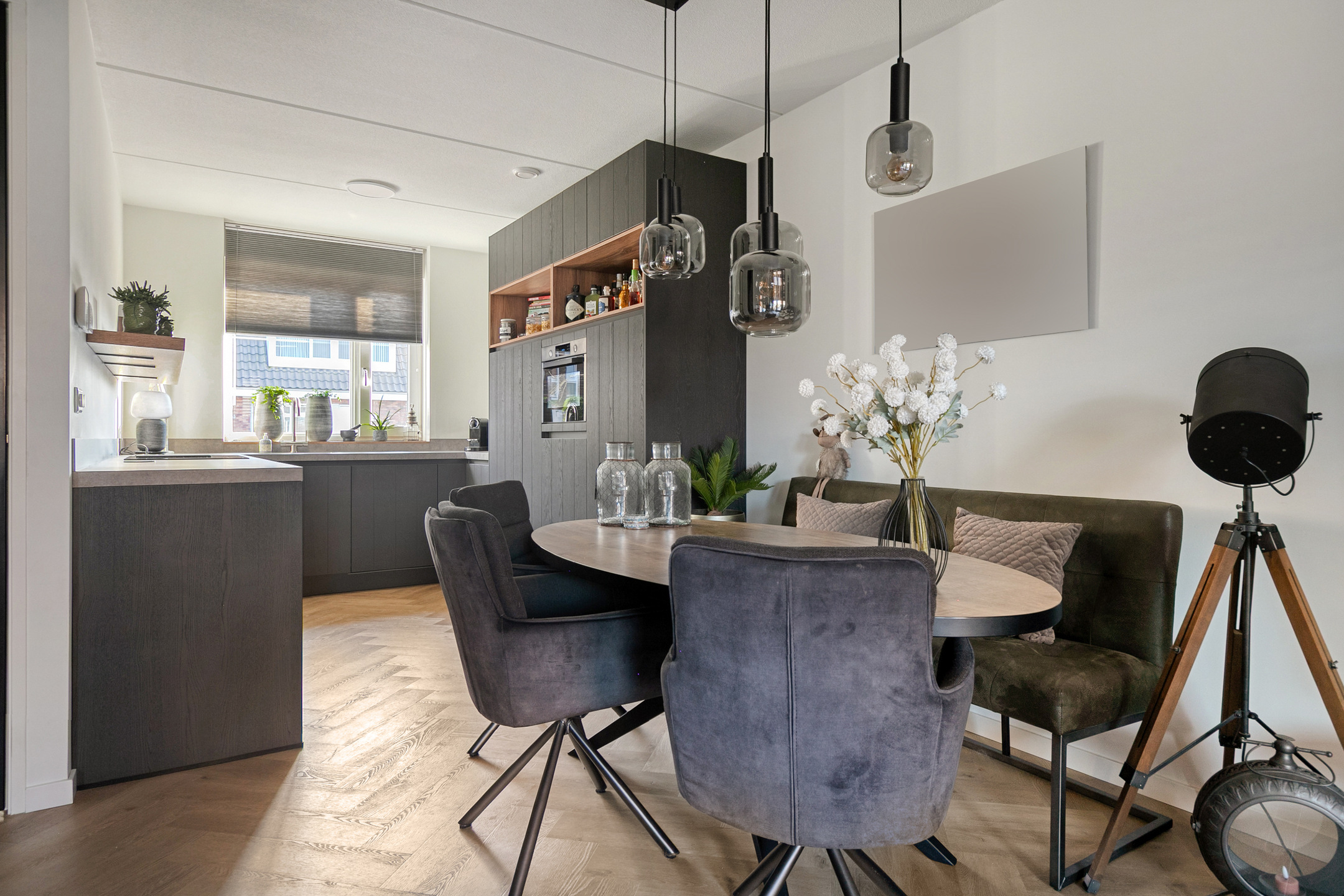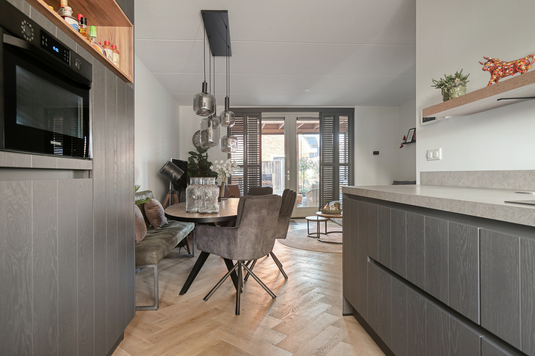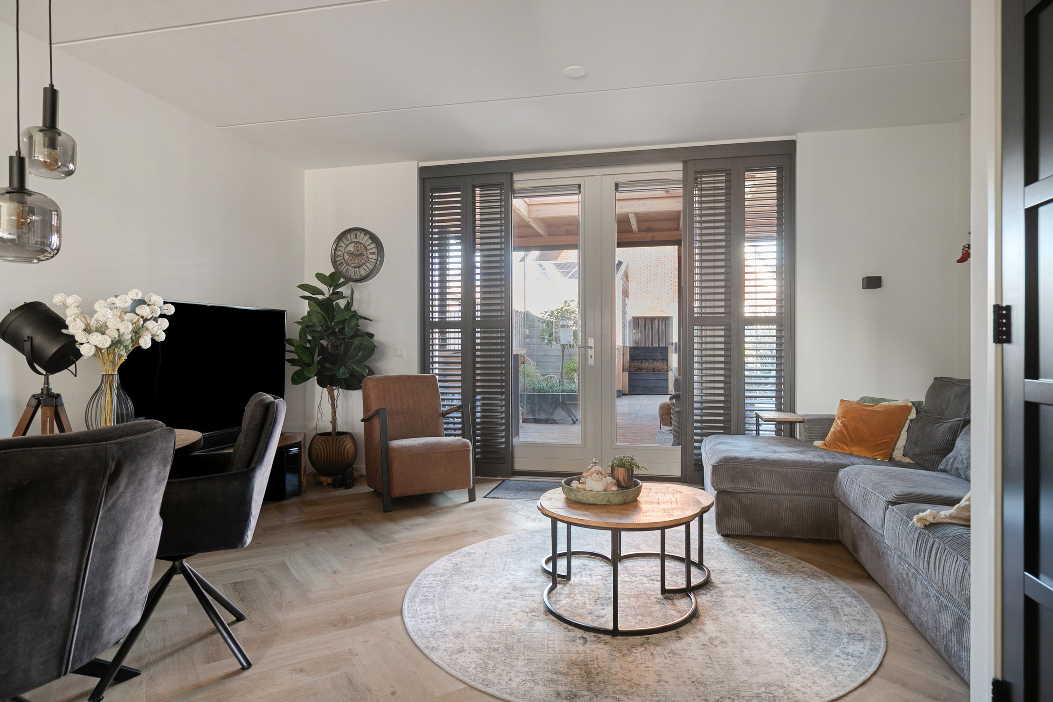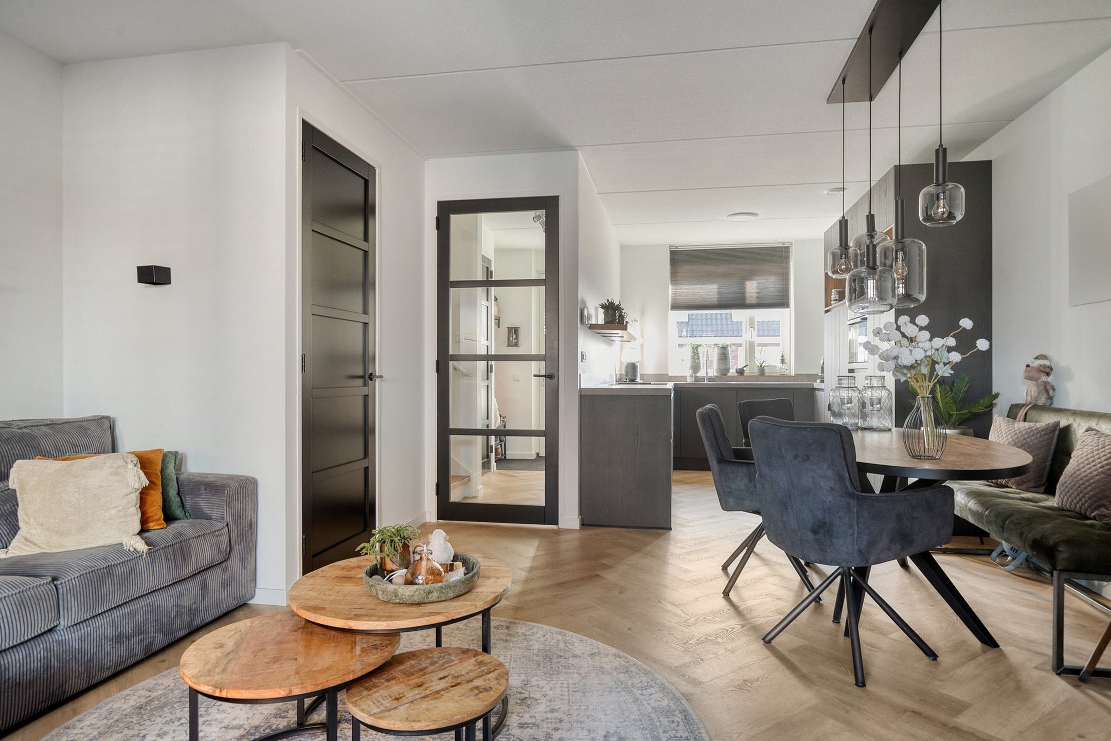 De sfeervolle woonkamer is tuingericht en staat via de openslaande deuren in directe verbinding met de tuin. In het midden van de woonkamer is ruimte voor een gezellige eethoek, waarbij je contact houdt met zowel de zithoek als de keuken, ideaal tijdens het koken.