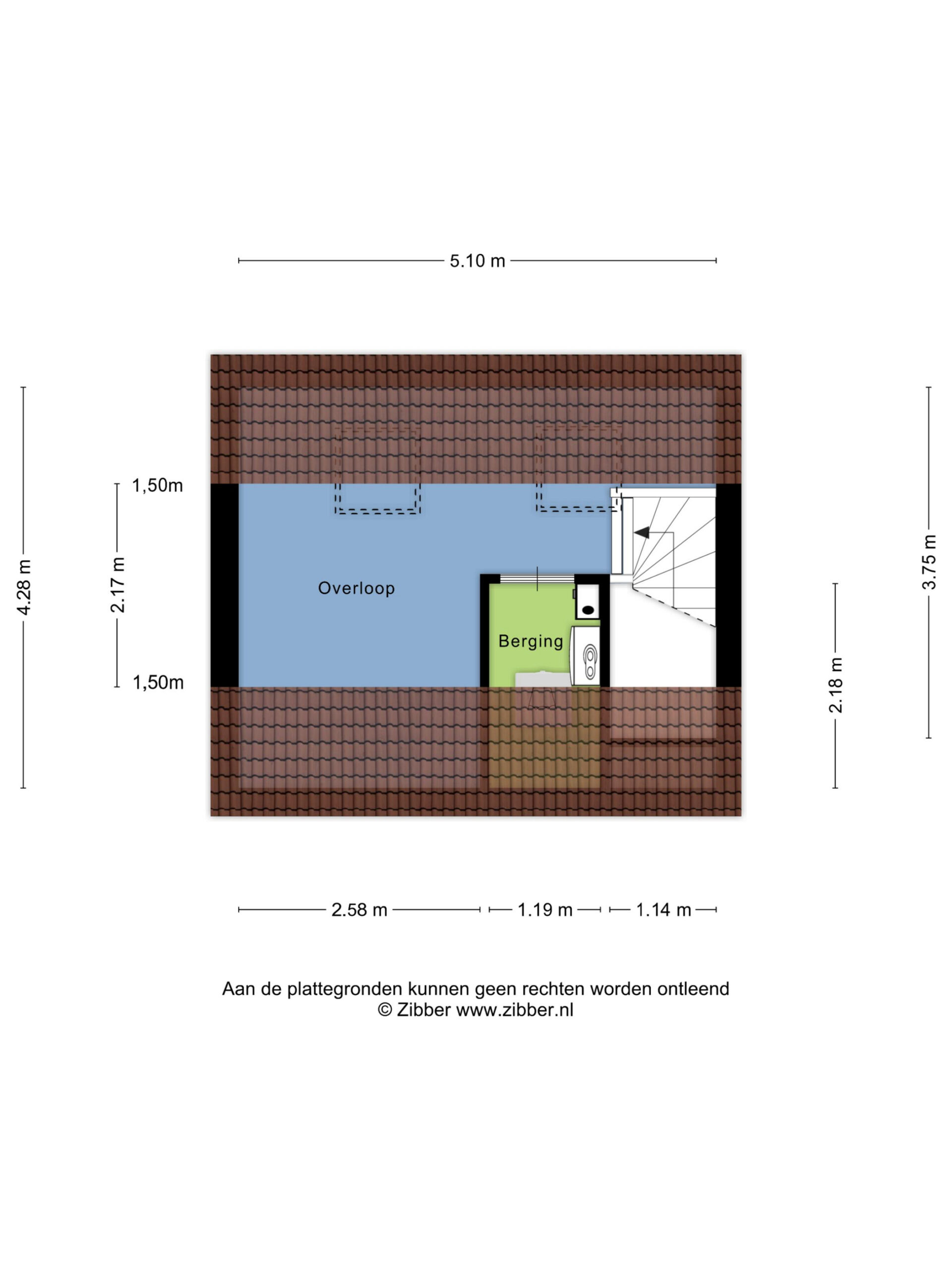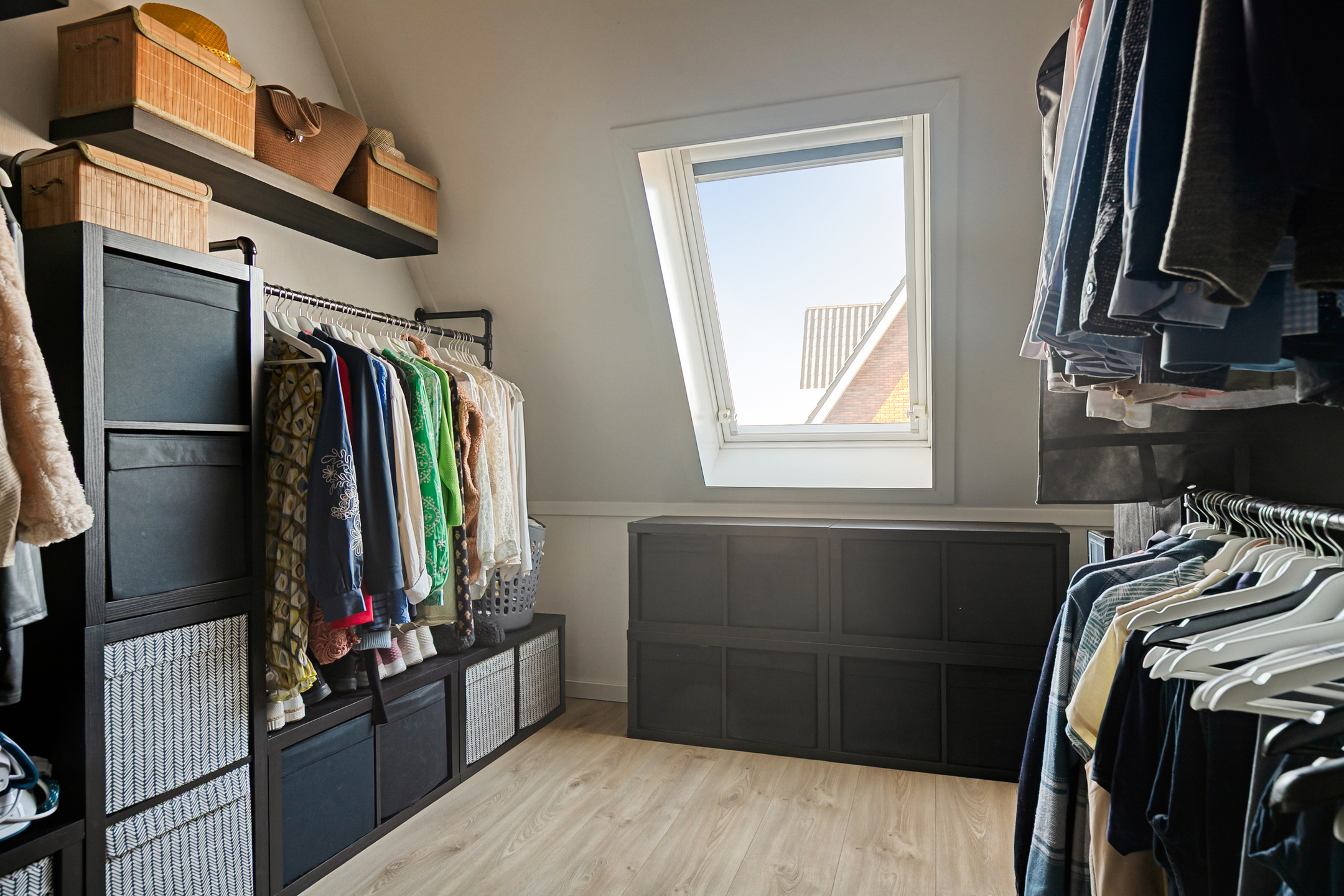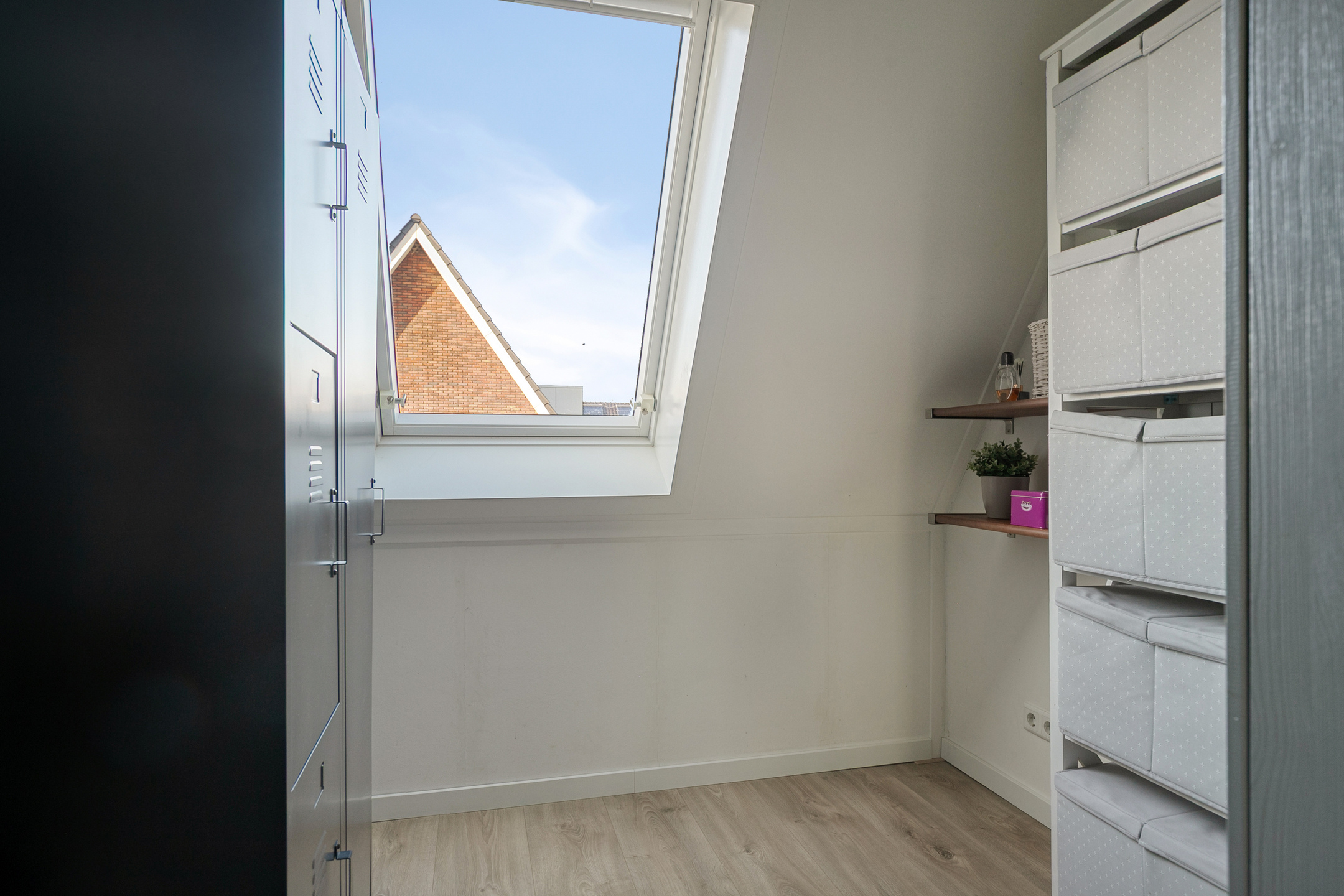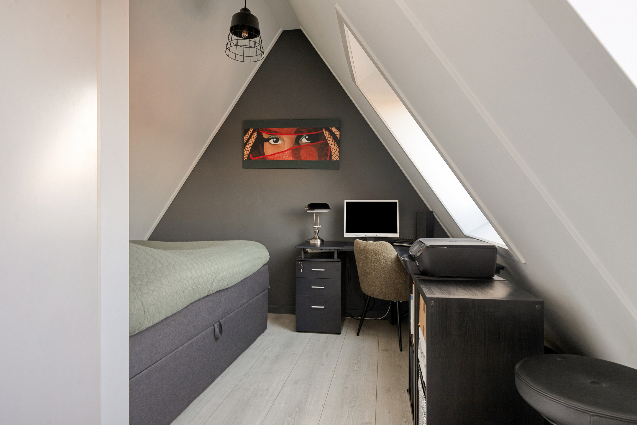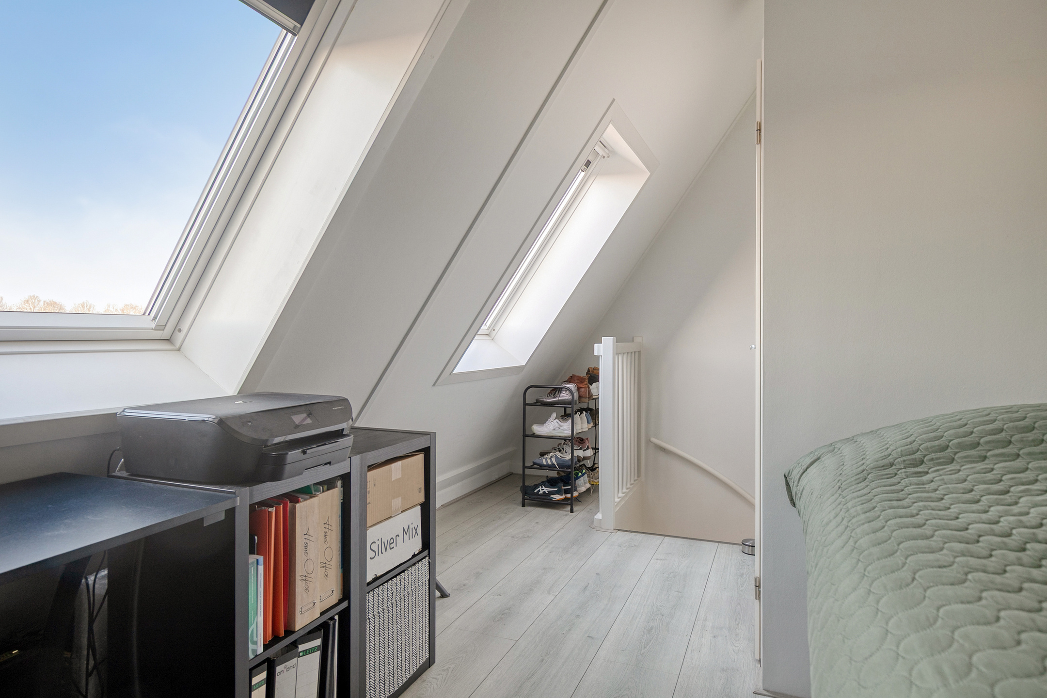 Via de vaste trap bereik je de tweede verdieping. Deze ruimte beschikt over twee dakramen die zorgen voor veel daglicht. Hier is een kamer gerealiseerd met de aansluitingen voor de wasmachine, de cv-installatie en de mechanische ventilatie, netjes weggewerkt. De resterende ruimte is uitstekend te gebruiken als logeer-, werk- of hobbyruimte.