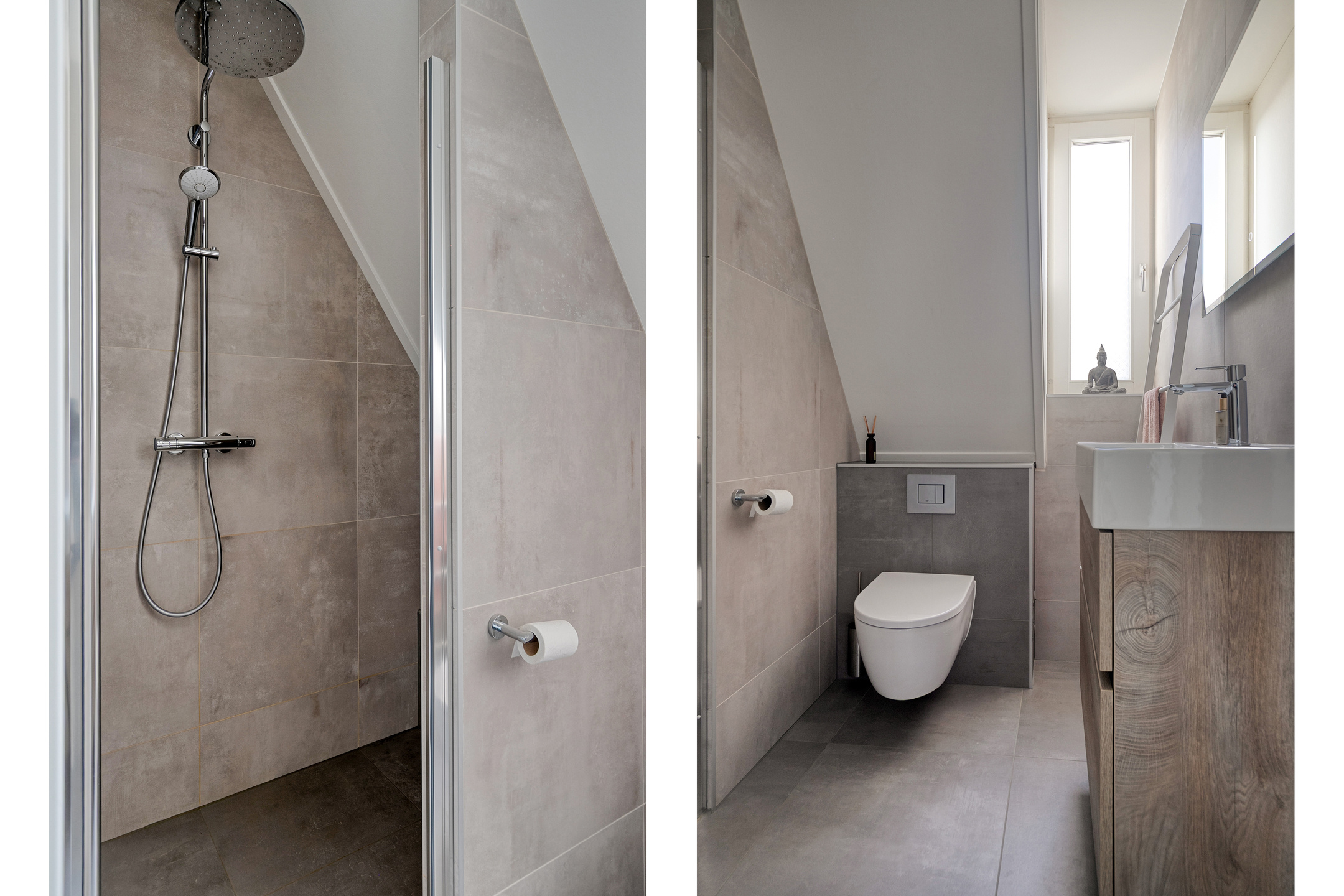 De vernieuwde badkamer is volledig betegeld in een lichte grijstint en beschikt over een brede wastafel met meubel, een zwevend toilet en een inloopdouche met regen- en handdouche. Een nis in de douche biedt praktische opbergruimte voor douchespullen.