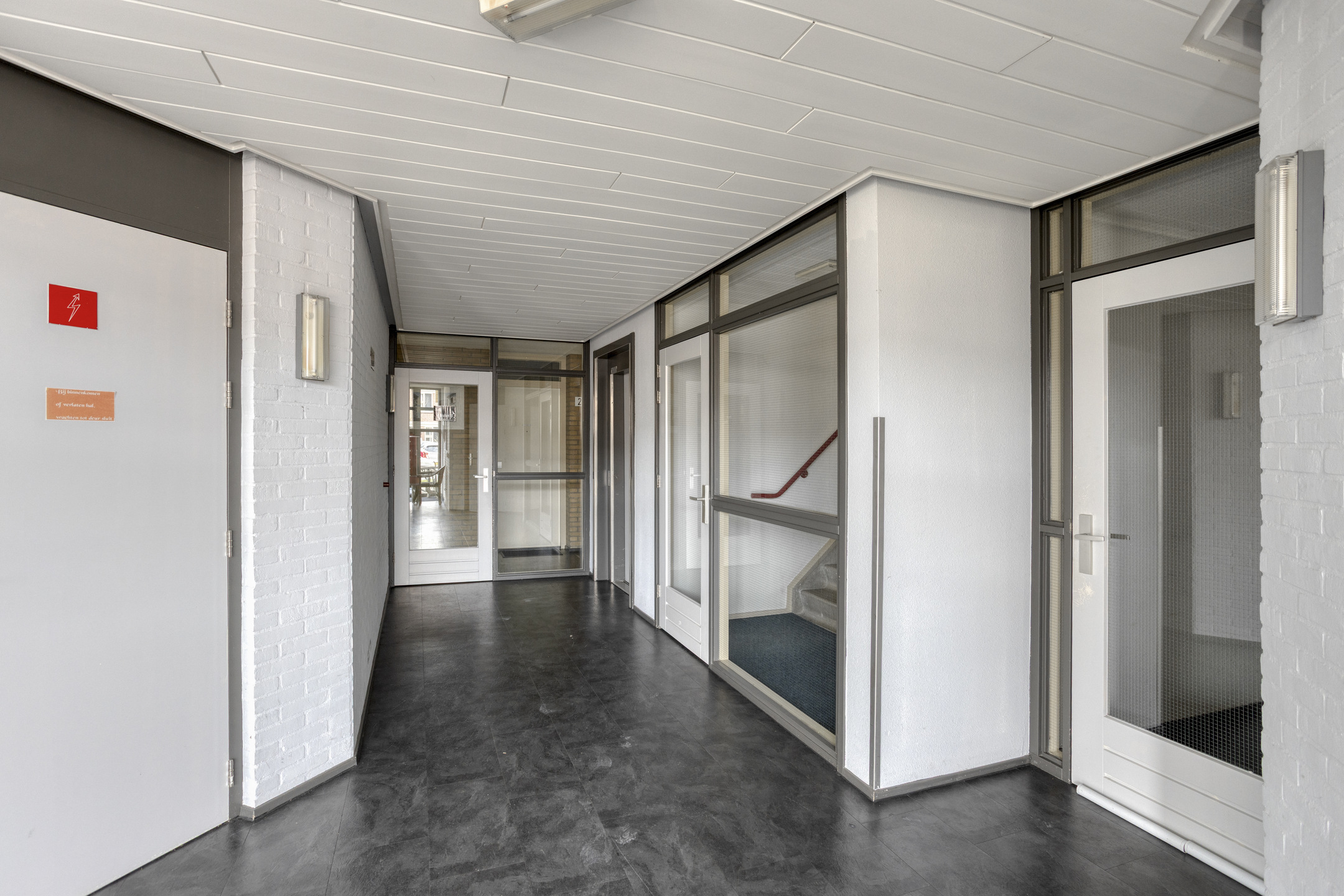 Centrale hal met postvakken en bellentableau. Toegang tot de lift, het trappenhuis, de privébergingen en de begane grond appartementen.