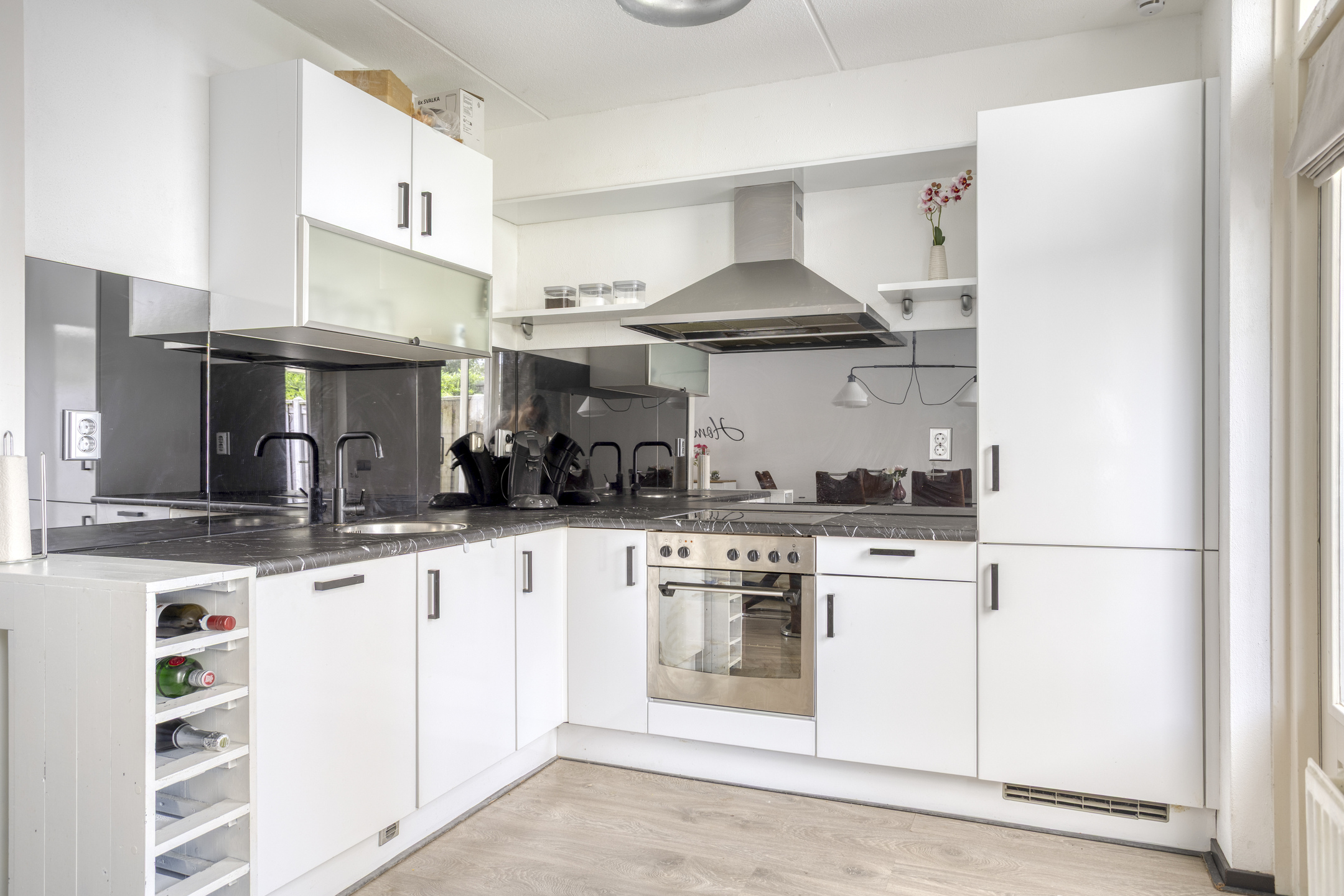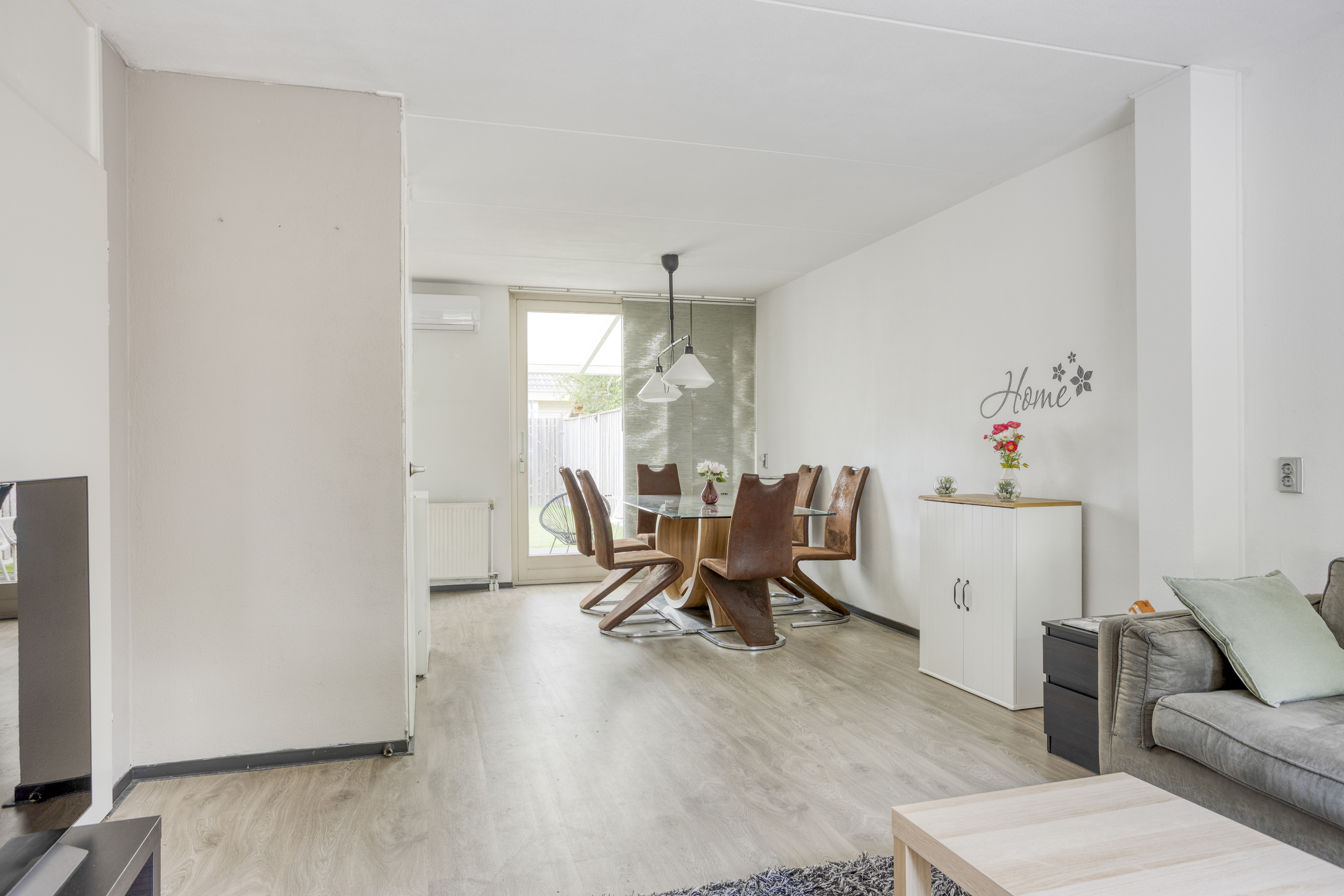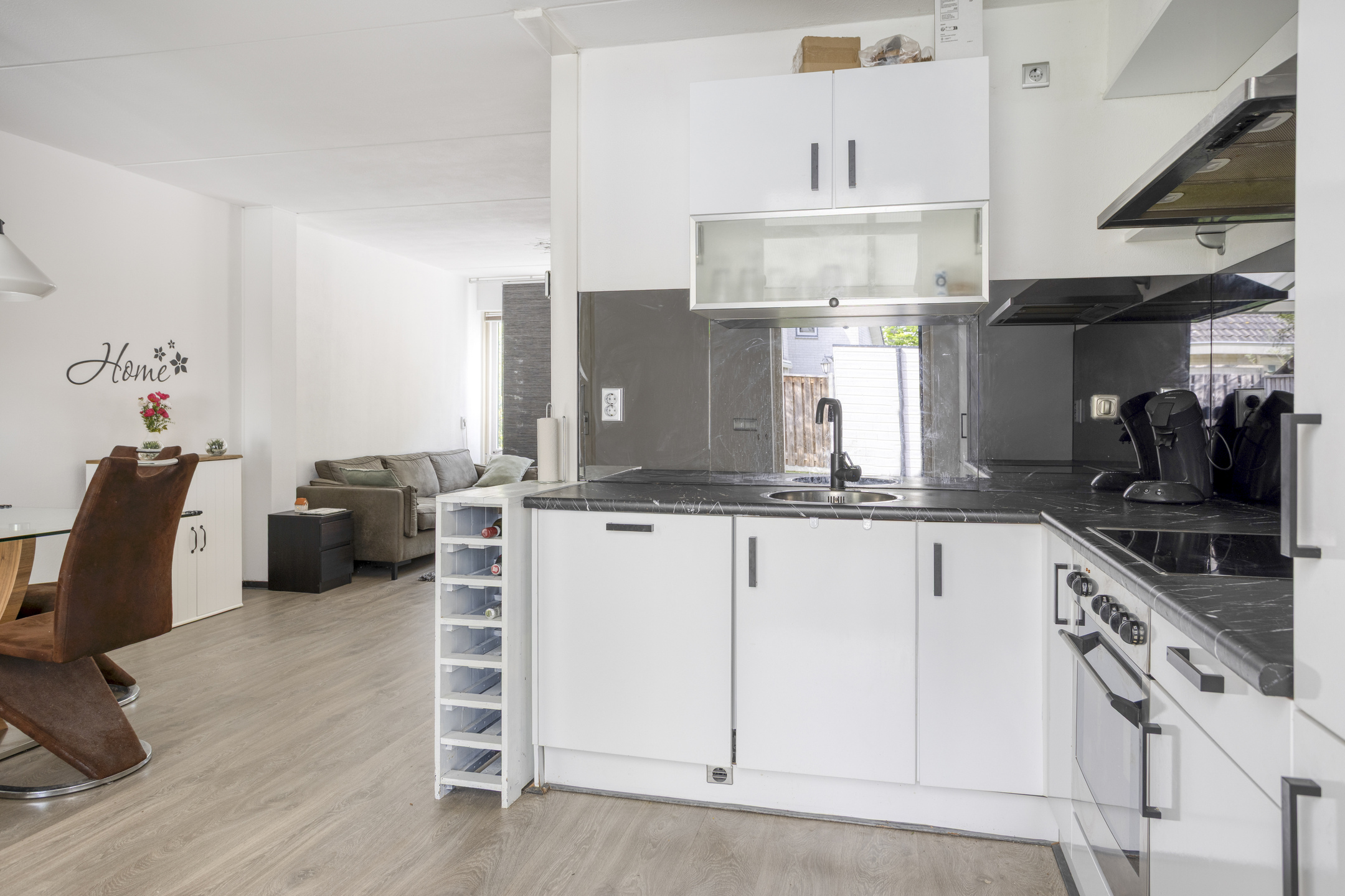 Binnenkomst in de hal met de garderobe, de meterkast en de toegang tot de woonkamer. De woonkamer is straatgericht en beschikt over airconditioning (zowel verwarmen als koelen), een praktische trapkast, toegang tot de 2e hal en een lichte laminaatvloer, die tot in de eethoek en de keuken is doorgelegd. Ter plaatse van de eethoek heb je de ruimte om een grote eettafel neer te zetten en kijk je uit over de achtertuin door de schuifpui. De keuken, die in open verbinding met de eethoek staat, is in een hoekopstelling uitgevoerd. De kleurstelling is tijdloos en de inbouwapparatuur betreft een koel-vriescombinatie, een oven, een 4-pits keramische kookplaat, een RVS-afzuigschouw en een vaatwasser (2025 vervangen). Je treft hier verder een deur naar de achtertuin. In de 2e hal tref je de trapopgang naar de verdieping en de in 2025 gerenoveerde toiletruimte, die is voorzien van grijze vloer- en wandtegels, een zwevend toilet en een fonteintje.