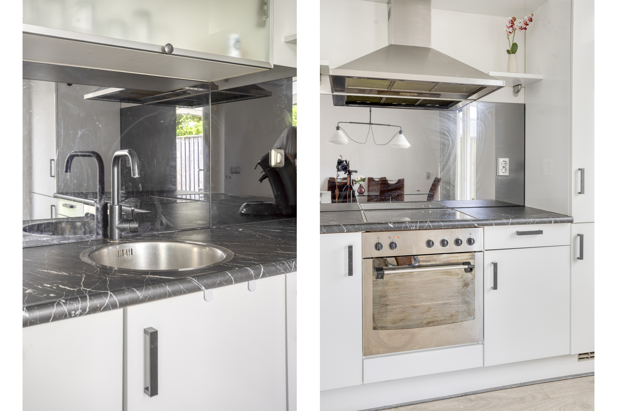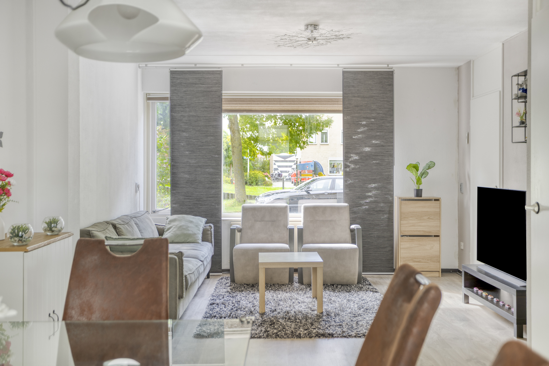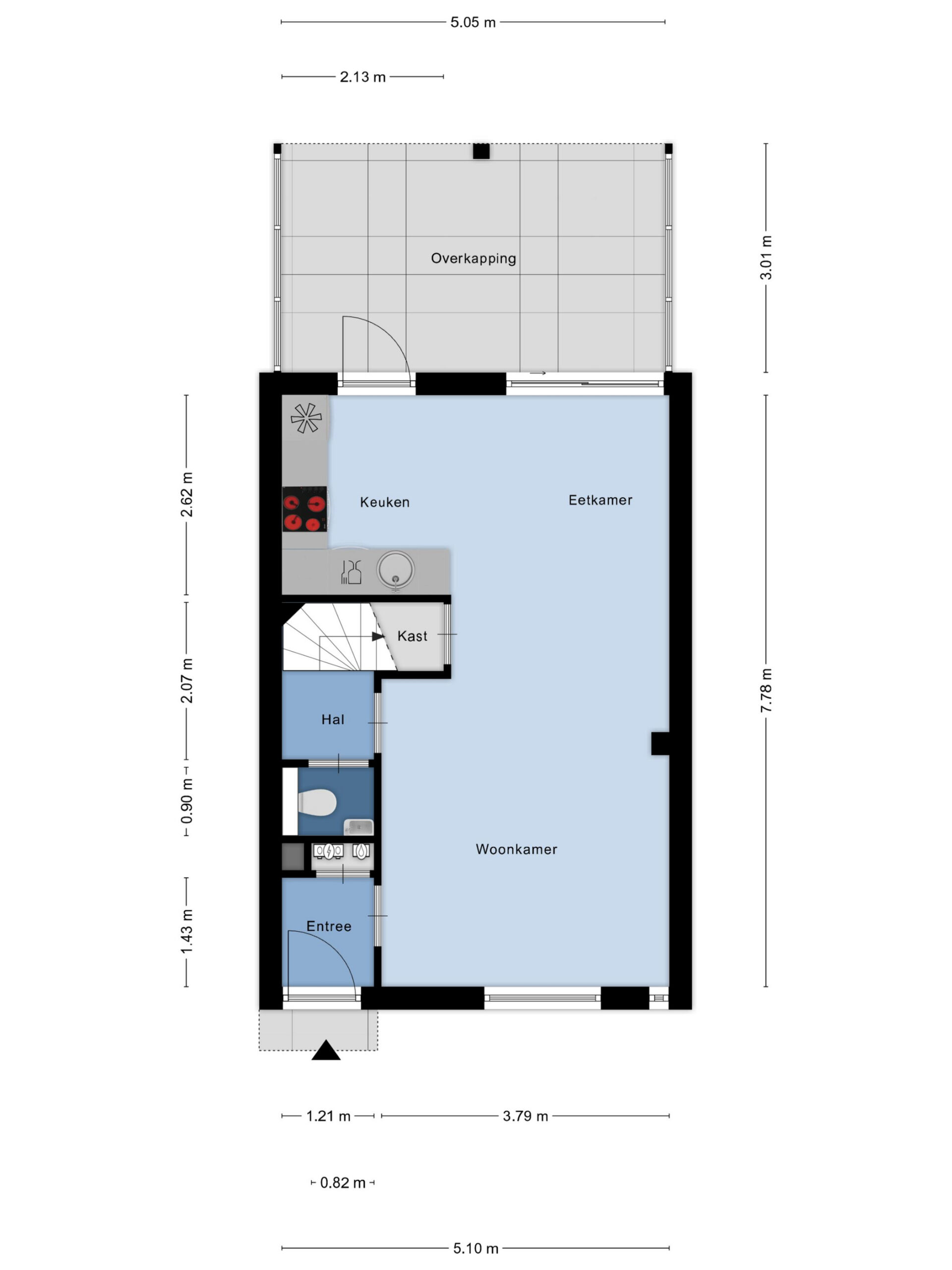 Binnenkomst in de hal met de garderobe, de meterkast en de toegang tot de woonkamer. De woonkamer is straatgericht en beschikt over airconditioning (zowel verwarmen als koelen), een praktische trapkast, toegang tot de 2e hal en een lichte laminaatvloer, die tot in de eethoek en de keuken is doorgelegd. Ter plaatse van de eethoek heb je de ruimte om een grote eettafel neer te zetten en kijk je uit over de achtertuin door de schuifpui. De keuken, die in open verbinding met de eethoek staat, is in een hoekopstelling uitgevoerd. De kleurstelling is tijdloos en de inbouwapparatuur betreft een koel-vriescombinatie, een oven, een 4-pits keramische kookplaat, een RVS-afzuigschouw en een vaatwasser (2025 vervangen). Je treft hier verder een deur naar de achtertuin. In de 2e hal tref je de trapopgang naar de verdieping en de in 2025 gerenoveerde toiletruimte, die is voorzien van grijze vloer- en wandtegels, een zwevend toilet en een fonteintje.