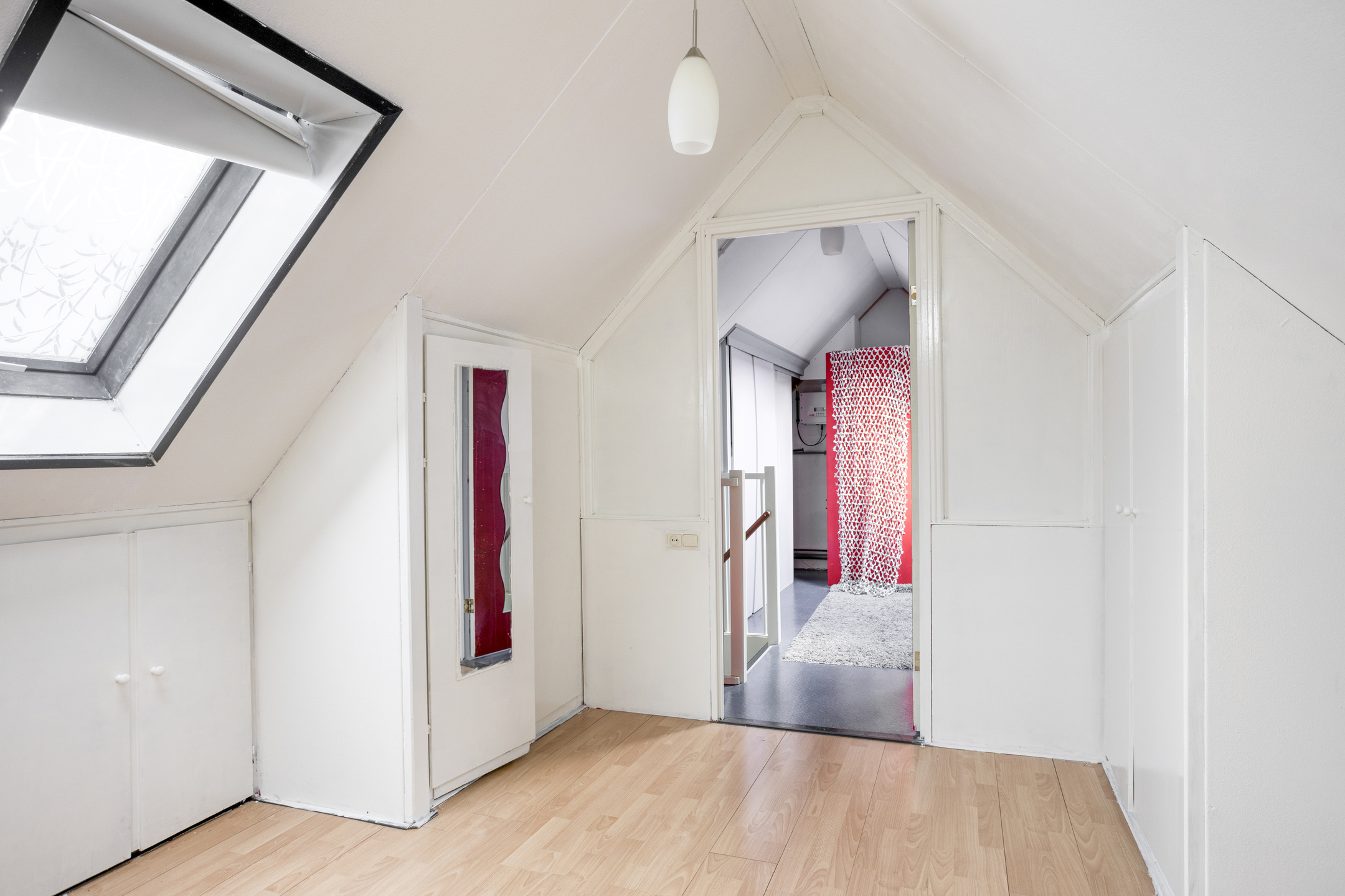 Neem de vaste trap en je bereikt de voorzolder van de 2e verdieping. Hier heb je veel extra bergruimte tot je beschikking dankzij de vaste kasten! Verder tref je hier de opstelling voor de cv-installatie, de aansluitingen voor de wasapparatuur, de omvormer voor de zonnepanelen, een dakraam en de toegang tot de 4e kamer, die zich perfect leent om te gebruiken als bijvoorbeeld kantoor!
