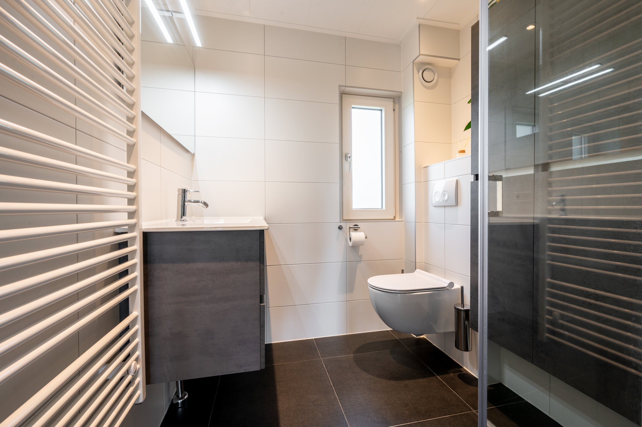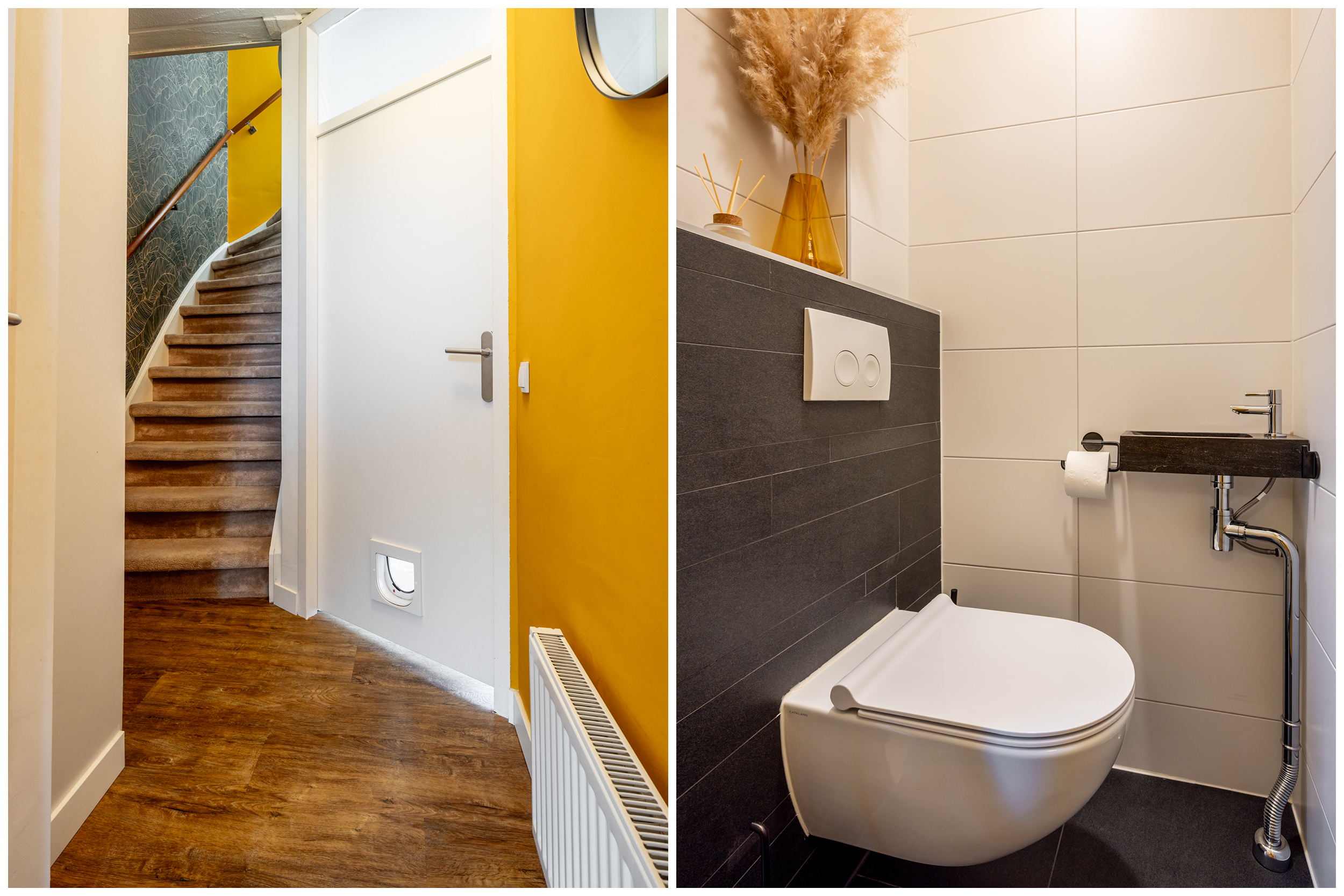 Bij binnenkomst in de hal merk je meteen hoe netjes deze woning is onderhouden en gerenoveerd dankzij de strakke afwerking. Vanuit hier heb je toegang tot de meterkast, de trapopgang, de woonkamer en het toilet. De toiletruimte is volledig betegeld in wit en antraciet, voorzien van een fonteintje en een zwevend toilet dat extra stil doorspoelt; een leuk detail!