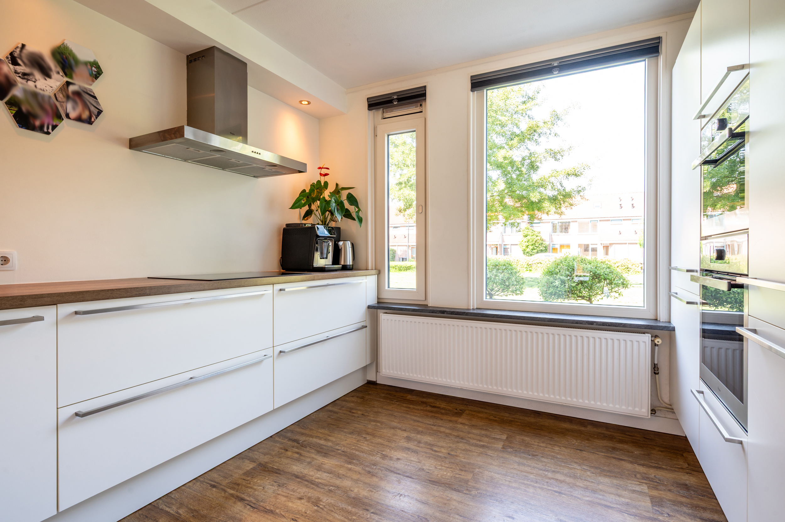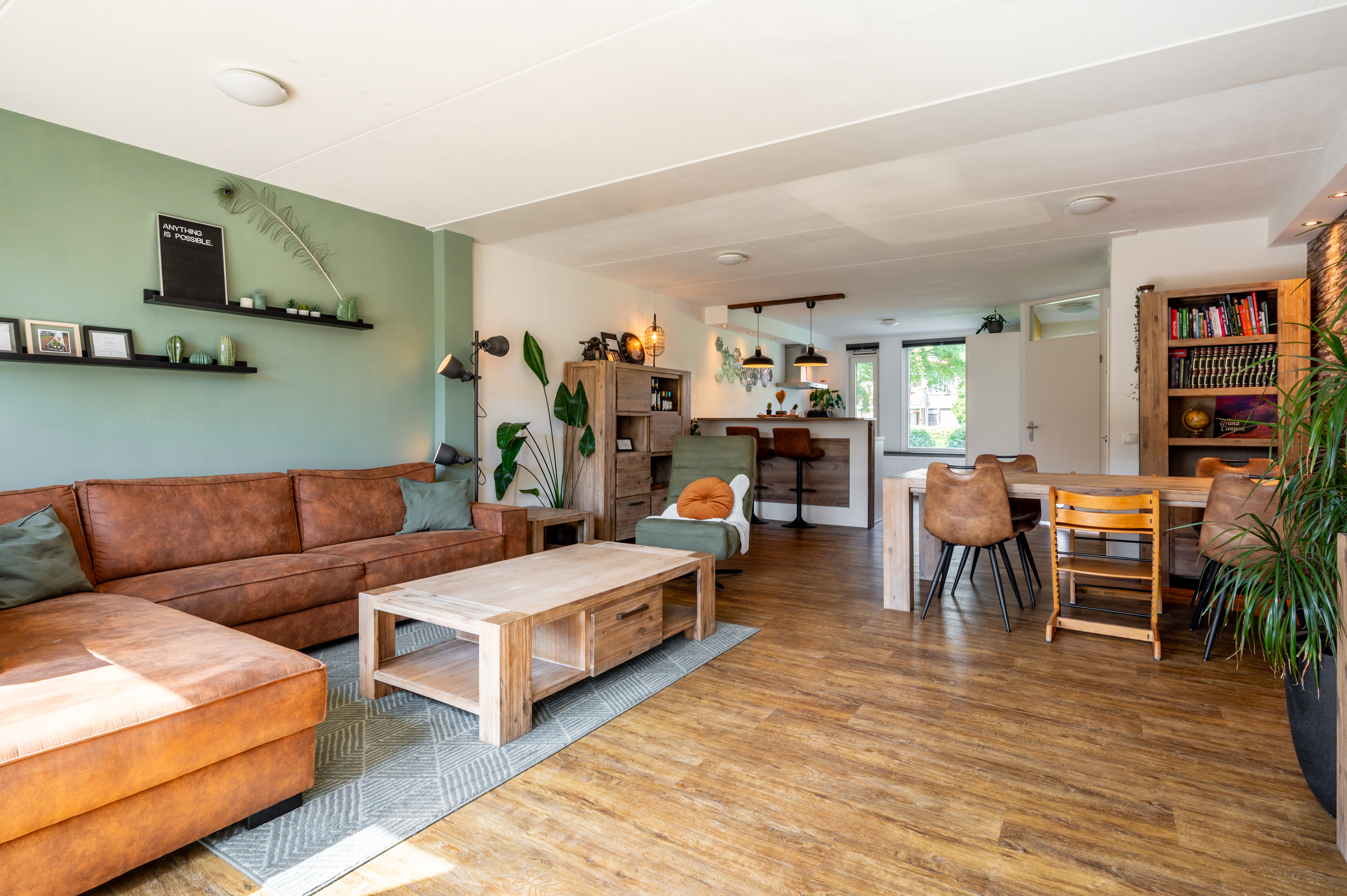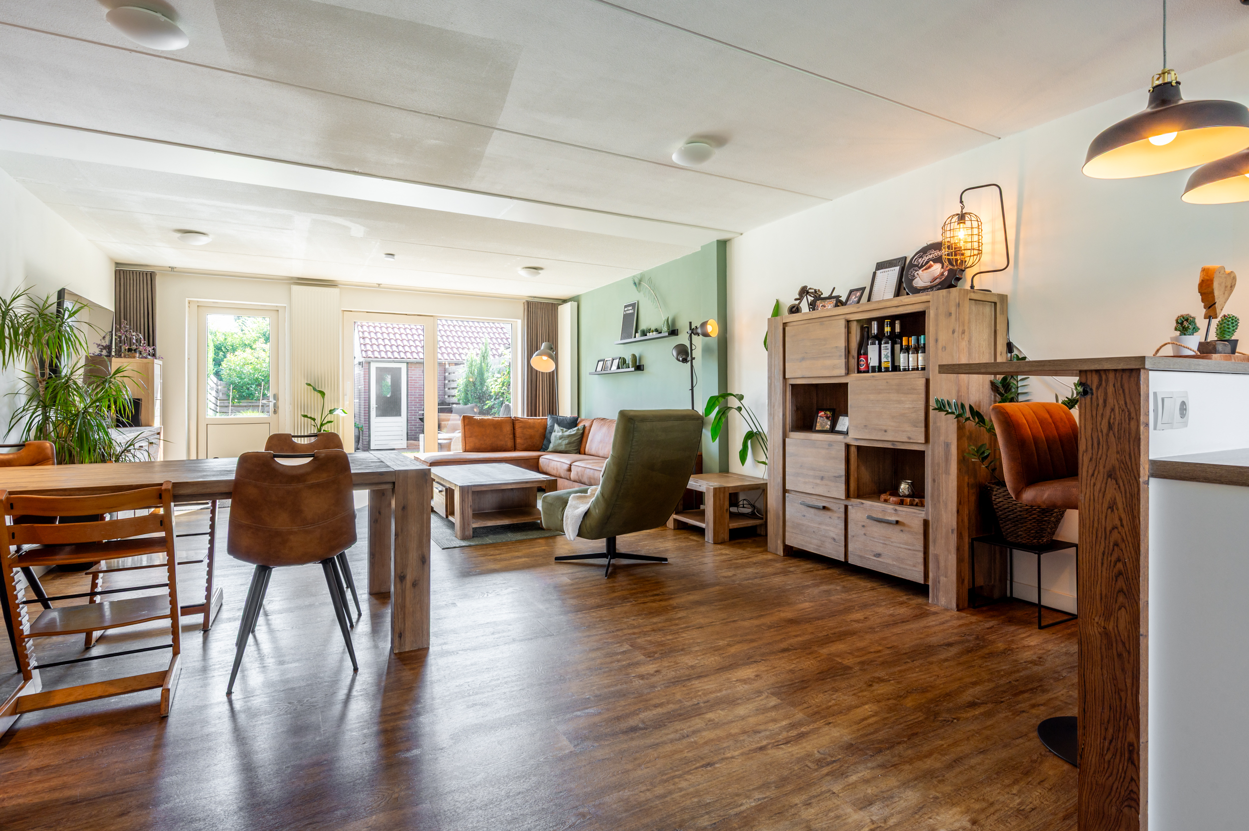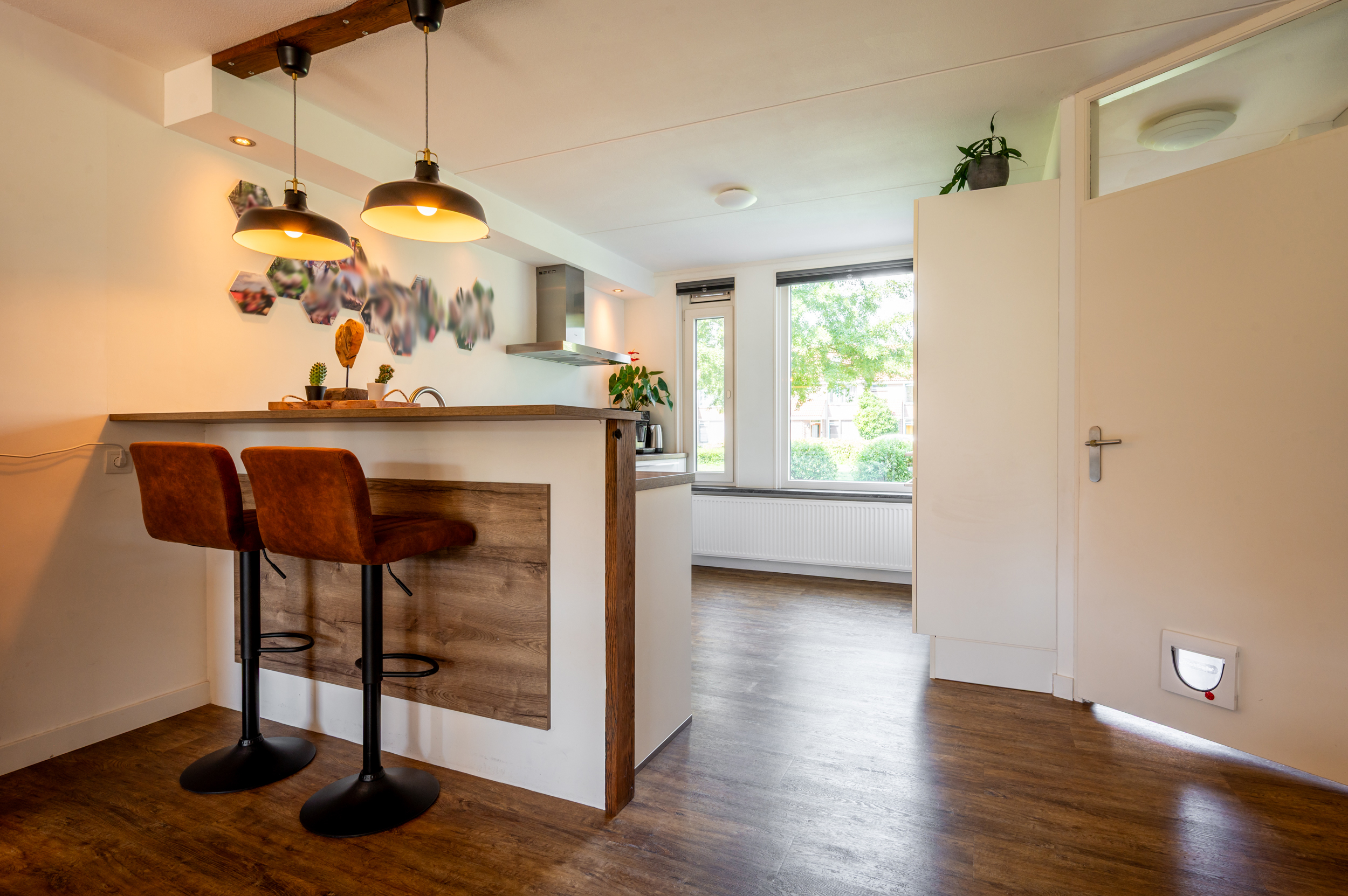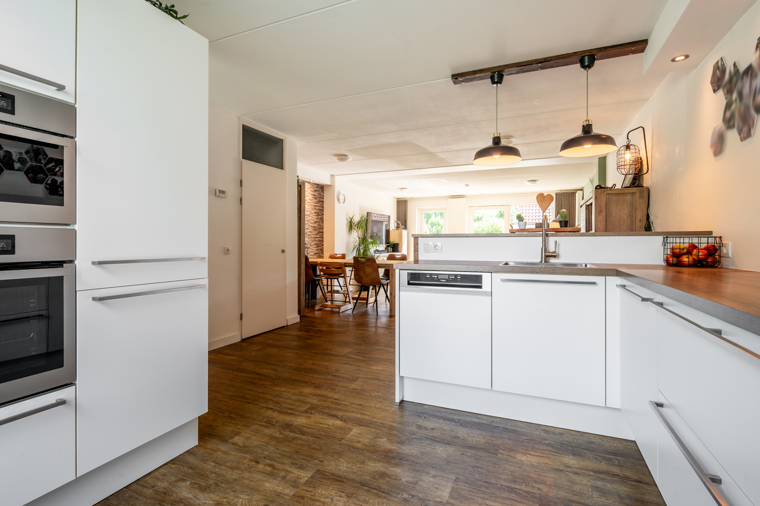 Stap de royale woonkamer binnen, die dankzij de uitbouw extra ruim is geworden. Hier plaats je met gemak een riante zithoek. De schuifpui laat veel natuurlijk licht binnen en geeft toegang tot de tuin. Liever via de loopdeur naar buiten omdat dat beter in je indeling past? Ook dat kan. Naast de woonkamer is er volop ruimte voor een eettafel, perfect om met vrienden of familie gezellig te tafelen. Extra handig is de trapkast: nu ingericht als garderobe, maar ook ideaal als voorraadkast of opbergruimte. Ook de keuken mag er zeker zijn. Deze heeft een grote kastenwand en daar tegenover een royale L-opstelling met bar, waardoor je heerlijk aansluit als iemand aan het koken is of in de ochtend rustig van je ontbijt kunt genieten. In de kastenwand vind je de koelkast, vriezer, combimagnetron en oven. Aan de andere zijde tref je de spoelbak, een 4-pits inductiekookplaat, een rvs-afzuigschouw en een vaatwasser. De combinatie van witte fronten en een houtlook werkblad sluit perfect aan bij de pvc-vloer die door de hele begane grond is gelegd.